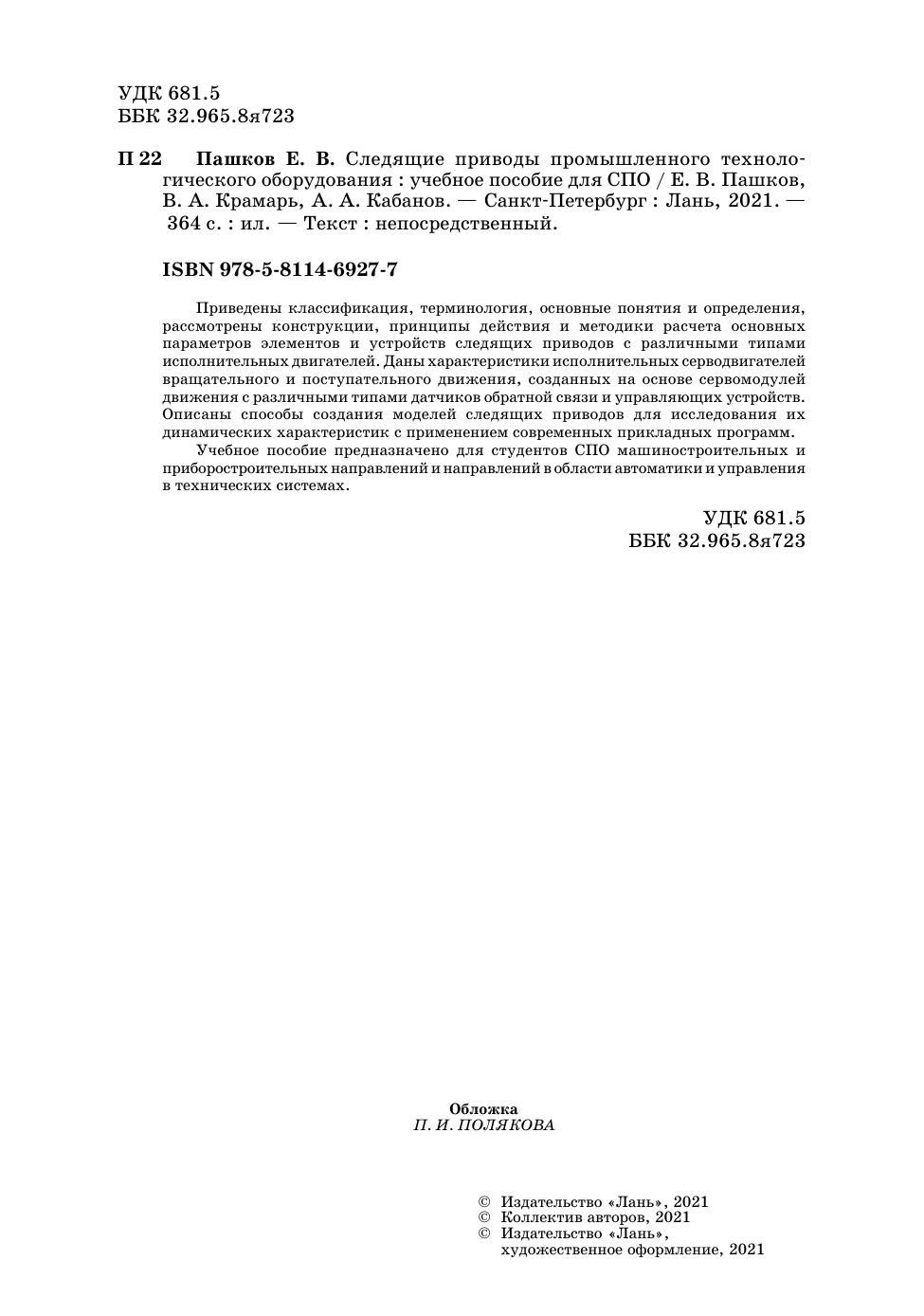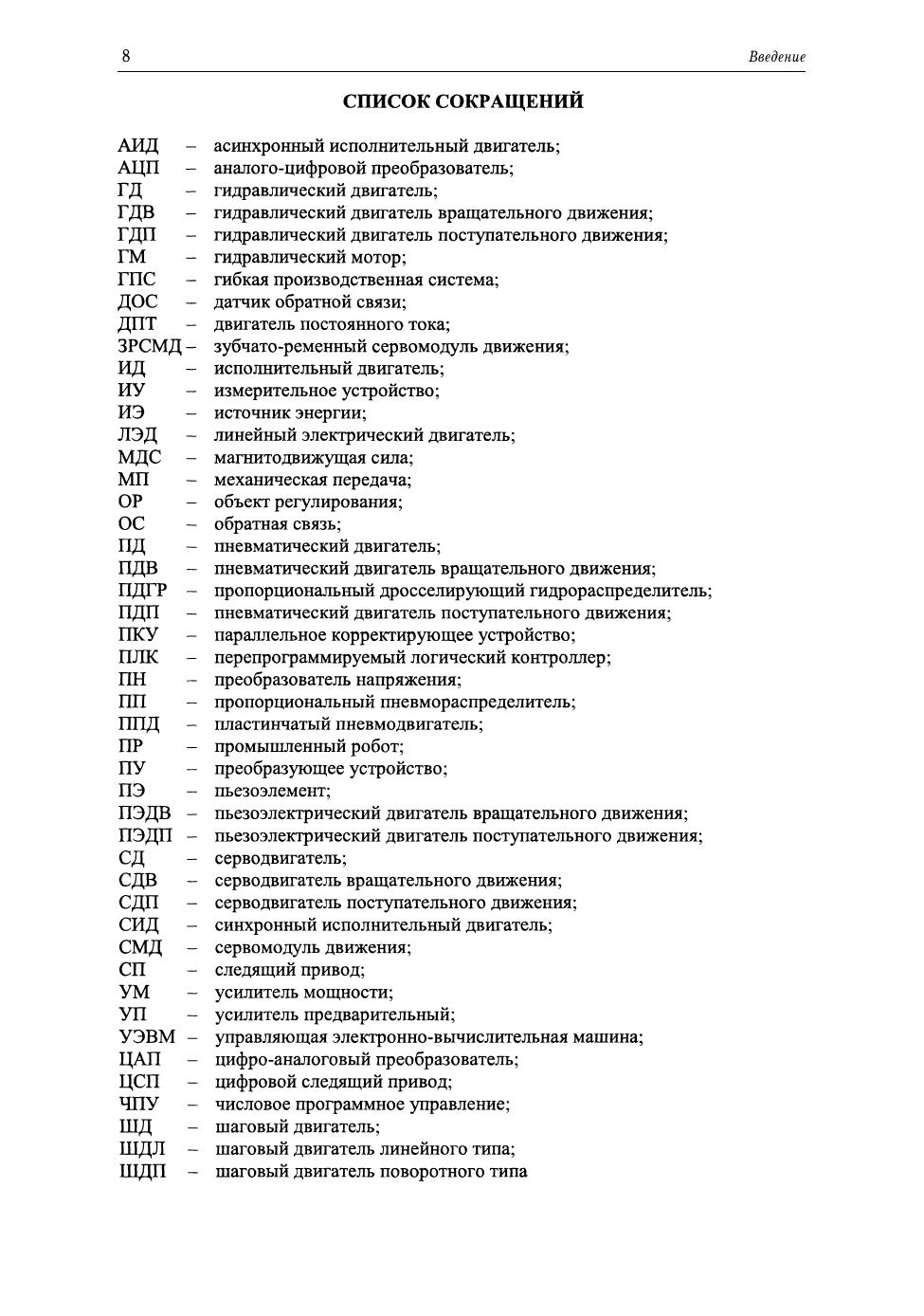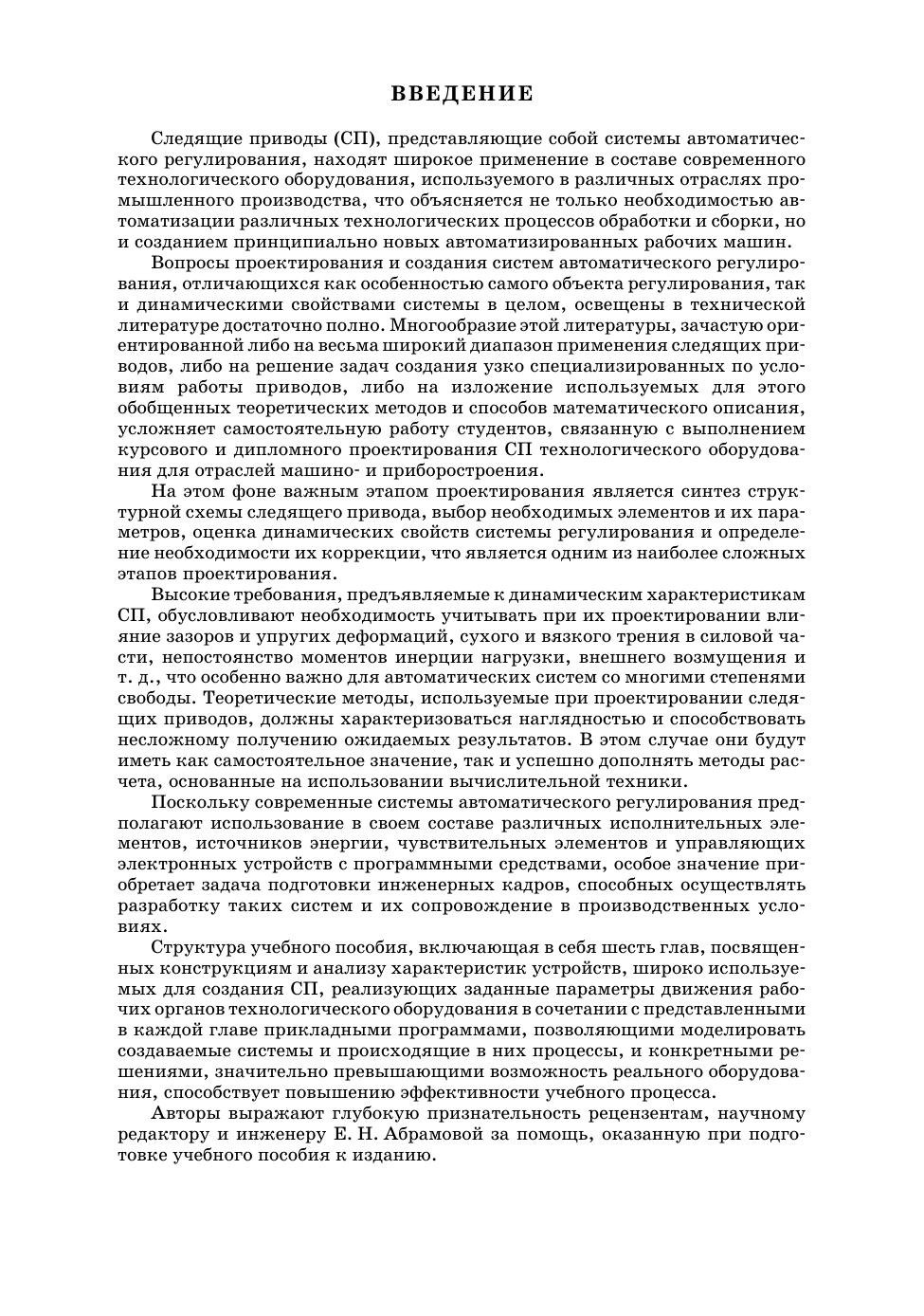 Приведены классификация, терминология, основные понятия и определения, рассмотрены конструкции, принципы действия и методики расчета основных параметров элементов и устройств следящих приводов с различными типами исполнительных двигателей. Даны характеристики исполнительных серводвигателей вращательного и поступательного движения, созданных на основе сервомодулей движения с различными типами датчиков обратной связи и управляющих устройств. Описаны способы создания моделей следящих приводов для исследования их динамических характеристик с применением современных прикладных программ.