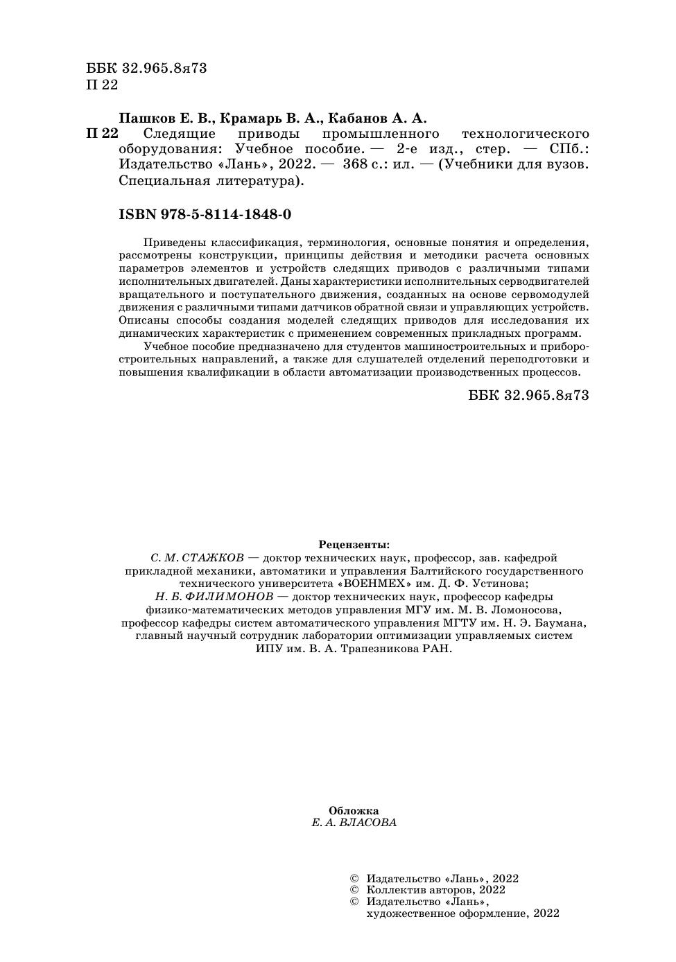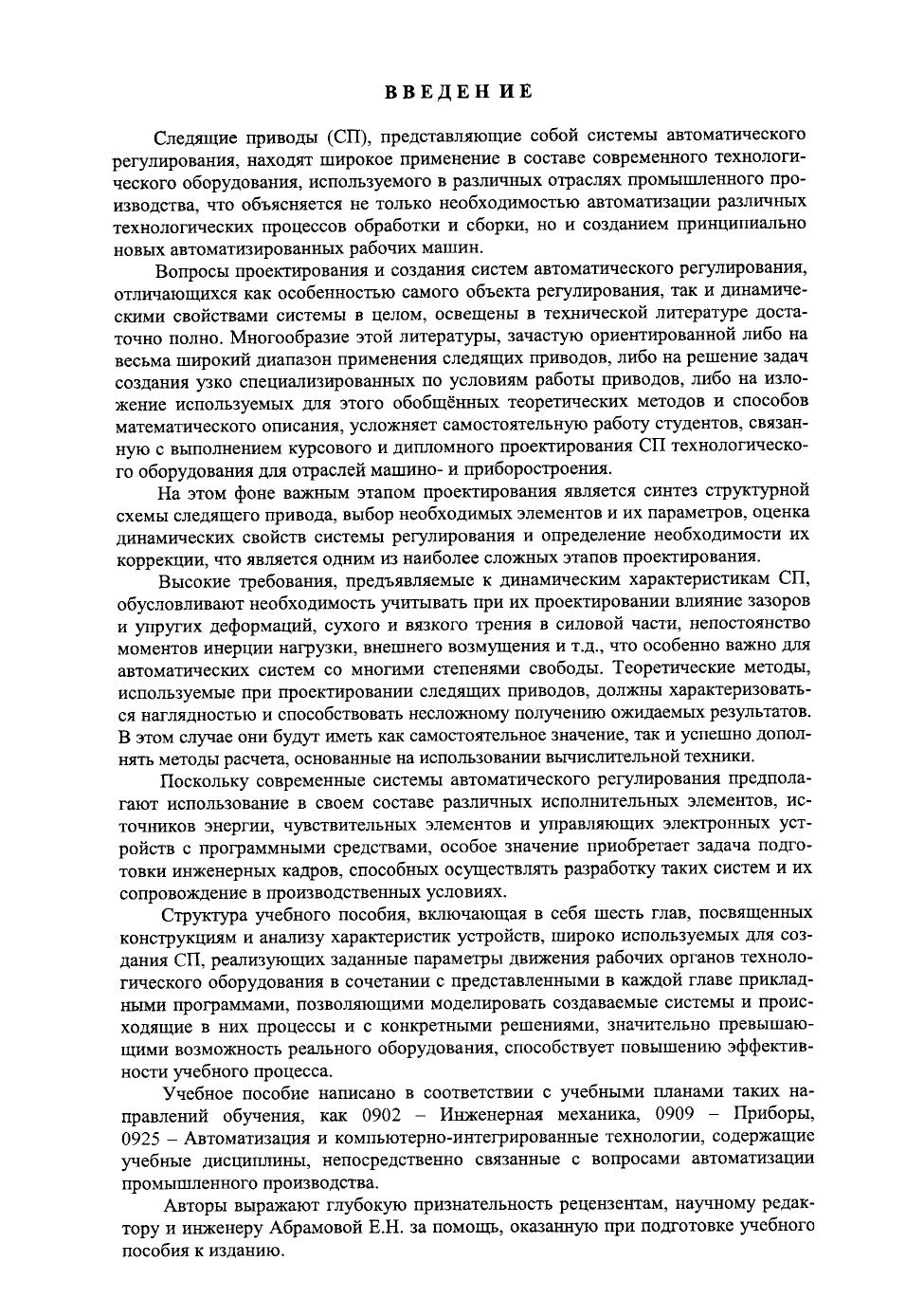Приведены классификация, терминология, основные понятия и определения, рассмотрены конструкции, принципы действия и методики расчета основных параметров элементов и устройств следящих приводов с различными типами исполнительных двигателей. Даны характеристики исполнительных серводвигателей вращательного и поступательного движения, созданных на основе сервомодулей движения с различными типами датчиков обратной связи и управляющих устройств. Описаны способы создания моделей следящих приводов для исследования их динамических характеристик с применением современных прикладных программ. Учебное пособие предназначено для студентов машиностроительных и приборо-строительных направлений, а также для слушателей отделений переподготовки и повышения квалификации в области автоматизации производственных процессов.