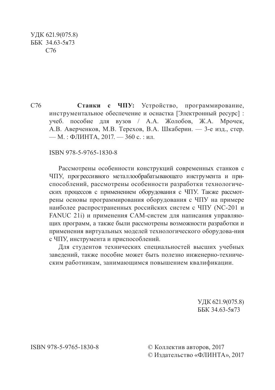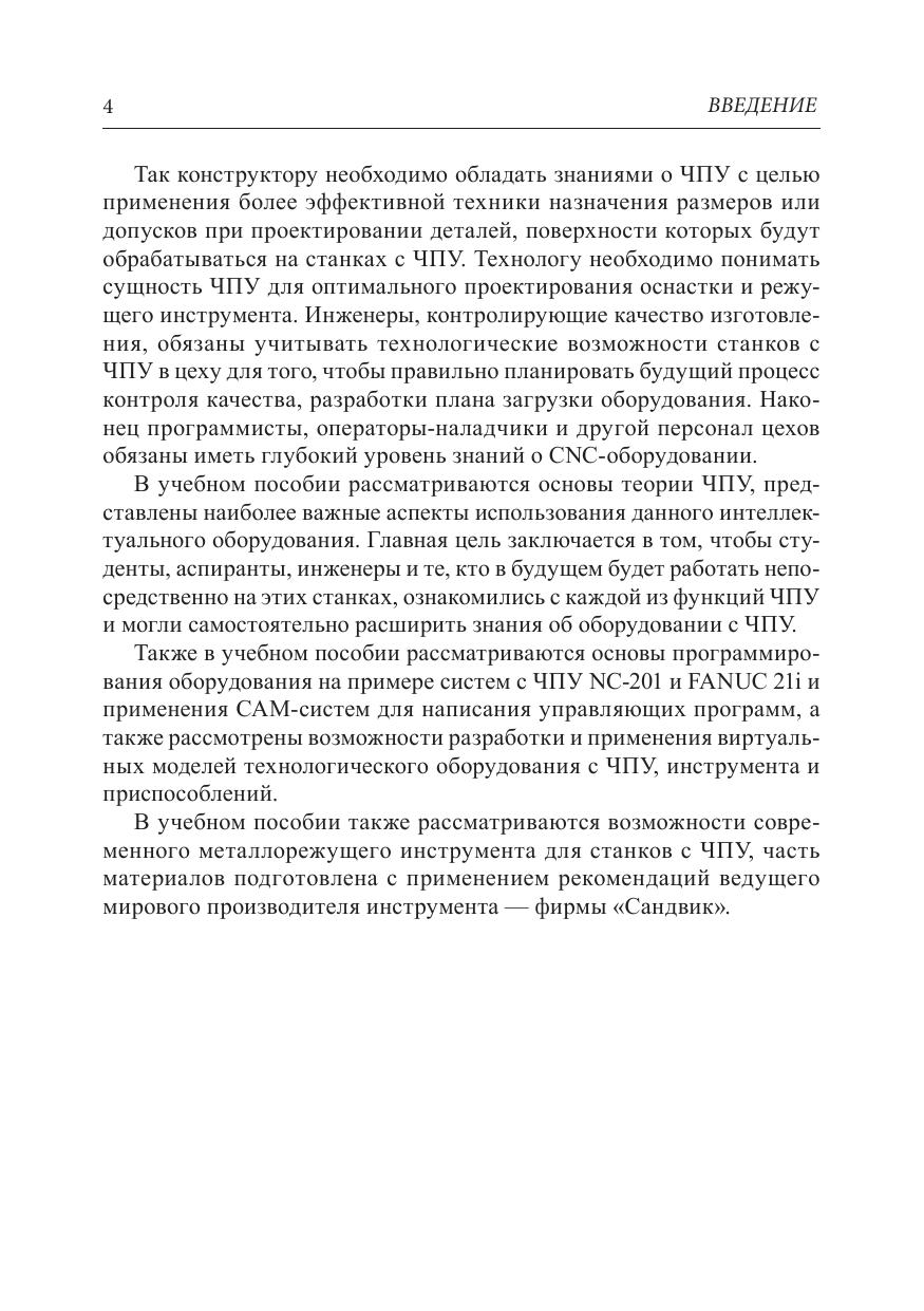 Рассмотрены особенности конструкций современных станков с ЧПУ, прогрессивного металлообрабатывающего инструмента и приспособлений, рассмотрены особенности разработки технологических процессов с применением оборудования с ЧПУ. Также рассмотрены основы программирования оборудования с ЧПУ на примере наиболее распространенных российских систем с ЧПУ (NC-201 и FANUC 21i) и применения CAM-систем для написания управляющих программ, а также были рассмотрены возможности разработки и применения виртуальных моделей технологического оборудования с ЧПУ, инструмента и приспособлений.