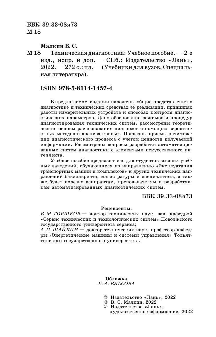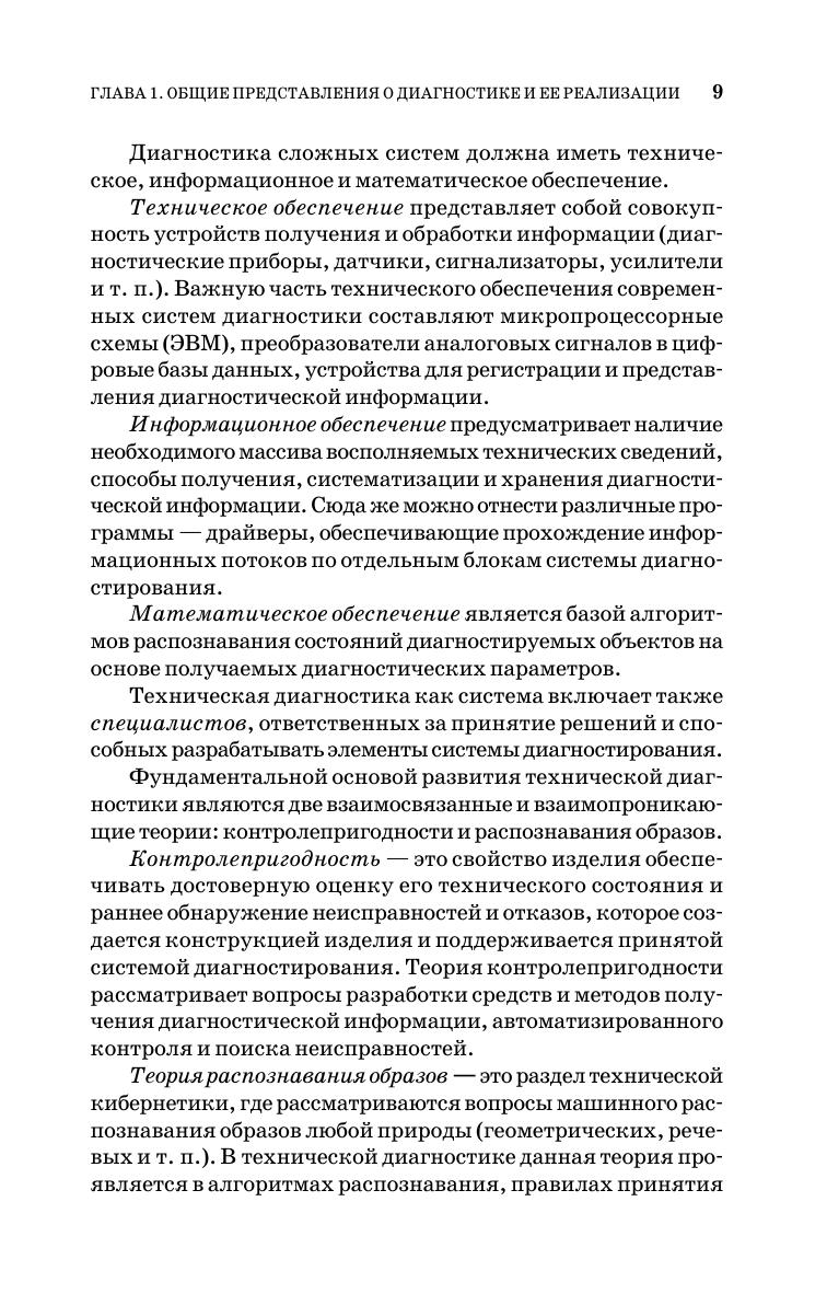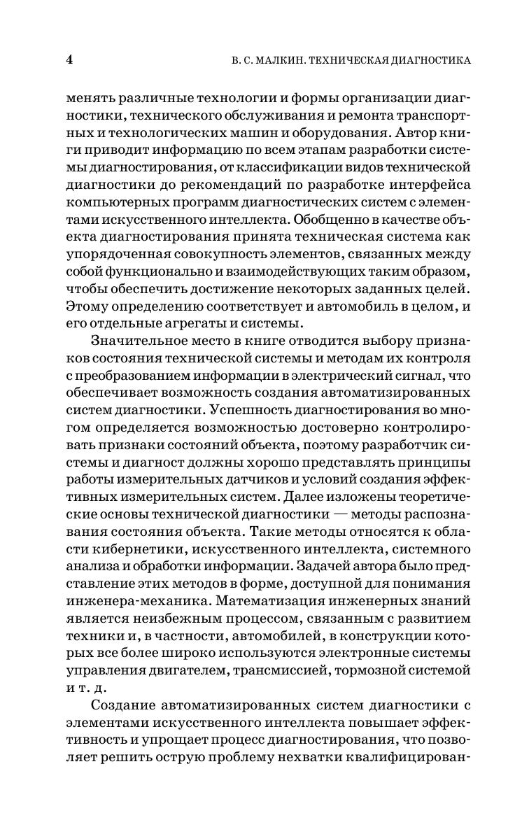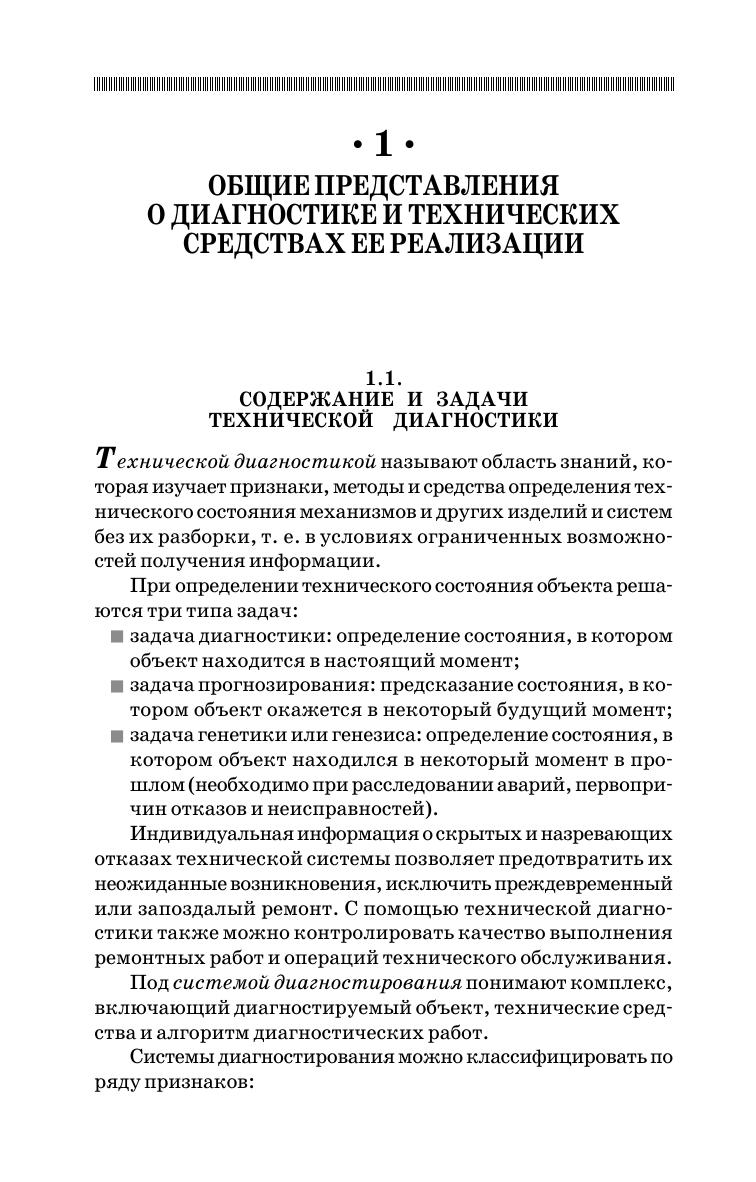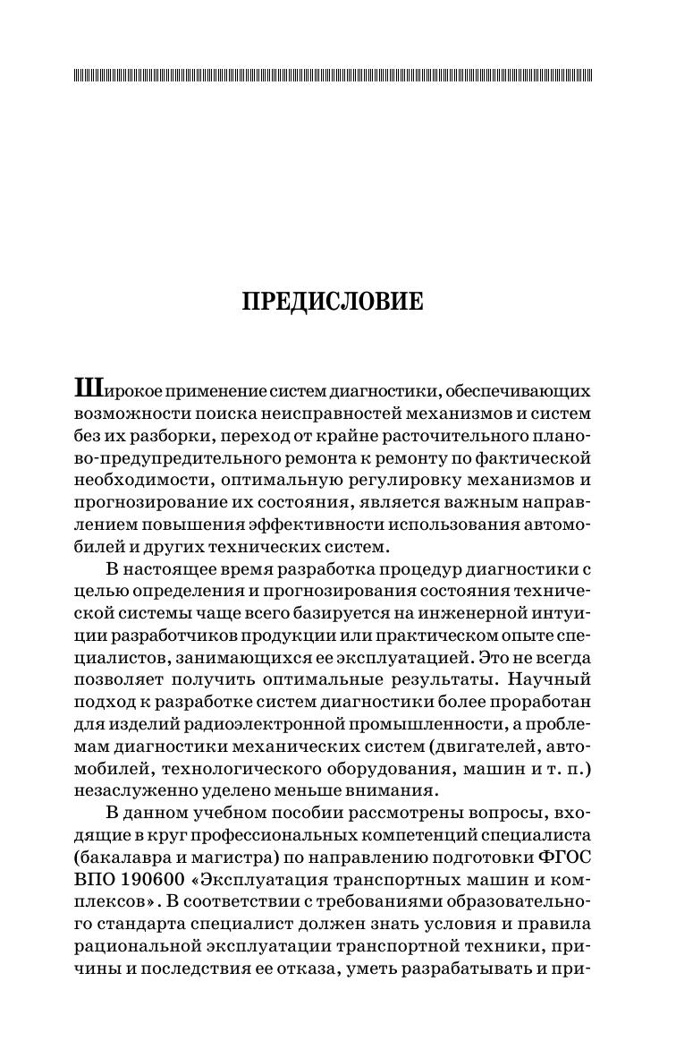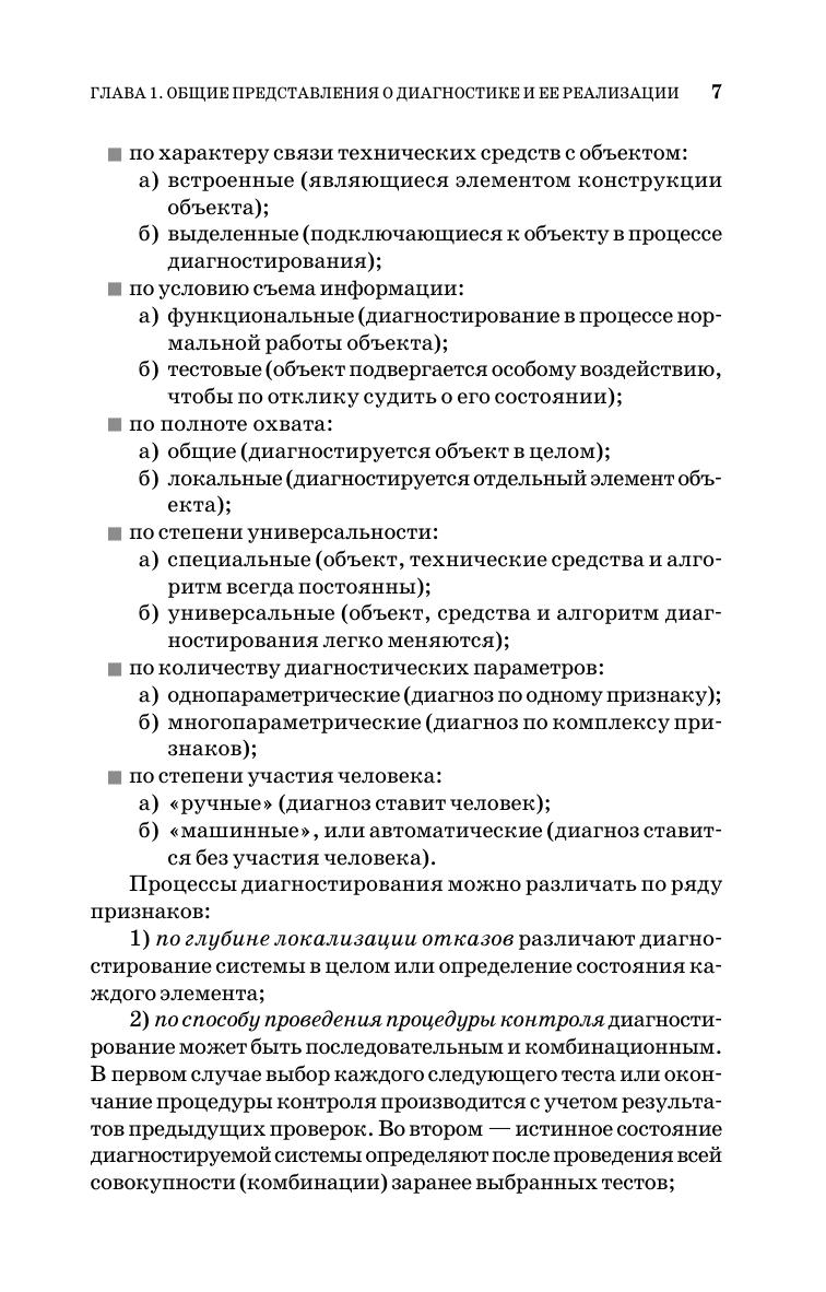В предлагаемом издании изложены общие представления о диагностике и технических средствах ее реализации, принципах работы измерительных устройств и способах контроля диагностических параметров. Дано обоснование режимов и процедур диагностирования технических систем, рассмотрены теоретические основы распознавания диагнозов с помощью вероятностных методов и анализа кривых. Показаны приемы оптимизации диагностического процесса с учетом ценности получаемой информации. Рассмотрены вопросы разработки автоматизированных систем диагностирования с элементами искусственного интеллекта. Учебное пособие предназначено для студентов высших учебных заведений, обучающихся по направлению «Эксплуатация транспортных машин и комплексов» и других технических направлений бакалавриата, магистратуры и специалитета, а также будет полезна аспирантам, преподавателям и разработчикам автоматизированных диагностических систем.