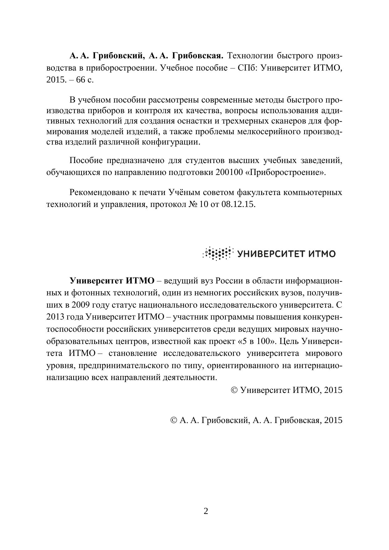 В учебном пособии рассмотрены современные методы быстрого производства приборов и контроля их качества, вопросы использования аддитивных технологий для создания оснастки и трехмерных сканеров для формирования моделей изделий, а также проблемы мелкосерийного производства изделий различной конфигурации. Пособие предназначено для студентов высших учебных заведений, обучающихся по направлению подготовки 200100 «Приборостроение».