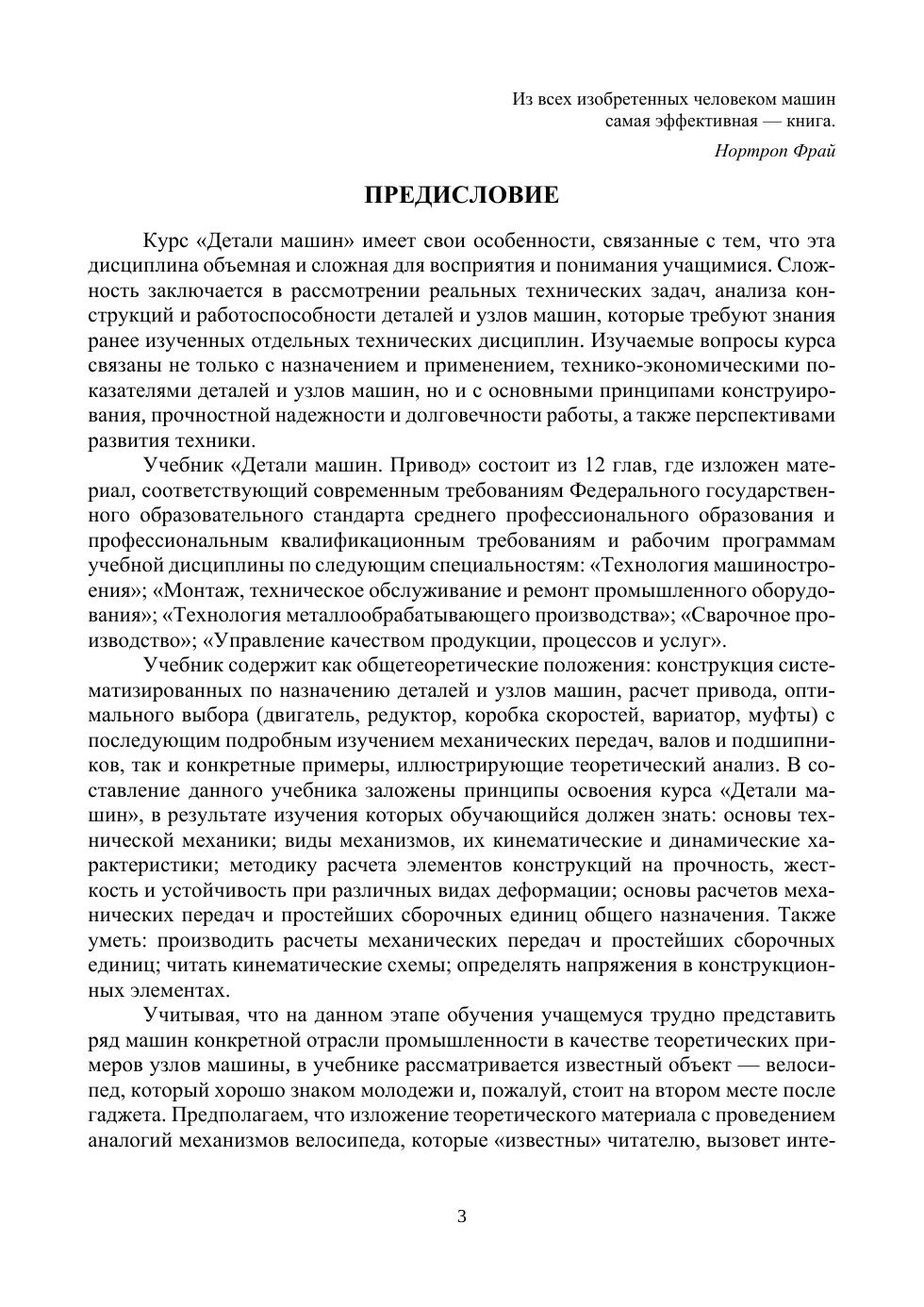 В учебнике рассмотрена механическая сущность деталей машин, раскрыты вопросы назначения и работоспособности привода, приведены основы кинематических и прочностных расчетов механизмов, типичных деталей и узлов машин. Даны рекомендации выбора и использования конструкций механизмов, как отдельных передач, так и всего модуля привода в целом. Представлены промышленные виды и конструкции электродвигателей, редукторов, коробок скоростей, вариаторов, соединяемых и управляемых муфт. Рассмотрены вопросы эволюции, технического прогресса основных деталей, узлов, передач машин. Приведена аналогия этих конструкций на примере известного велосипеда. В учебнике приведены вопросы для самопроверки после каждой главы. Учебник соответствует современным требованиям Федерального государственного образовательного стандарта среднего профессионального образования и профессиональным квалификационным требованиям. Издание предназначено в качестве учебника для колледжей машиностроительных и механических специальностей среднего профессионального образования.