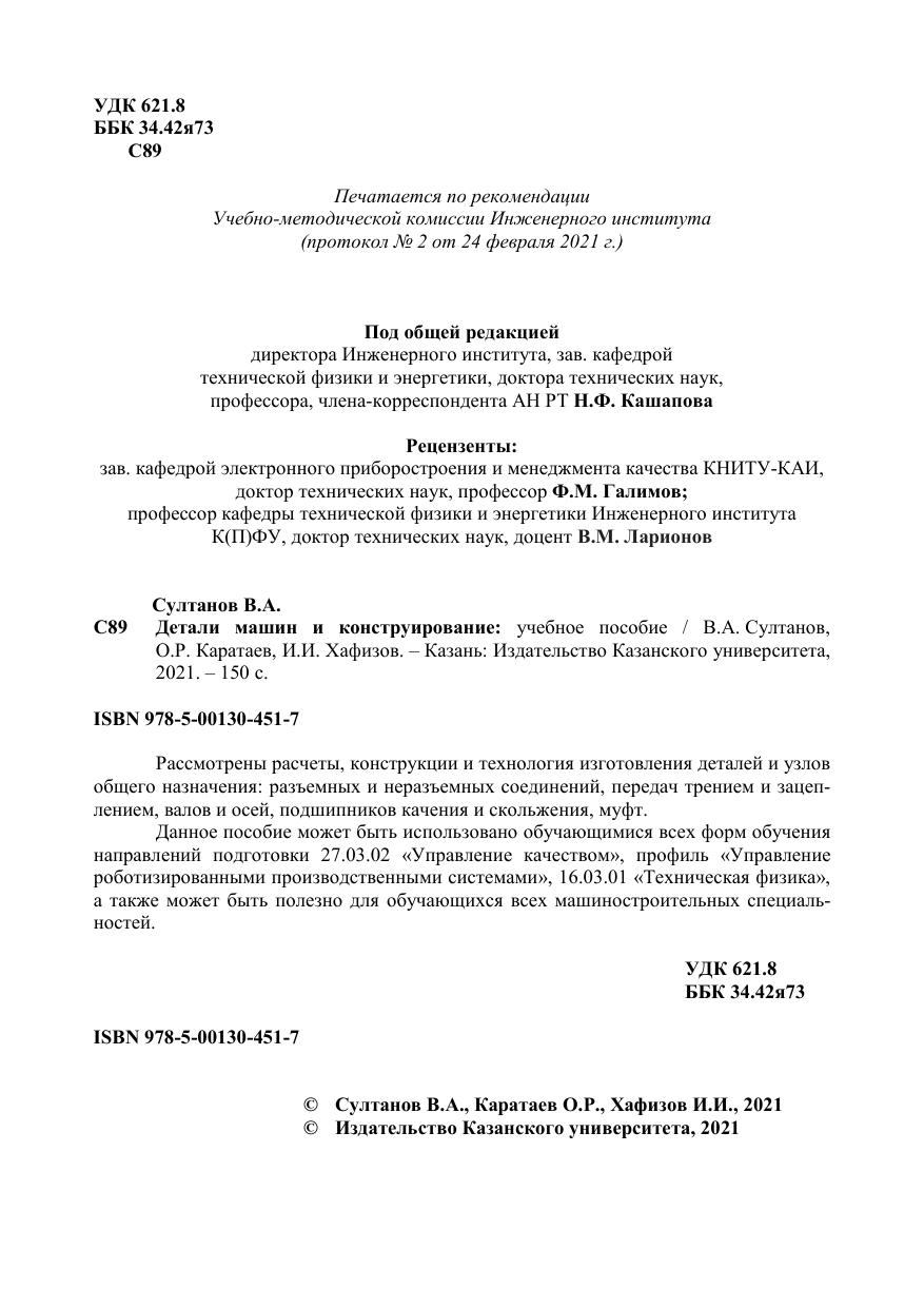 Рассмотрены расчеты, конструкции и технология изготовления деталей и узлов общего назначения: разъемных и неразъемных соединений, передач трением и зацеплением, валов и осей, подшипников качения и скольжения, муфт. Данное пособие может быть использовано обучающимися всех форм обучения направлений подготовки 27.03.02 «Управление качеством», профиль «Управление роботизированными производственными системами», 16.03.01 «Техническая физика», а также может быть полезно для обучающихся всех машиностроительных специальностей.