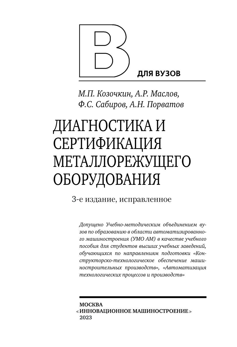 На основе разработок МГТУ «СТАНКИН» дано представление о видах испытаний технологического оборудования, изложены основы измерения шума и вибраций, описаны основные методы виброакустической диагностики станочных узлов и процессов резания. Дано представление об экономической эффективности применения систем диагностирования. Пособие предназначено для подготовки бакалавров технических университетов по направлениям 15.03.05 «Конструкторско-технологическое обеспечение машиностроительных производств» и 15.03.04 «Автоматизация технологических процессов и производств». Может быть полезным для технологов машиностроения, конструкторов станков и инструмента.