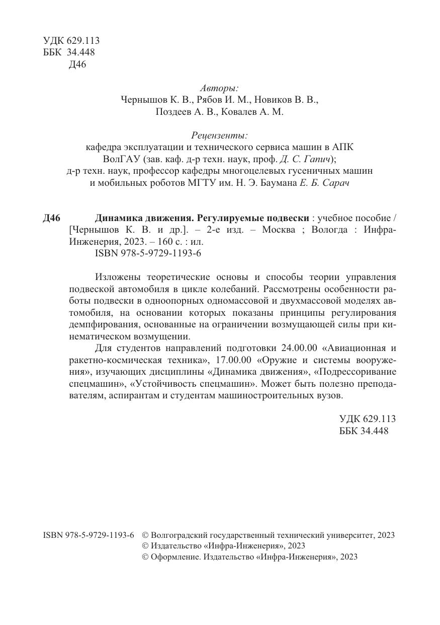 Для студентов направлений подготовки 24.00.00 «Авиационная и ракетно-космическая техника», 17.00.00 «Оружие и системы вооружения», изучающих дисциплины «Динамика движения», «Подрессоривание спецмашин», «Устойчивость спецмашин». Может быть полезно преподавателям, аспирантам и студентам машиностроительных вузов.