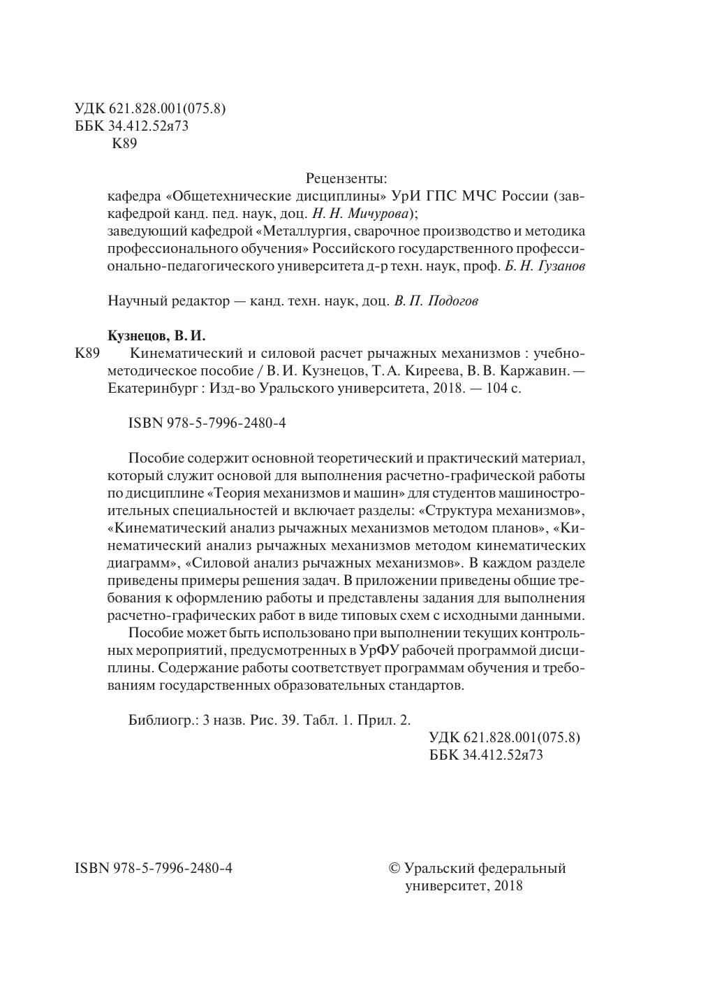 Пособие содержит основной теоретический и практический материал, который служит основой для выполнения расчетно-графической работы по дисциплине «Теория механизмов и машин» для студентов машиностроительных специальностей и включает разделы: «Структура механизмов», «Кинематический анализ рычажных механизмов методом планов», «Кинематический анализ рычажных механизмов методом кинематических диаграмм», «Силовой анализ рычажных механизмов». В каждом разделе приведены примеры решения задач. В приложении приведены общие требования к оформлению работы и представлены задания для выполнения расчетно-графических работ в виде типовых схем с исходными данными. Пособие может быть использовано при выполнении текущих контрольных мероприятий, предусмотренных в УрФУ рабочей программой дисциплины. Содержание работы соответствует программам обучения и требованиям государственных образовательных стандартов.