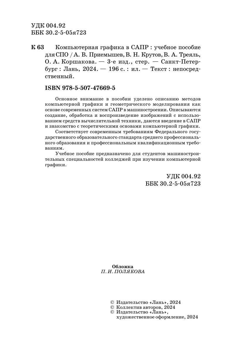 Основное внимание в пособии уделено описанию методов компьютерной графики и геометрического моделирования как основе современных систем САПР в машиностроении. Описываются создание, обработка и воспроизведение изображений с использованием средств вычислительной техники, даются введение в САПР и знакомство с теоретическими основами компьютерной графики. Соответствует современным требованиям Федерального государственного образовательного стандарта среднего профессионального образования и профессиональным квалификационным требованиям. Учебное пособие предназначено для студентов машиностроительных специальностей колледжей при изучении компьютерной графики.