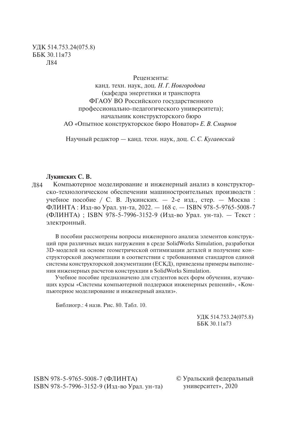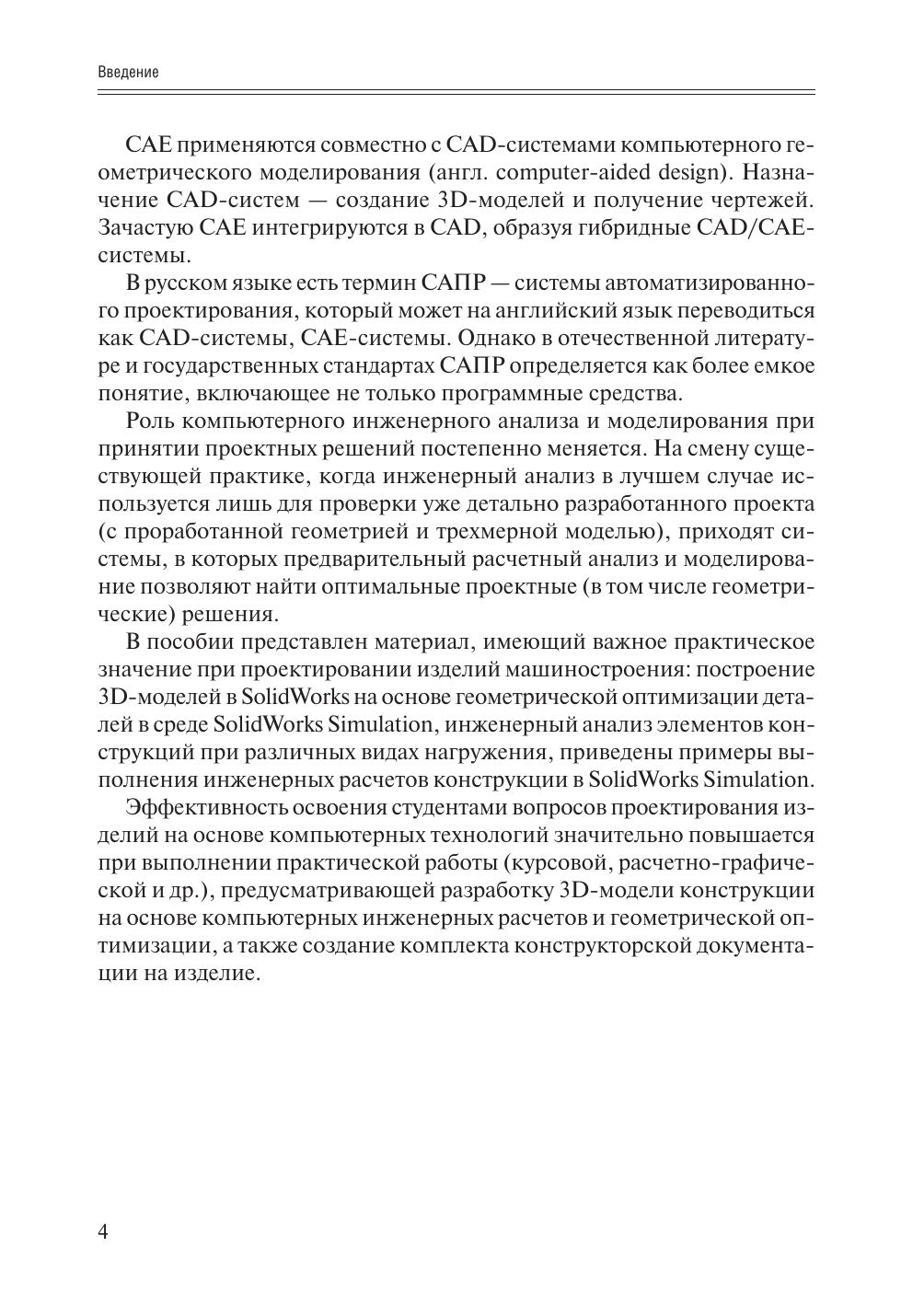 В пособии рассмотрены вопросы инженерного анализа элементов конструкций при различных видах нагружения в среде SolidWorks Simulation, разработки 3D-моделей на основе геометрической оптимизации деталей и получение конструкторской документации в соответствии с требованиями стандартов единой системы конструкторской документации (ЕСКД), приведены примеры выполнения инженерных расчетов конструкции в SolidWorks Simulation.