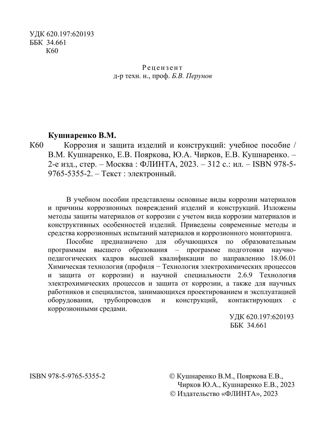 Пособие предназначено для обучающихся по образовательным программам высшего образования – программе подготовки научно-педагогических кадров высшей квалификации по направлению 18.06.01 Химическая технология (профиля − Технология электрохимических процессов и защита от коррозии) и научной специальности 2.6.9 Технология электрохимических процессов и защита от коррозии, а также для научных работников и специалистов, занимающихся проектированием и эксплуатацией оборудования, трубопроводов и конструкций, контактирующих с коррозионными средами.