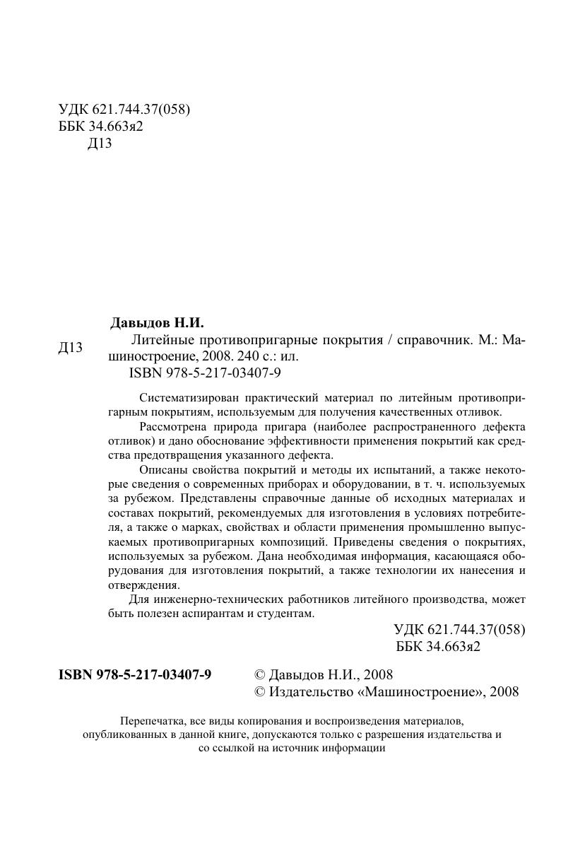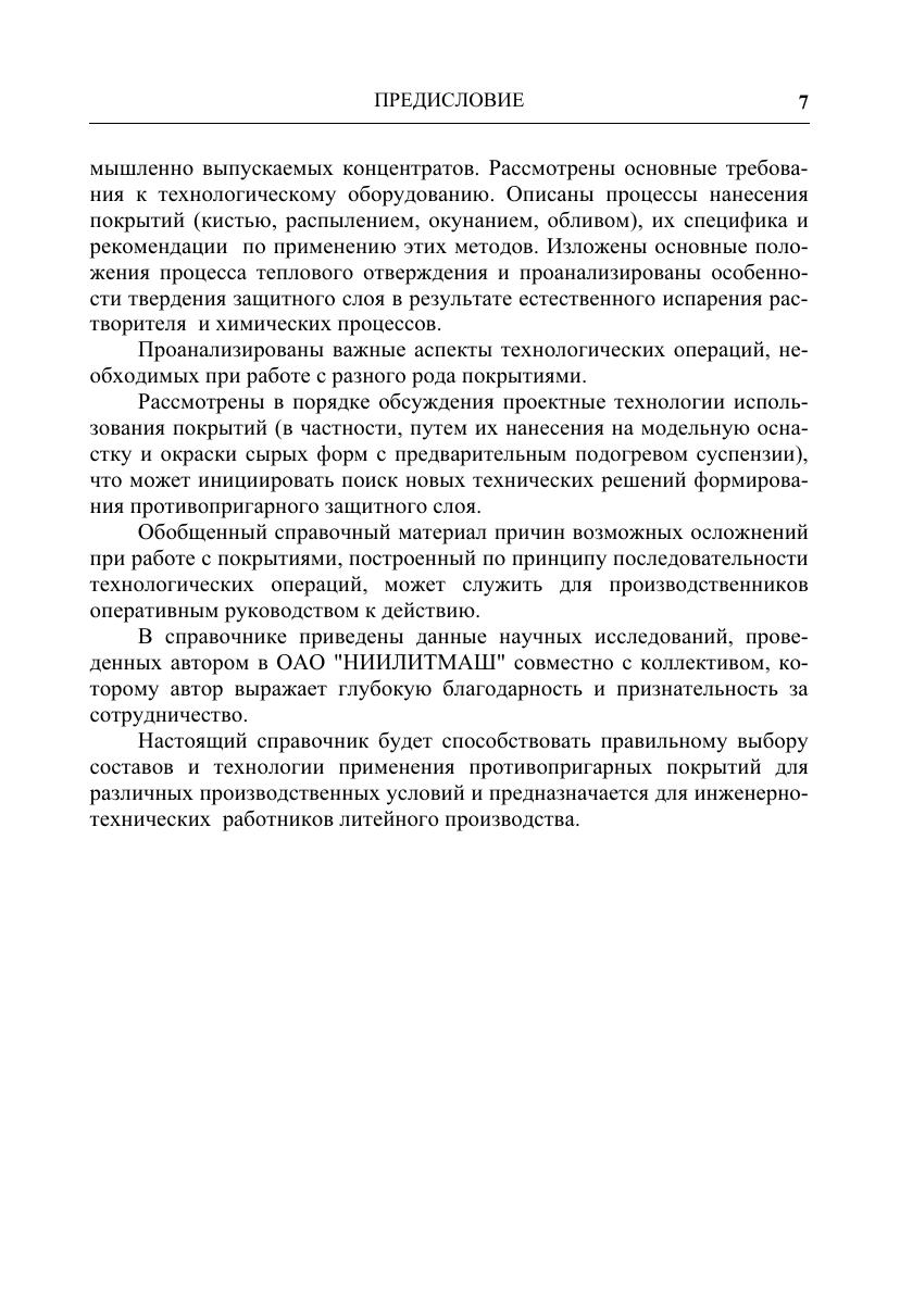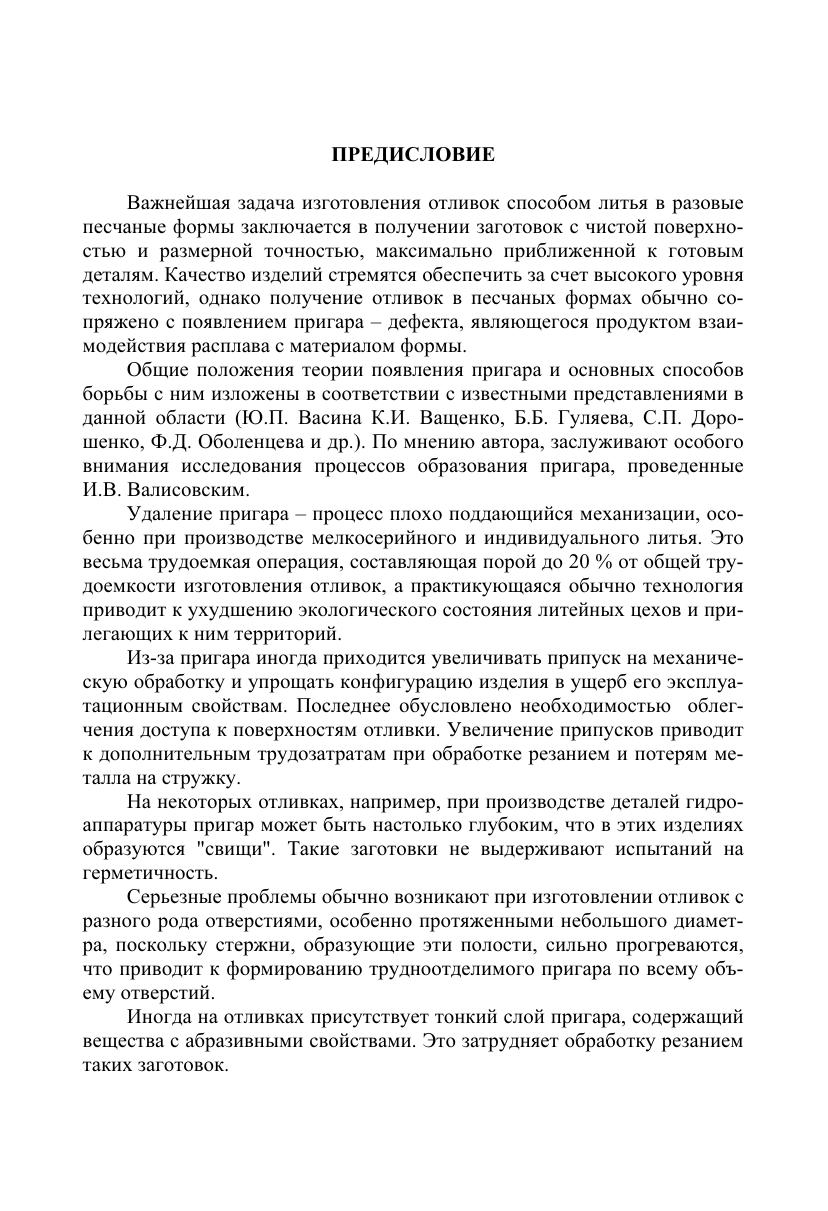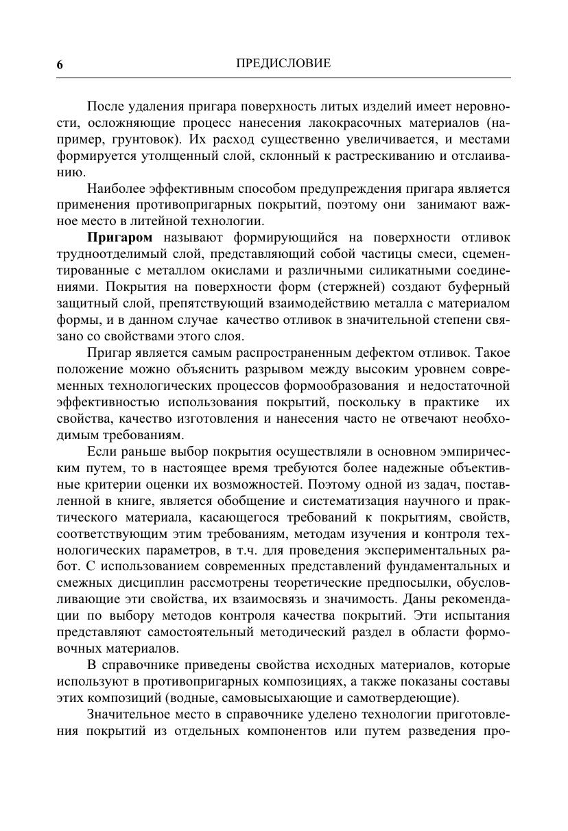 Систематизирован практический материал по литейным противопригарным покрытиям, используемым для получения качественных отливок. Рассмотрена природа пригара (наиболее распространенного дефекта отливок) и дано обоснование эффективности применения покрытий как средства предотвращения указанного дефекта. Описаны свойства покрытий и методы их испытаний, а также некоторые сведения о современных приборах и оборудовании, в т. ч. Используемых за рубежом. Представлены справочные данные об исходных материалах и составах покрытий, рекомендуемых для изготовления в условиях потребителя, а также о марках, свойствах и области применения промышленно выпускаемых противопригарных композиций. Приведены сведения о покрытиях, используемых за рубежом. Дана необходимая информация, касающаяся оборудования для изготовления покрытий, а также технологии их нанесения и отверждения. Для инженерно-технических работников литейного производства, может быть полезен аспирантам и студентам.