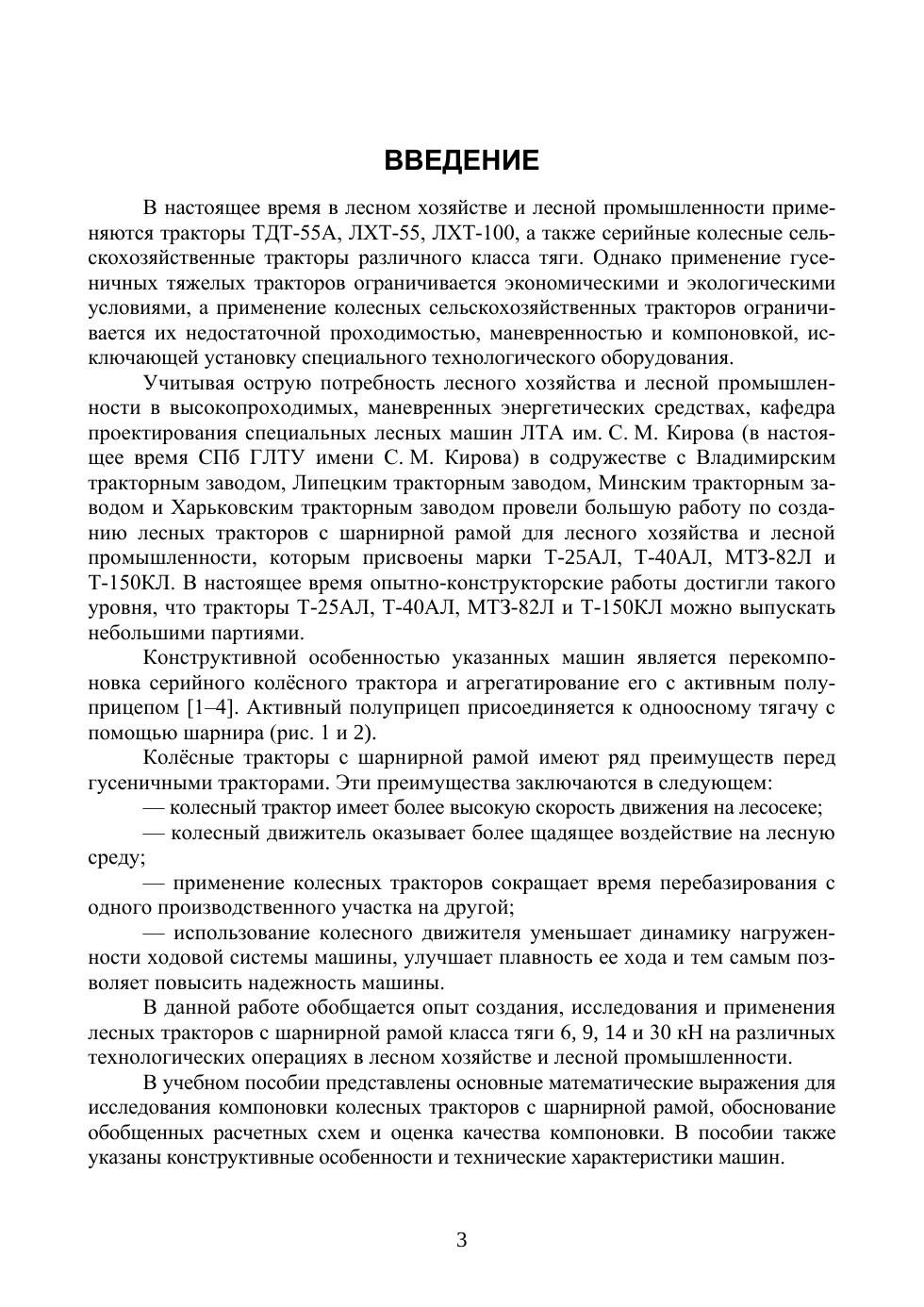 В учебном пособии рассматриваются вопросы создания и исследования компоновки специ-альных колесных лесных тракторов класса тяги 6 кН, 9 кН, 14 кН и 30 кН с шарнирной рамой. Теоретические основы компоновки лесных колесных тракторов с шарнирной рамой разработаны учеными кафедры проектирования специальных лесных машин Санкт-Петербургской лесотехни-ческой академии (в настоящее время СПб ГЛТУ им. С. М. Кипрва). Рассматривается методика и приведены данные для расчета нагруженности ходовой части и анализа распределения нагрузок по ведущим мостам тракторов. В соответствии с ГОСТ 26953-86, ГОСТ 26955-86 и ГОСТ 51629-2000 изложена методика оценки соответствия ходовой системы колесных тракторов норми-руемым лесоводственным требованиям. Исследование компоновки лесных колесных тракторов предполагает большой объем расчетной работы. Для ускорения исследований предлагается в помощь студентам расчетная система MathCAD. Соответствует современным требованиям Федерального государственного образовательного стандарта среднего профессионального образования и профессиональным квалификационным требованиям. Учебное пособие предназначено для студентов техникумов и колледжей, обучающихся по специальности «Лесное и лесопарковое хозяйство».