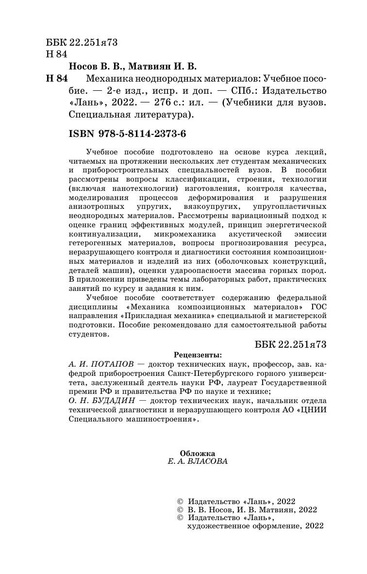 Учебное пособие подготовлено на основе курса лекций, читаемых на протяжении нескольких лет студентам механических и приборостроительных специальностей вузов. В пособии рассмотрены вопросы классификации, строения, технологии (включая нанотехнологии) изготовления, контроля качества, моделирования процессов деформирования и разрушения анизотропных упругих, вязкоупругих, упруго-пластичных неоднородных материалов. Рассмотрены вариационный подход к оценке границ эффективных модулей, принцип энергетической континуализации, микромеханика акустической эмиссии гетерогенных материалов, вопросы прогнозирования ресурса, неразрушающего контроля и диагностики состояния композиционных материалов и изделий из них (оболочковых конструкций, деталей машин), оценки удароопасности массива горных пород. В приложении приведены темы лабораторных работ, практических занятий по курсу и задания к ним. Учебное пособие соответствует содержанию федеральной дисциплины «Механика композиционных материалов» ГОС направления «Прикладная механика» специальной и магистерской подготовки. Пособие предназначено для самостоятельной работы студентов.