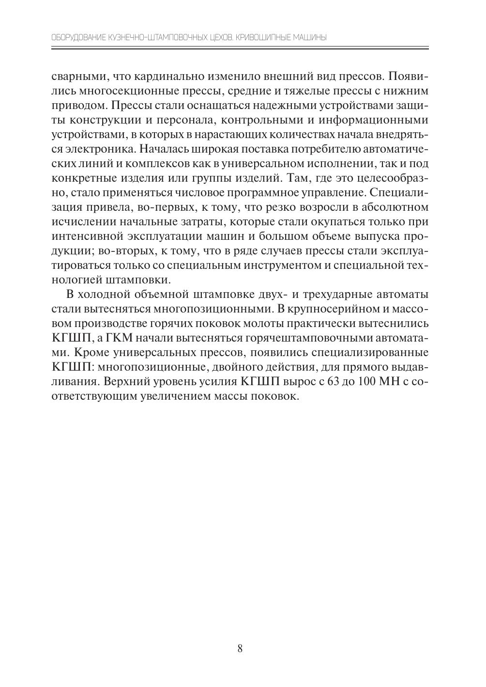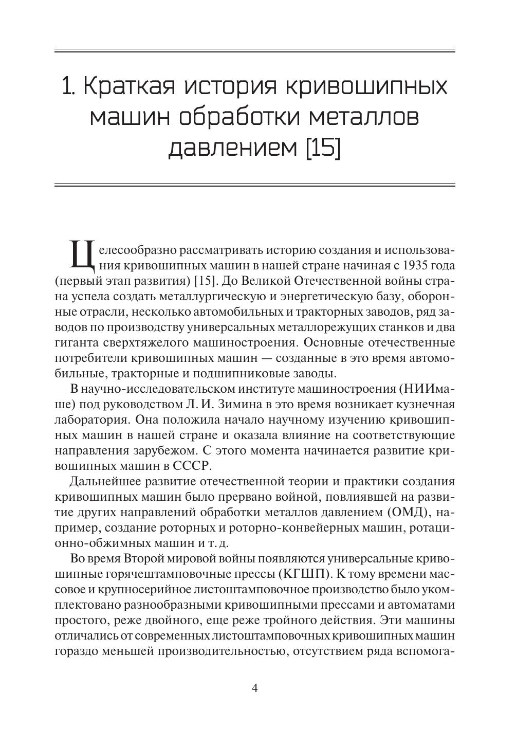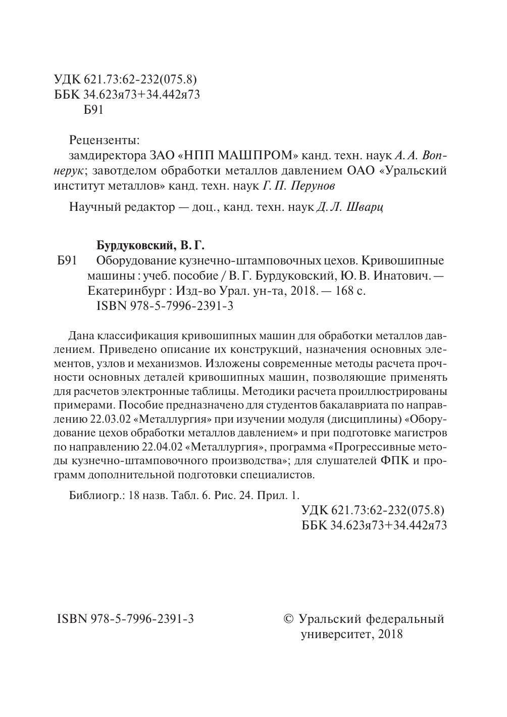 Дана классификация кривошипных машин для обработки металлов давлением. Приведено описание их конструкций, назначения основных элементов, узлов и механизмов. Изложены современные методы расчета прочности основных деталей кривошипных машин, позволяющие применять для расчетов электронные таблицы. Методики расчета проиллюстрированы примерами. Пособие предназначено для студентов бакалавриата по направлению 22.03.02 «Металлургия» при изучении модуля (дисциплины) «Оборудование цехов обработки металлов давлением» и при подготовке магистров по направлению 22.04.02 «Металлургия», программа «Прогрессивные методы кузнечно-штамповочного производства»; для слушателей ФПК и программ дополнительной подготовки специалистов.