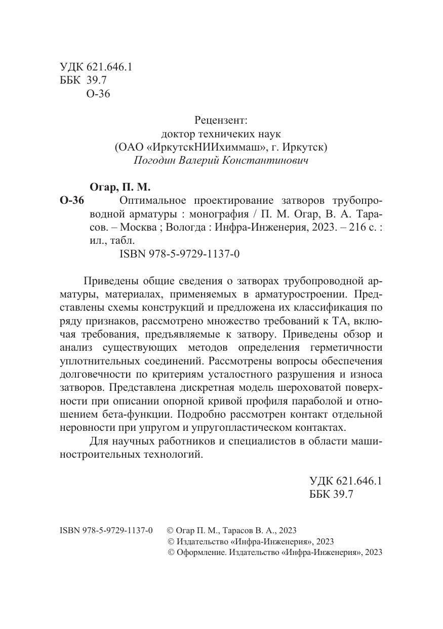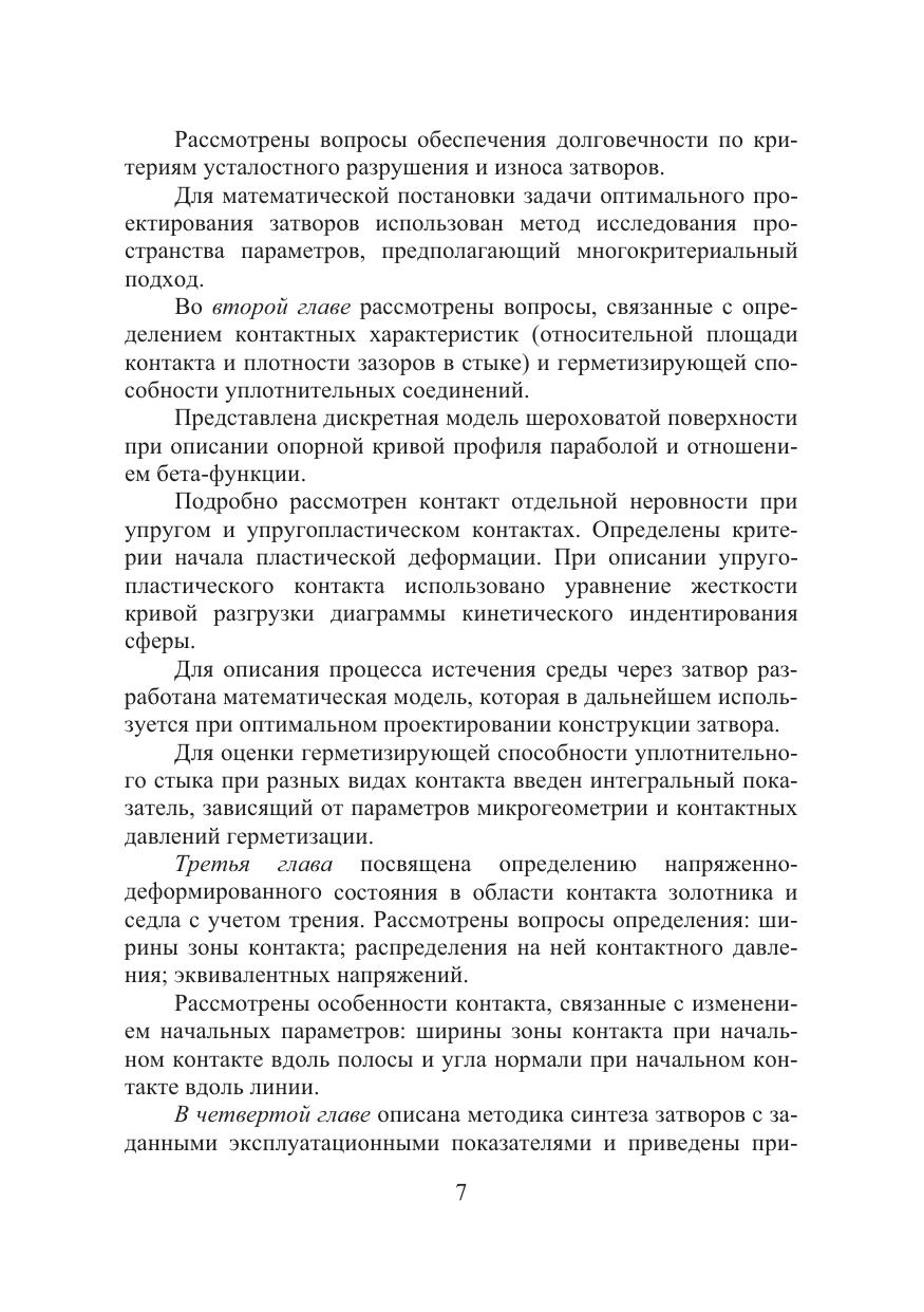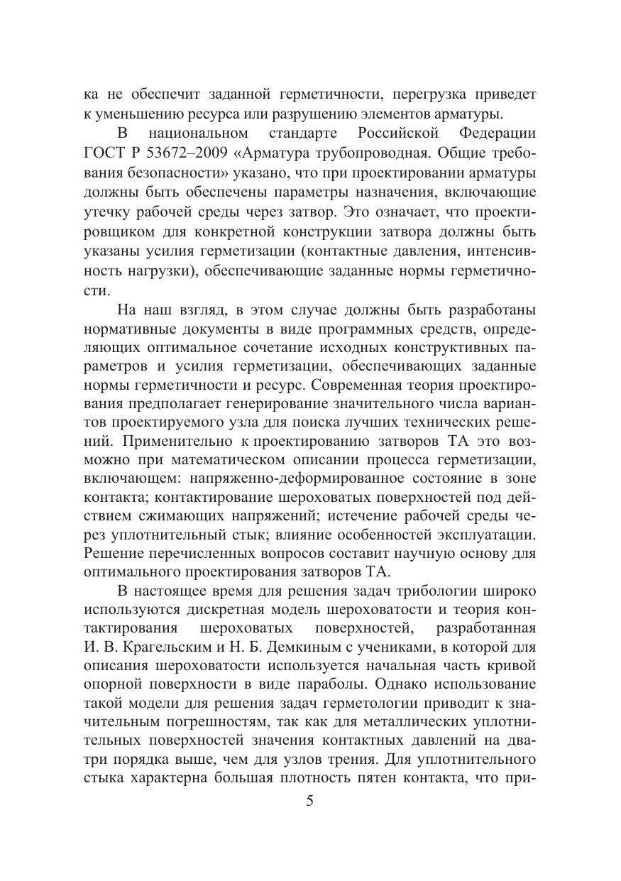 Приведены общие сведения о затворах трубопроводной арматуры, материалах, применяемых в арматуростроении. Представлены схемы конструкций и предложена их классификация по ряду признаков, рассмотрено множество требований к ТА, включая требования, предъявляемые к затвору. Приведены обзор и анализ существующих методов определения герметичности уплотнительных соединений. Рассмотрены вопросы обеспечения долговечности по критериям усталостного разрушения и износа затворов. Представлена дискретная модель шероховатой поверхности при описании опорной кривой профиля параболой и отношением бета-функции. Подробно рассмотрен контакт отдельной неровности при упругом и упругопластическом контактах.