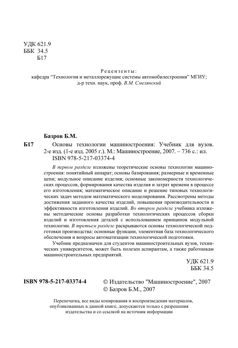 Гриф: Допущено Министерством образования Российской Федерации в качестве учебника для студентов высших учебных заведений, обучающихся по направлению подготовки бакалавров и магистров «Технология, оборудование и автоматизация машиностроительных производств» и направлению подготовки дипломированных специалистов «Конструкторско-технологическое обеспечение машиностроительных производств»