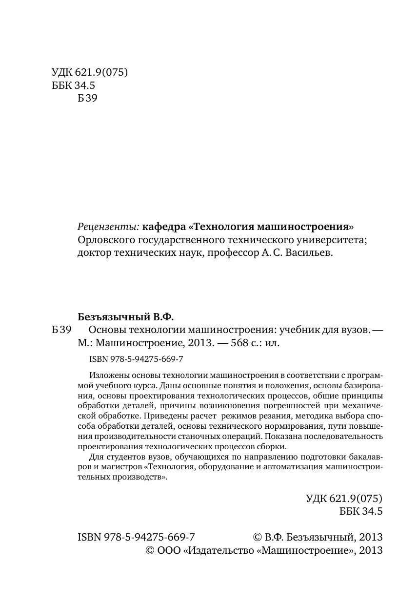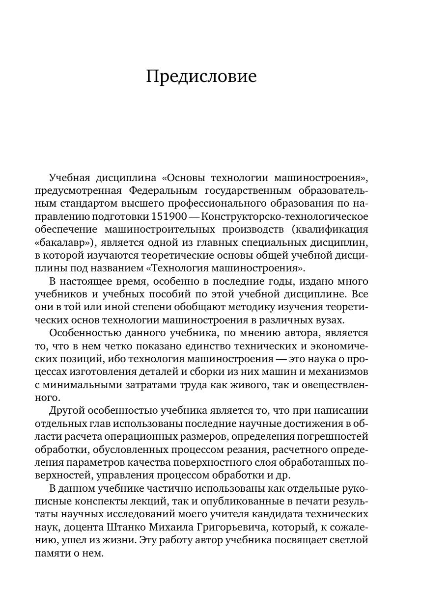 Изложены основы технологии машиностроения в соответствии с программой учебного курса. Даны основные понятия и положения, основы базирования, основы проектирования технологических процессов, общие принципы обработки деталей, причины возникновения погрешностей при механической обработке. Приведены расчет режимов резания, методика выбора способа обработки деталей, основы технического нормирования, пути повышения производительности станочных операций. Показана последовательность проектирования технологических процессов сборки. Для студентов вузов, обучающихся по направлению подготовки бакалавров и магистров ?Технология, оборудование и автоматизация машиностроительных производств?.