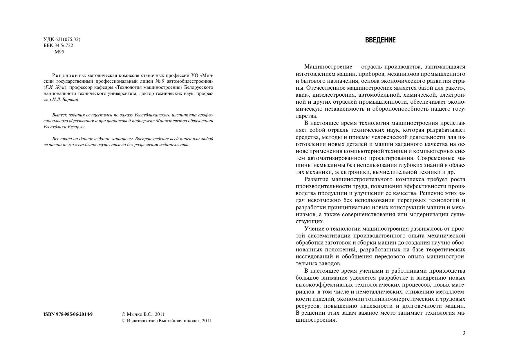 Содержит сведения о технологии машиностроения. Освещены вопросы базирования и установки заготовок при обработке на станках, точности обработки и сборки, технологичности конструкции деталей и рационального выбора заготовки, а также принципы проектирования технологических процессов обработки резанием и сборки машин. Для учащихся ПТУ по специальностям "Механическая обработка металла на станках и линиях", "Техническая эксплуатация оборудования", Технология обработки металлов давлением". Также может быть полезно рабочим в повышении квалификации.