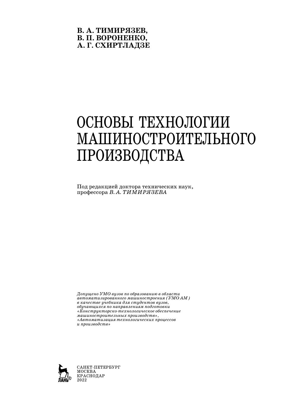 Изложены теоретические основы технологии машиностроения и показано их использование для разработки высокоэффективных технологических процессов изготовления деталей и сборки машин. Особое внимание уделено вопросам обеспечения качества машин, повышения производительности и снижения себестоимости их изготовления. Учебник предназначен для студентов машиностроительных вузов, проходящих обучение на уровне бакалавров, магистров наук и дипломированных инженеров по направлениям «Конструкторско-технологическое обеспечение машиностроительных производств», «Автоматизация технологических процессов и производств».