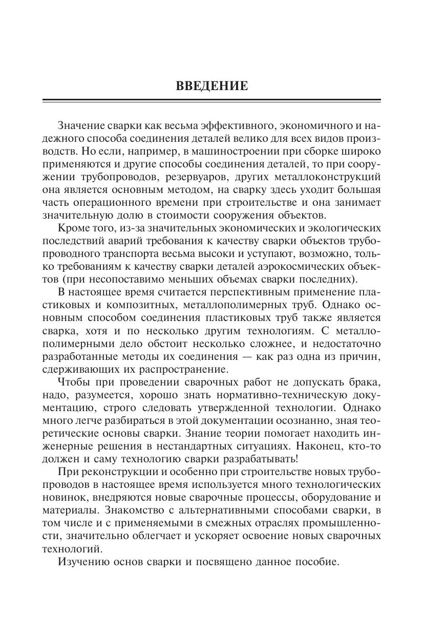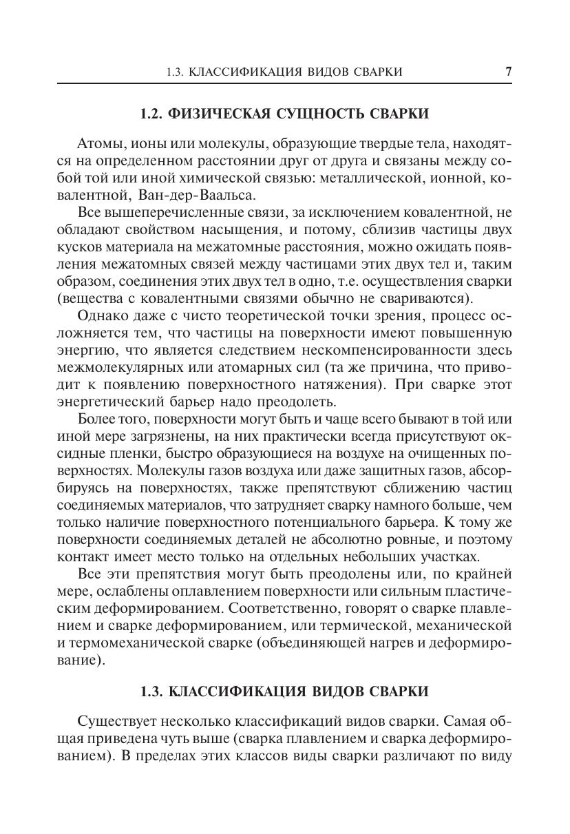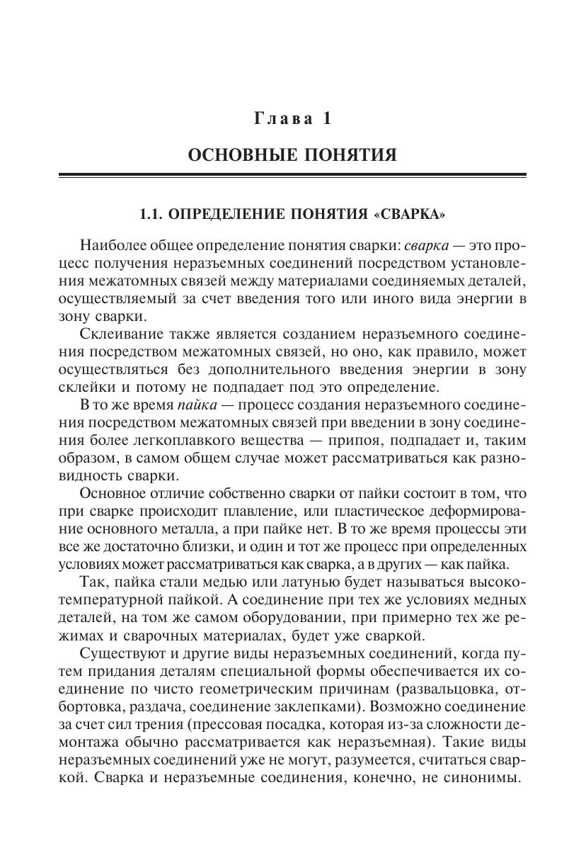 Даны основы теории сварки плавлением (теплофизика сварочных процессов, физика дугового разряда, основы металлургических процессов в варочной ванне, формирование зон термического влияния). Приведена классификация видов сварки и сварных швов, рассмотрены технология и оборудование дуговой сварки, кратко описаны другие виды сварки (электроконтактная,газоваяхолоднаясваркадавлением,диффузионнаяввакууме, сварка трением, электрошлаковая, плазменная, электронно-лучевая, лазерная, ультразвуковая, термитная), а также технологии и оборудование для огневой резки. Уделено внимание механизмам образования сварочных дефектов, напряжений и деформаций, методам их предотвращения, методам контроля качества сварных швов, технике безопасности при сварочных работах. Для студентов высших технических учебных заведений. Может быть полезным специалистам сварочного производства.