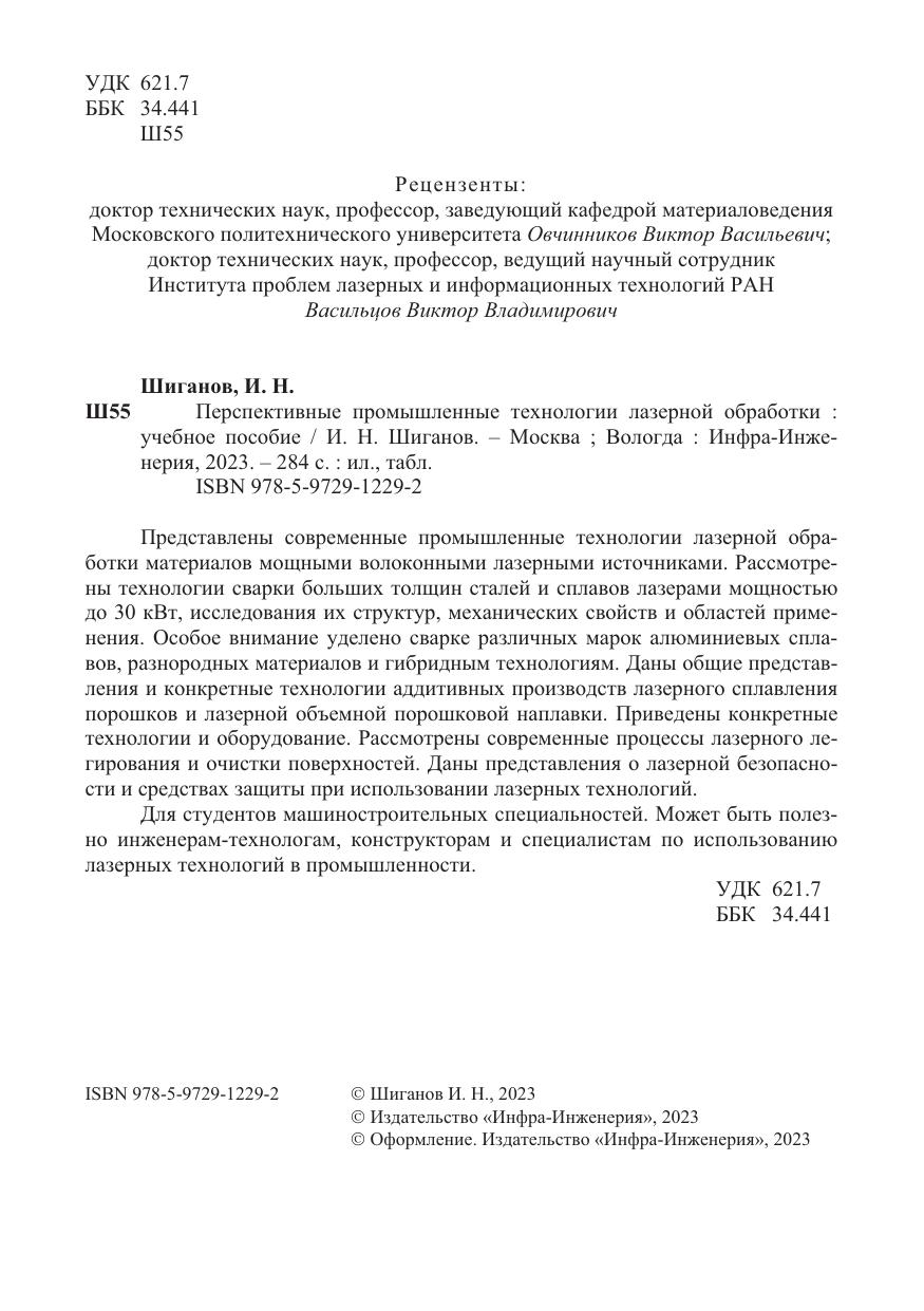 Представлены современные промышленные технологии лазерной обработки материалов мощными волоконными лазерными источниками. Рассмотрены технологии сварки больших толщин сталей и сплавов лазерами мощностью до 30 кВт, исследования их структур, механических свойств и областей применения. Особое внимание уделено сварке различных марок алюминиевых сплавов, разнородных материалов и гибридным технологиям. Даны общие представления и конкретные технологии аддитивных производств лазерного сплавления порошков и лазерной объемной порошковой наплавки. Приведены конкретные технологии и оборудование. Рассмотрены современные процессы лазерного легирования и очистки поверхностей. Даны представления о лазерной безопасности и средствам защиты при использовании лазерных технологий.