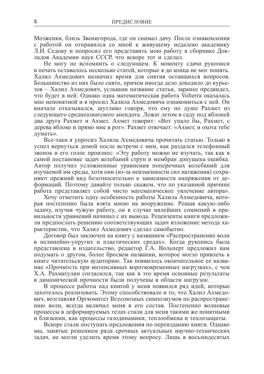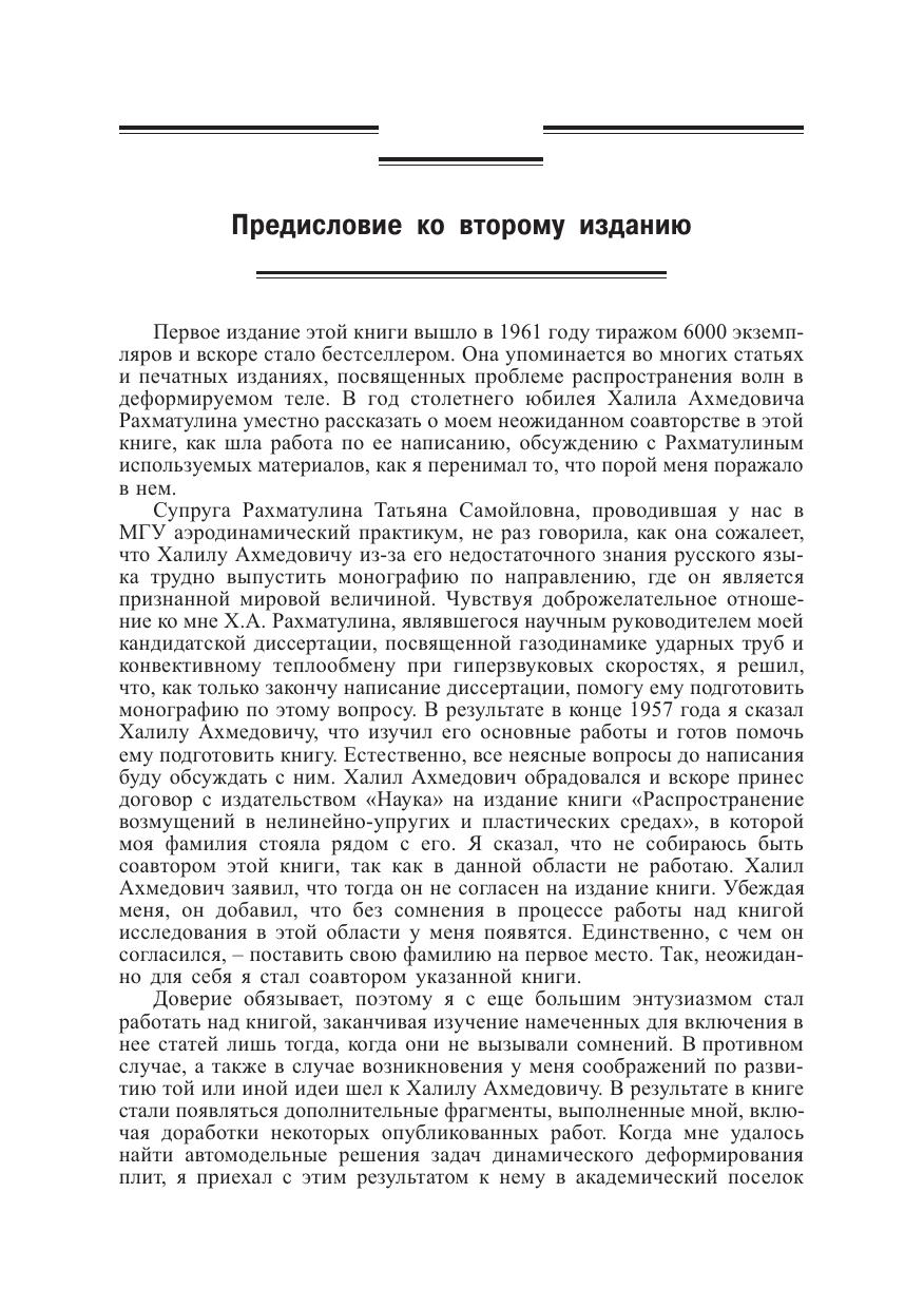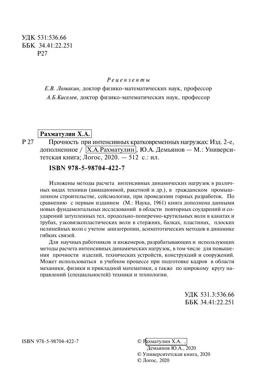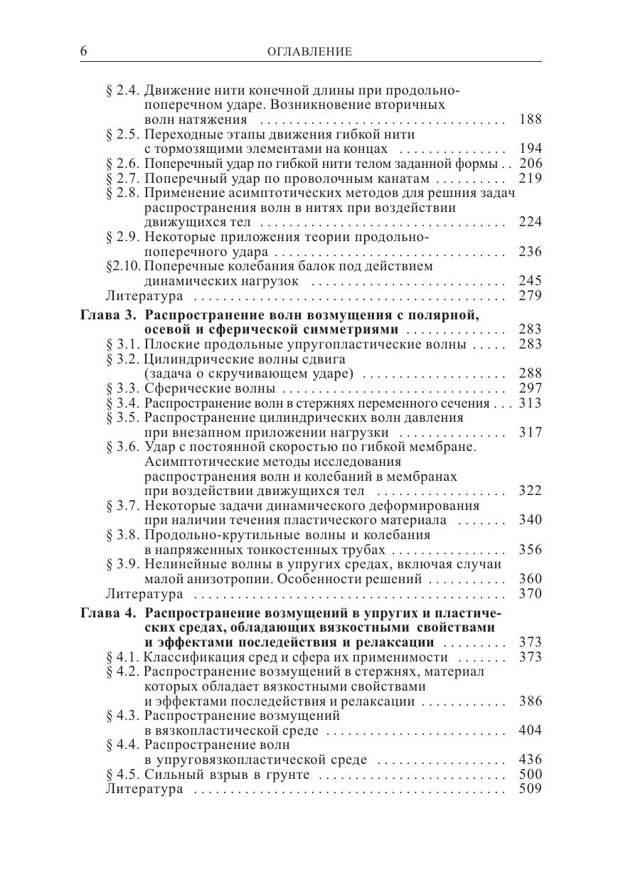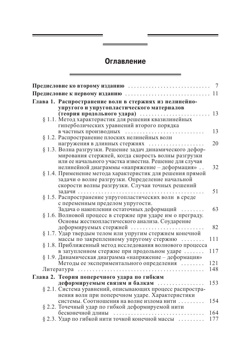 Изложены методы расчета интенсивных динамических нагрузок в различных видах техники (авиационной, ракетной и др.), в гражданском промышленном строительстве, сейсмологии, при проведении горных разработок. По сравнению с первым изданием (М.: Наука, 1961) книга дополнена данными новых фундаментальных исследований в области повторных соударений и соударений затупленных тел, продольно%поперечно%крутильных волн в канатах и трубах, узковязкопластических волн в стержнях, балках, пластинах, плоских нелинейных волн с учетом анизотропии, асимптотических методов в динамике гибких связей. Для научных работников и инженеров, разрабатывающих и использующих методы расчета интенсивных динамических нагрузок, в том числе для повышения прочности изделий, технических устройств, конструкций и сооружений. Может использоваться в учебном процессе при подготовке кадров в области механики, физики и прикладной математики, а также по широкому кругу направлений (специальностей) техники и технологии.