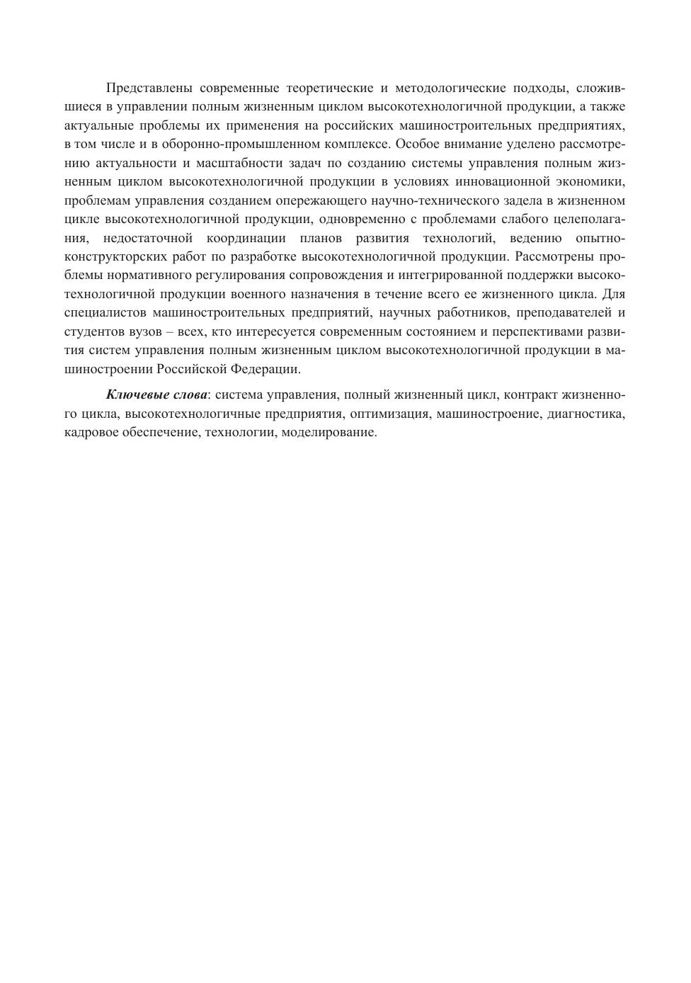Представлены современные теоретические и методологические подходы, сложившиеся в управлении полным жизненным циклом высокотехнологичной продукции, а также актуальные проблемы их применения на российских машиностроительных предприятиях, в том числе и в оборонно-промышленном комплексе. Особое внимание уделяю рассмотрению актуальности и масштабности задач по созданию системы управления полным жизненным циклом высокотехнологичной продукции в условиях инновационной экономики, проблемам управления созданием опережающего научно-технического задела в жизненном цикле высокотехнологичной продукции, одновременно с проблемами слабого целеполагания, недостаточной координации планов развития технологий, ведению опытно-конструкторских работ по разработке высокотехнологичной продукции. Рассмотрены проблемы нормативного регулирования сопровождения и интегрированной поддержки высокотехнологичной продукции военного назначения в течение всего ее жизненного цикла. Для специалистов машиностроительных предприятий, научных работников, преподавателей и студентов вузов – всех, кто интересуется современным состоянием и перспективами развития систем управления полным жизненным циклом высокотехнологичной продукции в машиностроении Российской Федерации.