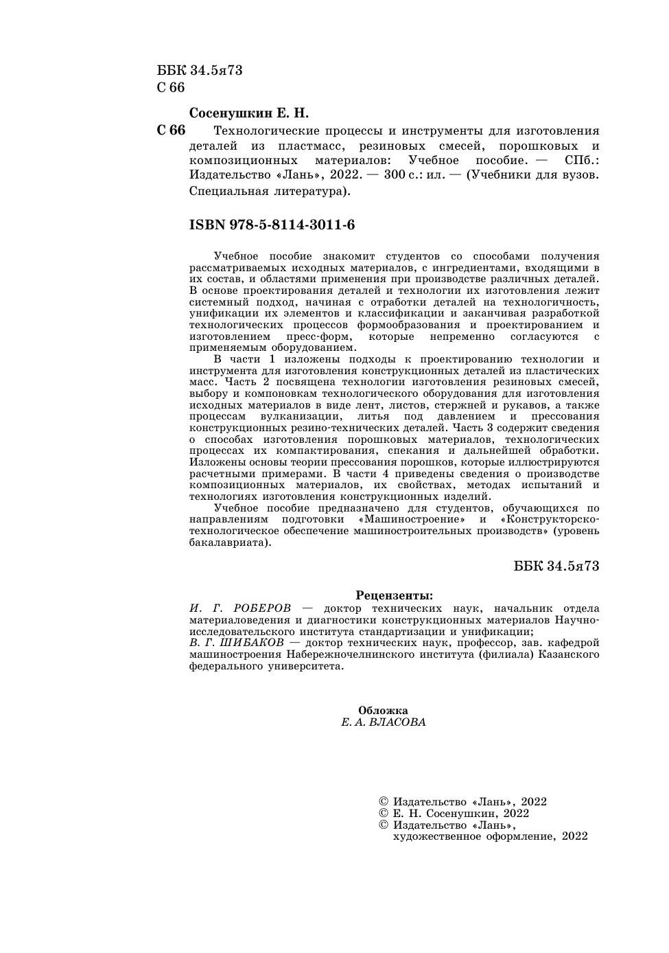 Учебное пособие знакомит студентов со способами получения рассматриваемых исходных материалов, с ингредиентами, входящими в их состав, и областями применения при производстве различных деталей. В основе проектирования деталей и технологии их изготовления лежит системный подход, начиная с отработки деталей на технологичность, унификации их элементов и классификации и заканчивая разработкой технологических процессов формообразования и проектированием и изготовлением пресс-форм, которые непременно согласуются с применяемым оборудованием. В части 1 изложены подходы к проектированию технологии и инструмента для изготовления конструкционных деталей из пластических масс. Часть 2 посвящена технологии изготовления резиновых смесей, выбору и компоновкам технологического оборудования для изготовления исходных материалов в виде лент, листов, стержней и рукавов, а также процессам вулканизации, литья под давлением и прессования конструкционных резино-технических деталей. Часть 3 содержит сведения о способах изготовления порошковых материалов, технологических процессах их компактирования, спекания и дальнейшей обработки. Изложены основы теории прессования порошков, которые иллюстрируются расчетными примерами. В части 4 приведены сведения о производстве композиционных материалов, их свойствах, методах испытаний и технологиях изготовления конструкционных изделий. Учебное пособие предназначено для студентов, обучающихся по направлениям подготовки «Машиностроение» и «Конструкторско-технологическое обеспечение машиностроительных производств» (уровень бакалавриата).
