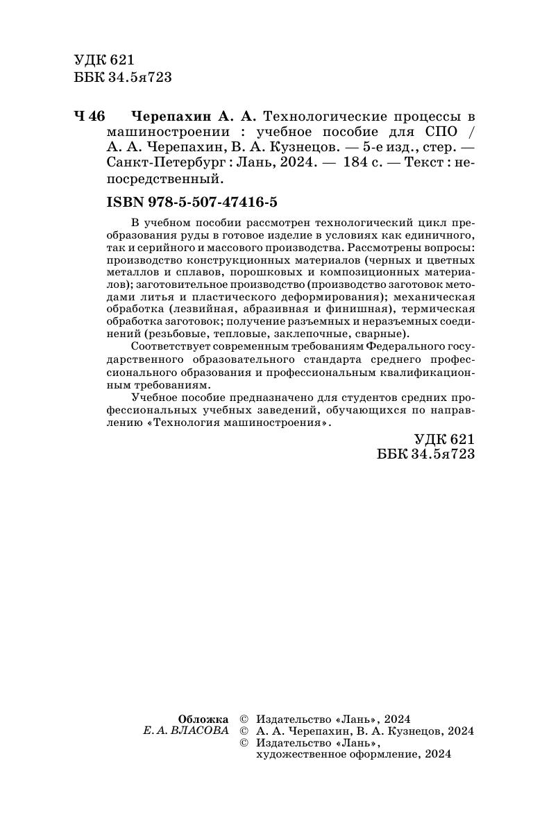 В учебном пособии рассмотрен технологический цикл преобразования руды в готовое изделие в условиях как единичного, так и серийного и массового производства. Рассмотрены вопросы: производство конструкционных материалов (черных и цветных металлов и сплавов, порошковых и композиционных материалов), заготовительное производство (производство заготовок методами литья и пластического деформирования), механическая обработка (лезвийная, абразивная и финишная), термическая обработка заготовок, получение разъемных и неразъемных соединений (резьбовые, тепловые, заклепочные, сварные). Соответствует современным требованиям Федерального государственного образовательного стандарта среднего профессионального образования и профессиональным квалификационным требованиям. Учебное пособие предназначено для студентов средних профессиональных учебных заведений, обучающихся по направлению «Технология машиностроения».