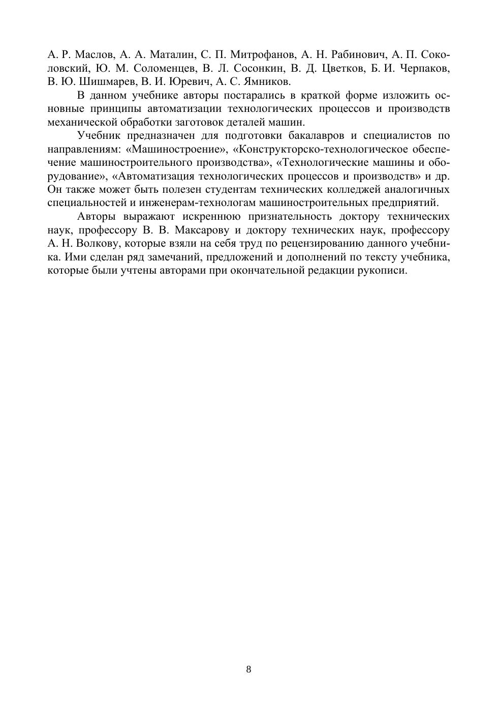 В учебнике рассмотрены современные направления автоматизации производственных процессов в машиностроении. В нем освещены основные вопросы, связанные с проектированием технологических процессов для различных форм машиностроительного производства, особенности построения технологических процессов обработки заготовок деталей машин на станках с ЧПУ, организации технологии на автоматических линиях, РТК, ГПС и др. Рассмотрены вопросы выбора методов получения заготовок деталей машин для автоматизированного производства в машиностроении, автоматизация выбора и назначения технологических баз при обработке заготовок с целью уменьшения погрешности их базирования и обработки. Освещены вопросы, связанные с особенностями разработки технологических процессов автоматизированной и роботизированной сборки изделий, а также автоматизацией технологической подготовки производства.