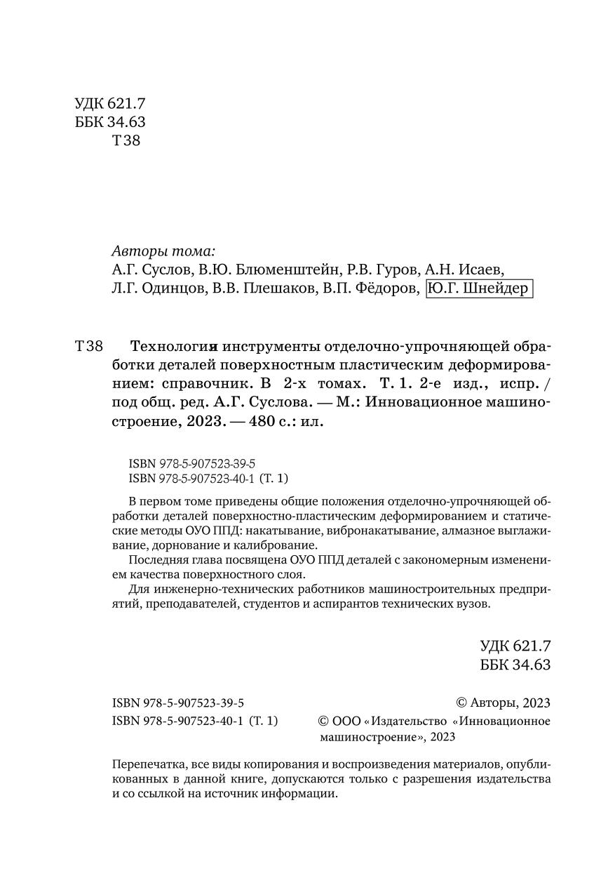 В первом томе приведены общие положения отделочно-упрочняющей обработки деталей поверхностно-пластическим деформированием и статические методы ОУО ППД: накатывание, вибронакатывание, алмазное выглаживание, дорнование и калибрование. Последняя глава посвящена ОУО ППД деталей с закономерным изменением качества поверхностного слоя. Для инженерно-технических работников машиностроительных предприятий, преподавателей, студентов и аспирантов технических вузов.