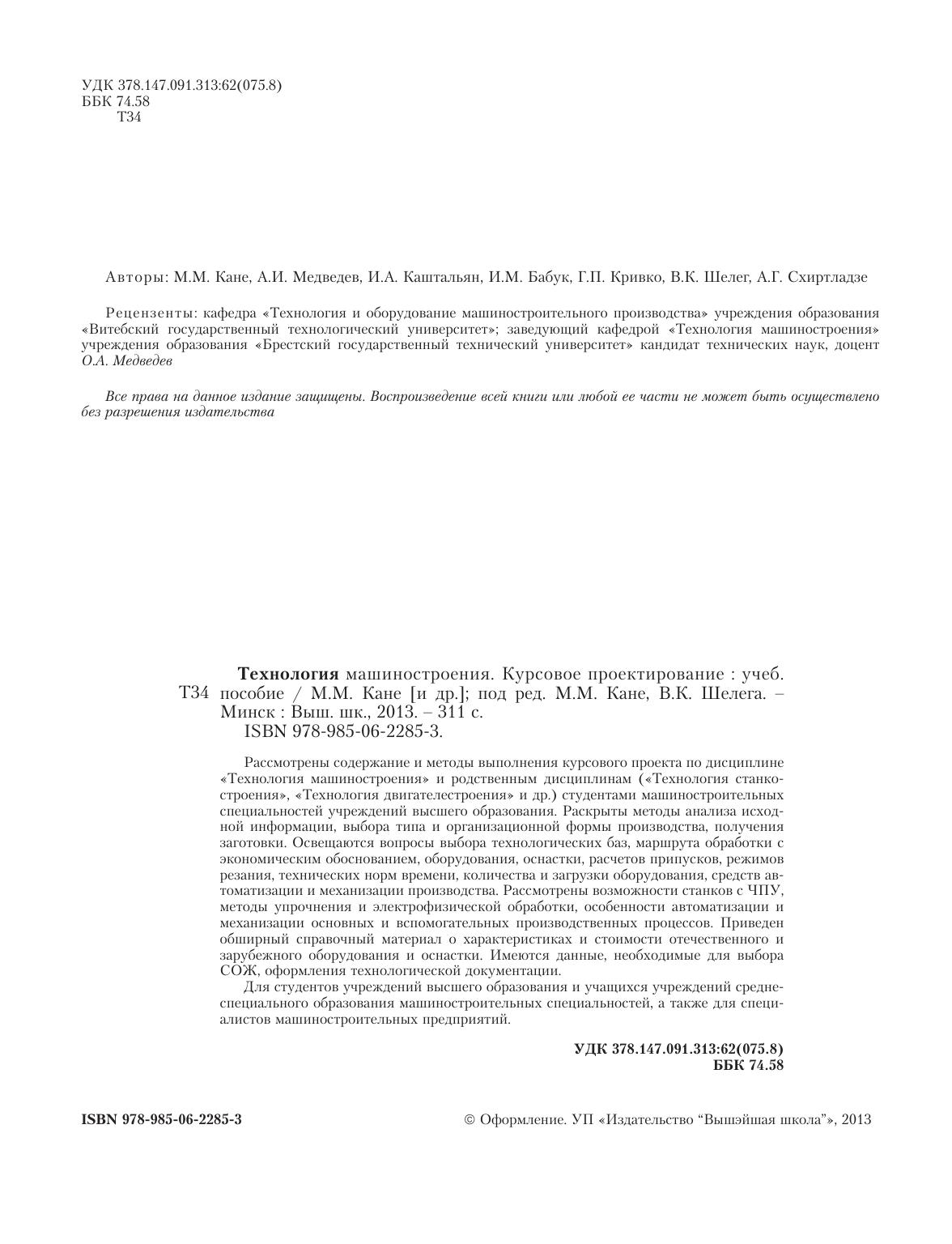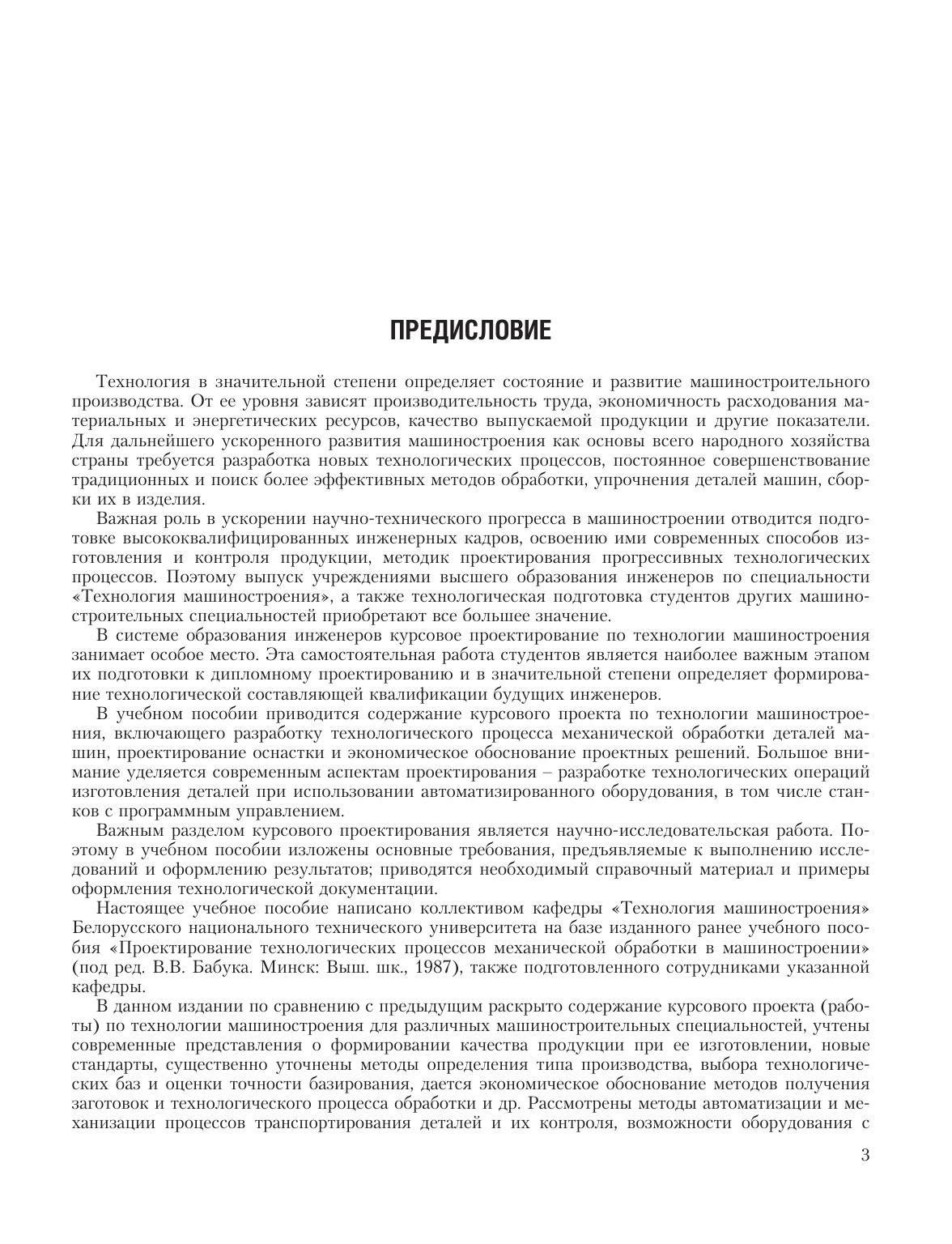 Рассмотрены содержание и методы выполнения курсового проекта по "Технологии машиностроения" и родственным дисциплинам "Технология станкостроения", технология двигателестроения и другим студентами машиностроительных специальностей вузов. Раскрыты методы анализа исходной информации, выбора типа и организационной формы производства, методов получения заготовки, выбора технологических баз, маршрута обработки с экономическим обоснованием, оборудования, оснастки, расчетов припусков, режимов резания, технических норм времени, количества и загрузки оборудования, средств автоматизации и механизации производства. Рассмотрены вопросы расчета технологических размерных цепей, возможности станков с ЧПУ, методов упрочнения, электрофизических методов обработки, особенности автоматизации и механизации основных и вспомогательных производственных процессов. Приведен обширный справочный материал о возможностях различных методов получения заготовок и обработки деталей машин, характеристиках и стоимости отечественного и зарубежного оборудования и оснастки. Имеются данные, необходимые для технического нормирования работ на металлорежущих станках, в том числе с ЧПУ, для выбора СОЖ, оформления технологической документации. Для студентов вузов и учащихся ССУЗов машиностроительных специальностей, а также для специалистов машиностроительных предприятий.