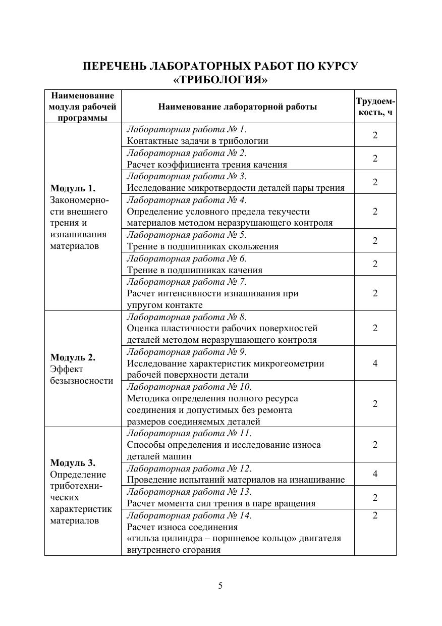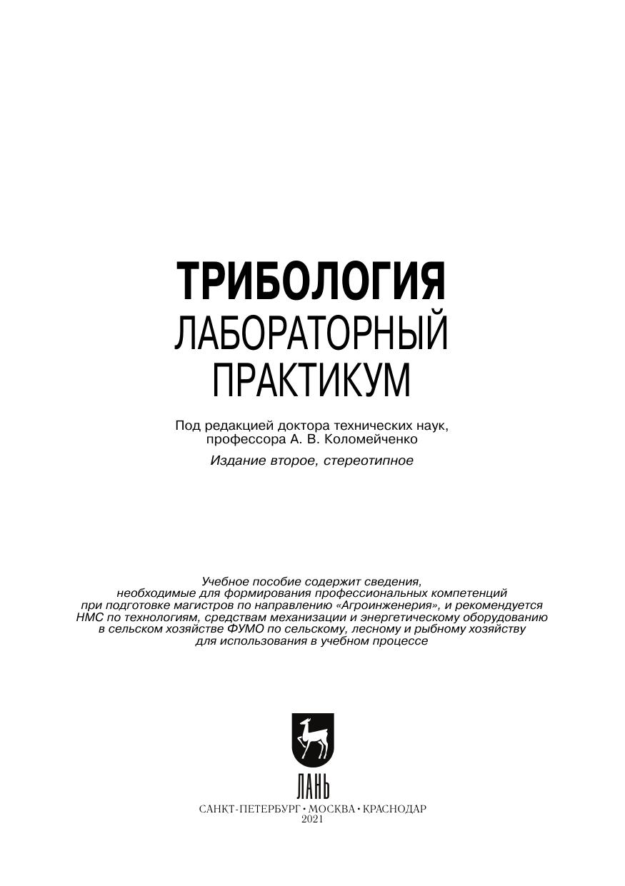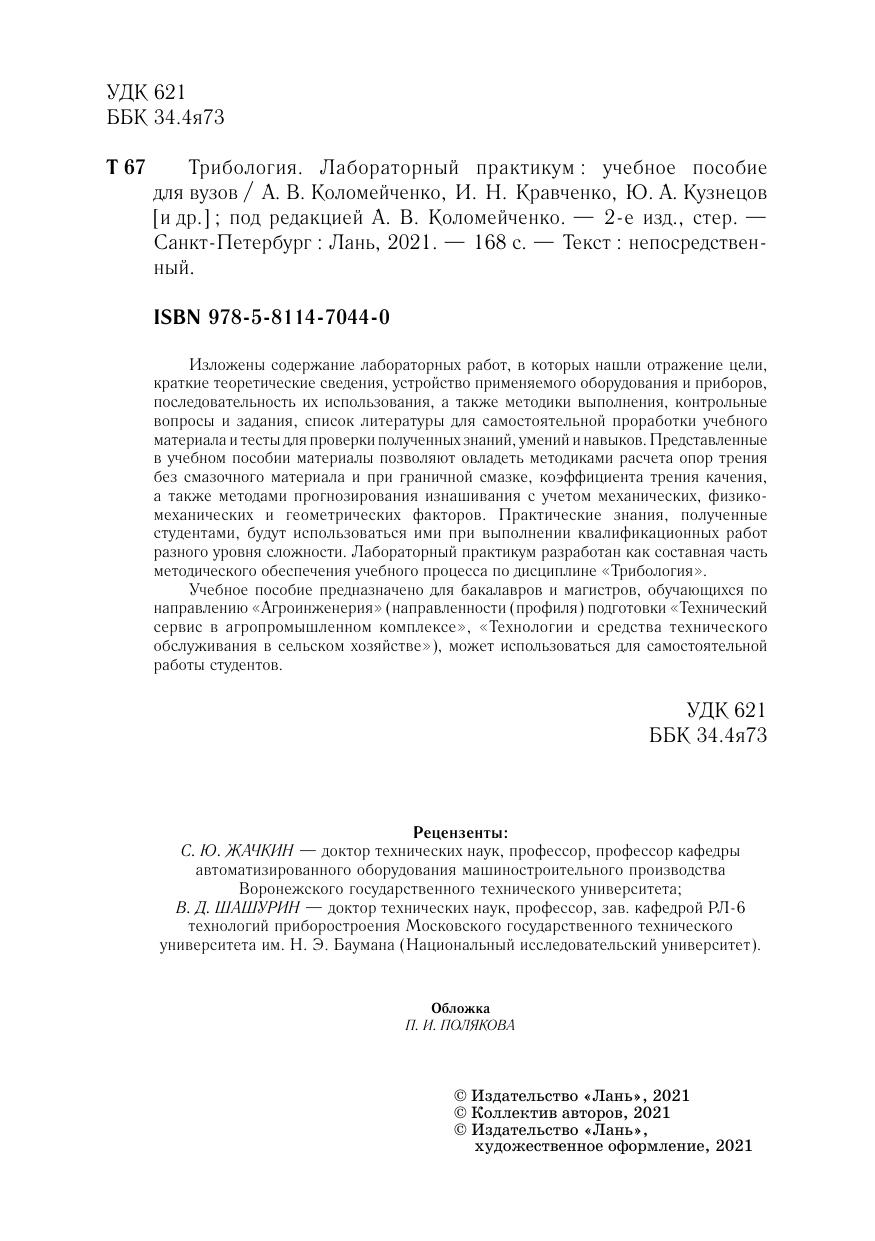 Изложены содержание лабораторных работ, в которых нашли отражение цели, краткие теоретические сведения, устройство применяемого оборудования и приборов, последовательность их использования, а также методики выполнения, контрольные вопросы и задания, список литературы для самостоятельной проработки учебного материала и тесты для проверки полученных знаний, умений и навыков. Представленные в учебном пособии материалы позволяют овладеть методиками расчета опор трения без смазочного материала и при граничной смазке, коэффициента трения качения,