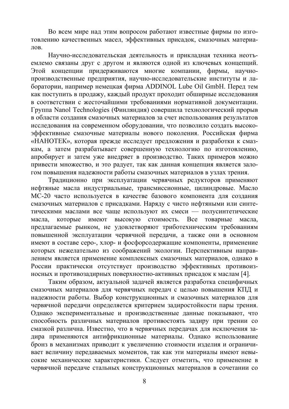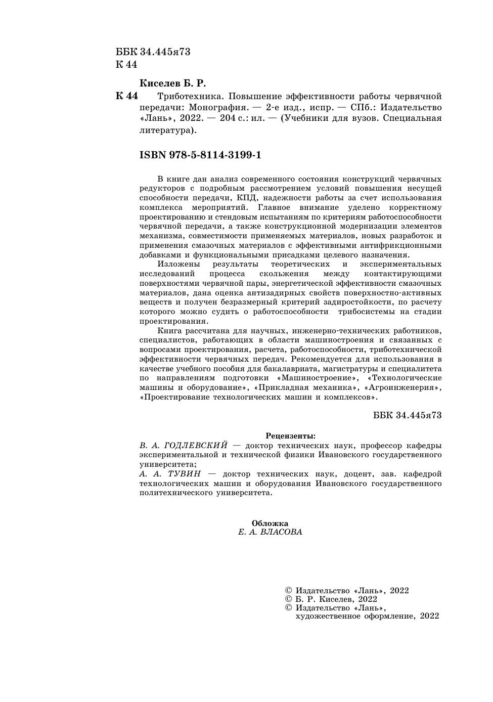 В книге дан анализ современного состояния конструкций червячных редукторов с подробным рассмотрением условий повышения несущей способности передачи, КПД, надежности работы за счет использования комплекса мероприятий. Главное внимание уделено корректному проектированию и стендовым испытаниям по критериям работоспособности червячной передачи, а также конструкционной модернизации элементов механизма, совместимости применяемых материалов, новых разработок и применения смазочных материалов с эффективными антифрикционными добавками и функциональными присадками целевого назначения. Изложены результаты теоретических и экспериментальных исследований процесса скольжения между контактирующими поверхностями червячной пары, энергетической эффективности смазочных материалов, дана оценка антизадирных свойств поверхностно-активных веществ и получен безразмерный критерий задиростойкости, по расчету которого можно судить о работоспособности трибосистемы на стадии проектирования. Книга рассчитана для научных, инженерно-технических работников, специалистов, работающих в области машиностроения и связанных с вопросами проектирования, расчета, работоспособности, триботехнической эффективности червячных передач. Рекомендуется для использования в качестве учебного пособия для бакалавриата, магистратуры и специалитета по направлениям подготовки «Машиностроение», «Технологические машины и оборудование», «Прикладная механика», «Агроинженерия», «Проектирование технологических машин и комплексов».