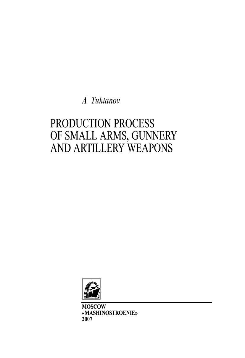 В основу учебника положено описание технологических процессов и операций по изготовлению и испытаниям основных командных деталей стрелкового и артиллерийского оружия. Приведены требования к деталям в части материалов, точности их изготовления. Даны описания наиболее важных станков, чертежи специальных инструментов и приспособлений для основных операций технологических процессов изготовления и контроля, а также режимы выполнения операций, проведен анализ затрат времени на эти процессы. Учебник предназначен для студентов высших учебных заведений, обучающихся по специальности “Стрелково-пушечное, артиллерийское и ракетное оружие” направления подготовки дипломированных специалистов “Оружие и системы вооружения”.