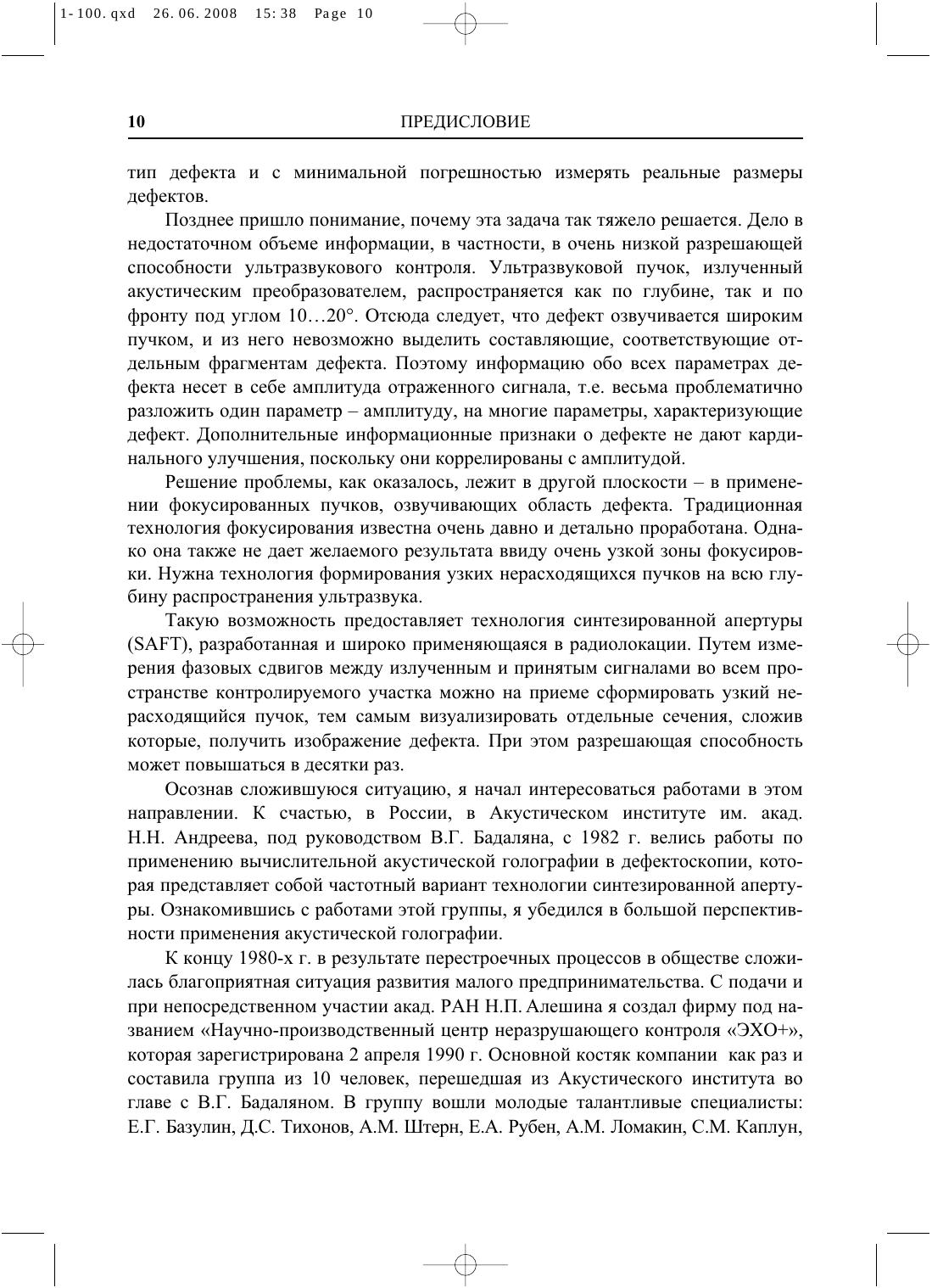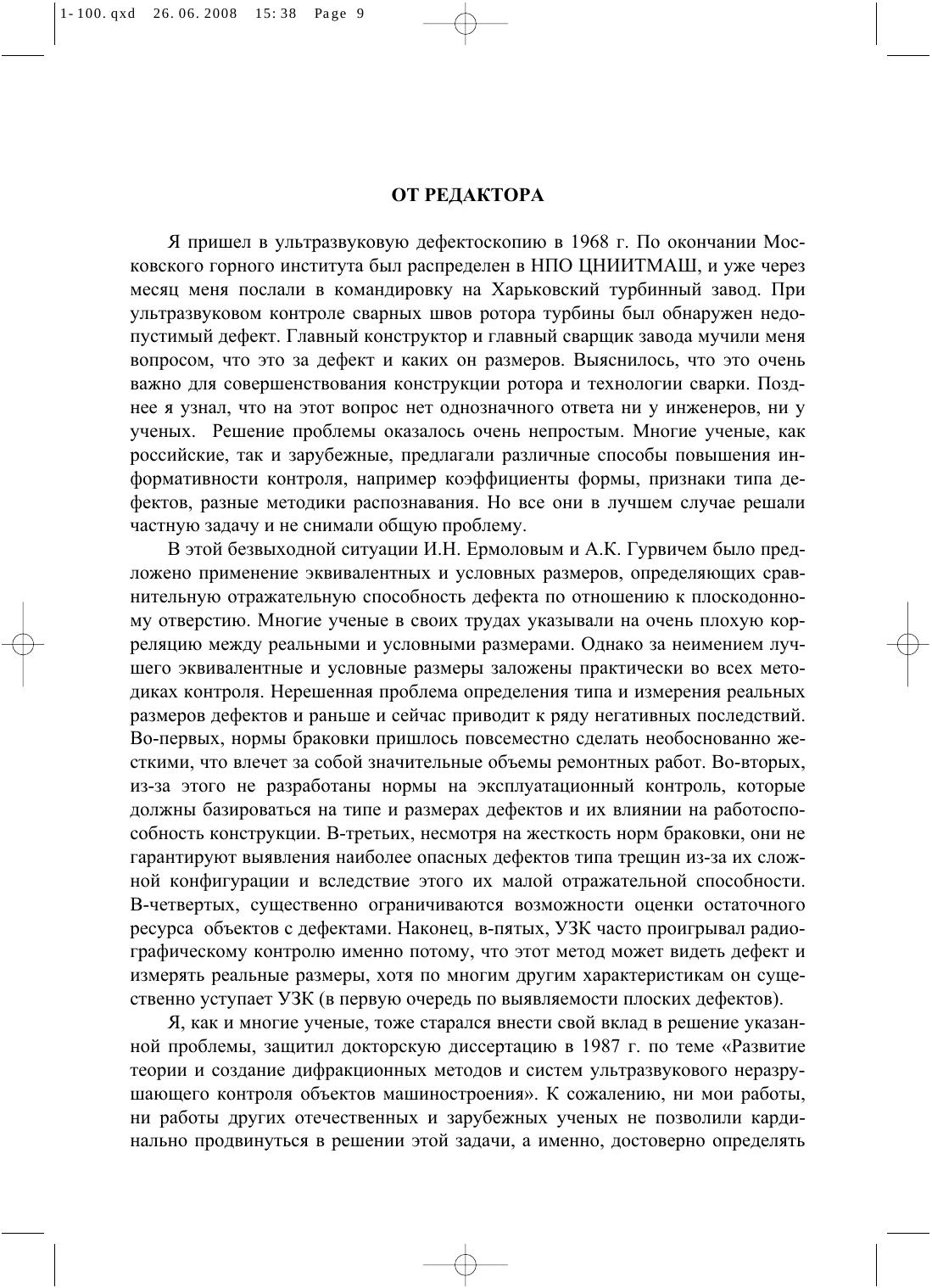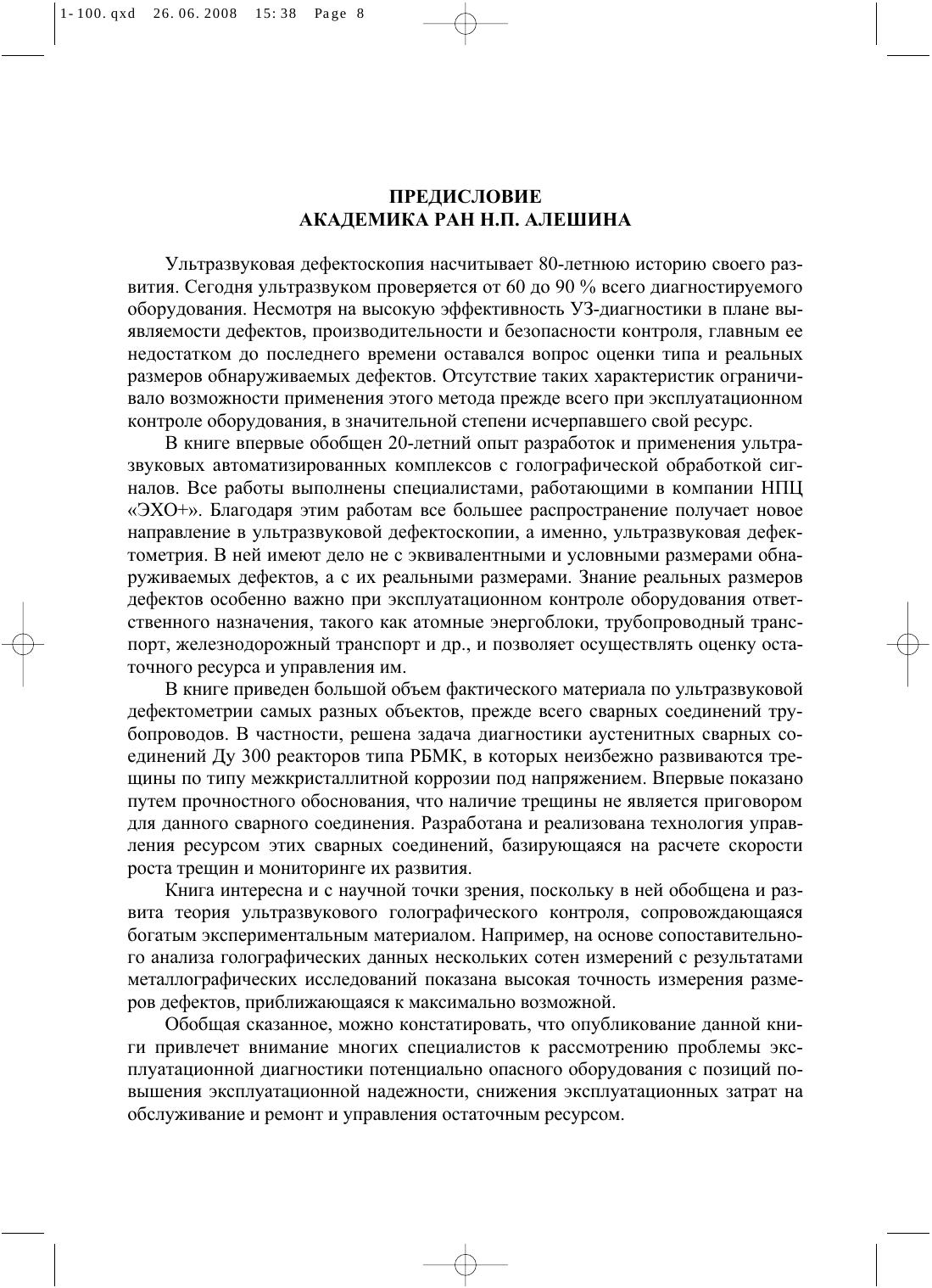 Рассмотрены вопросы теории и практики ультразвуковой дефектометрии на основе алгоритмов цифровой акустической голографии применительно к эксплуатации объектов повышенной опасности. Приведены особенности различных алгоритмов получения когерентного изображения, в том числе проекции в спектральном пространстве, угловых спектров, эталонной голограммы и др. Достаточно подробно описана разработанная аппаратура серии «Авгур» и ее модификации применительно к различным объектам контроля. Показано, что информация о типе и размерах дефектов, получаемая при голографическом контроле, достаточна для оценки остаточного ресурса объекта. На основе результатов многочисленных металлографических исследований оценена погрешность измерения размеров дефектов, которая составляет ±1,5 мм. Приводится более чем 10-летний опыт применения систем серии «Авгур», прежде всего на объектах атомной энергетики сформулированы признаки типов дефектов и алгоритмы автоматического определения их параметров. Разработаны методические основы голографического контроля широкого круга сварных соединений, которые позволили создать и аттестовать 13 специализированных методик. Представляют интерес системы для диагностики колесных пар железнодорожных вагонов, использующие цифровую акустическую голографию, в которых применена специально разработанная программа определения остаточного ресурса. Описаны перспективные методы повышения разрешающей способности и качества изображений дефектов. Предназначена для разработчиков и специалистов в области диагностики и эксплуатации объектов повышенной опасности, для центров подготовки специалистов в области неразрушающего контроля.