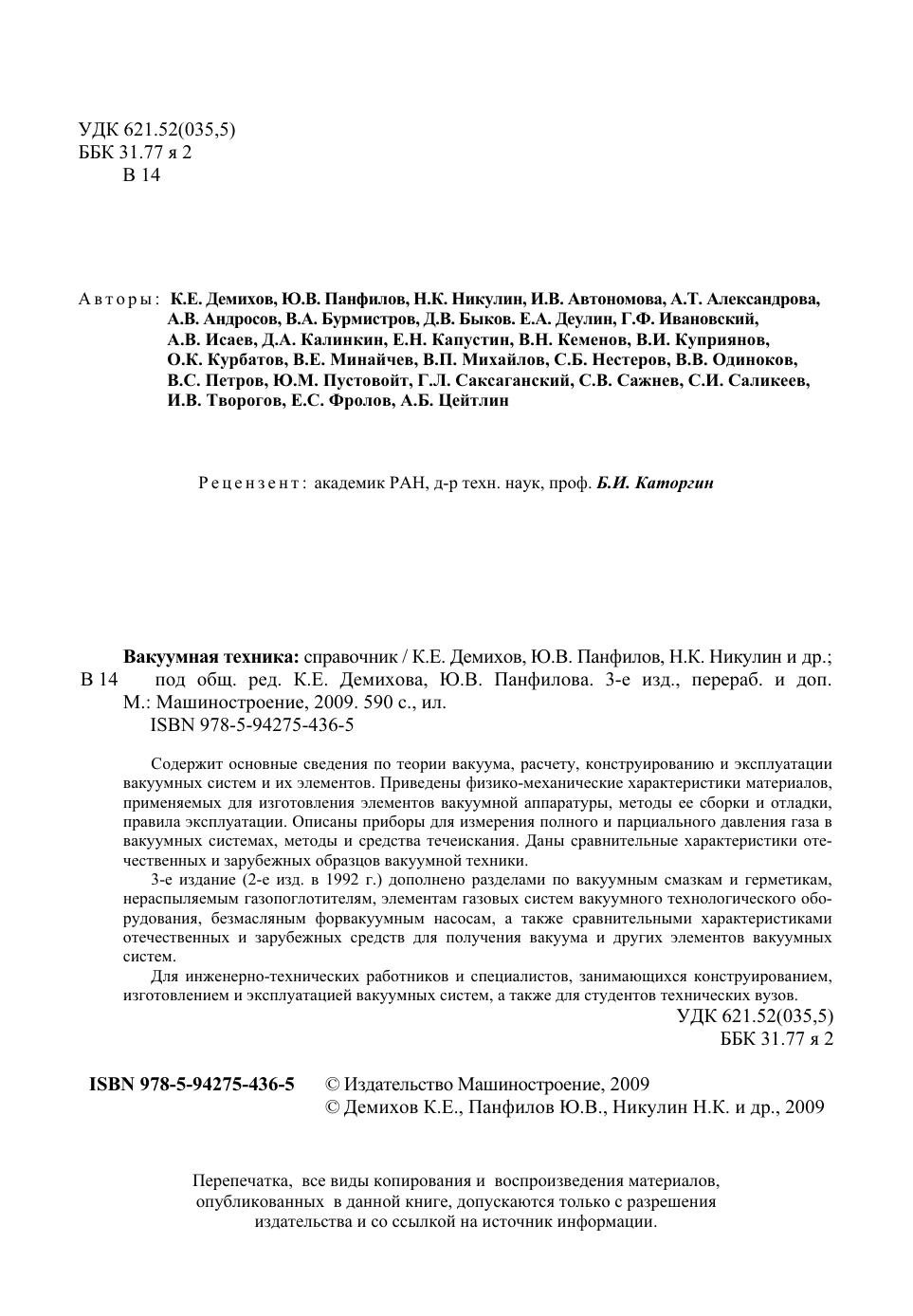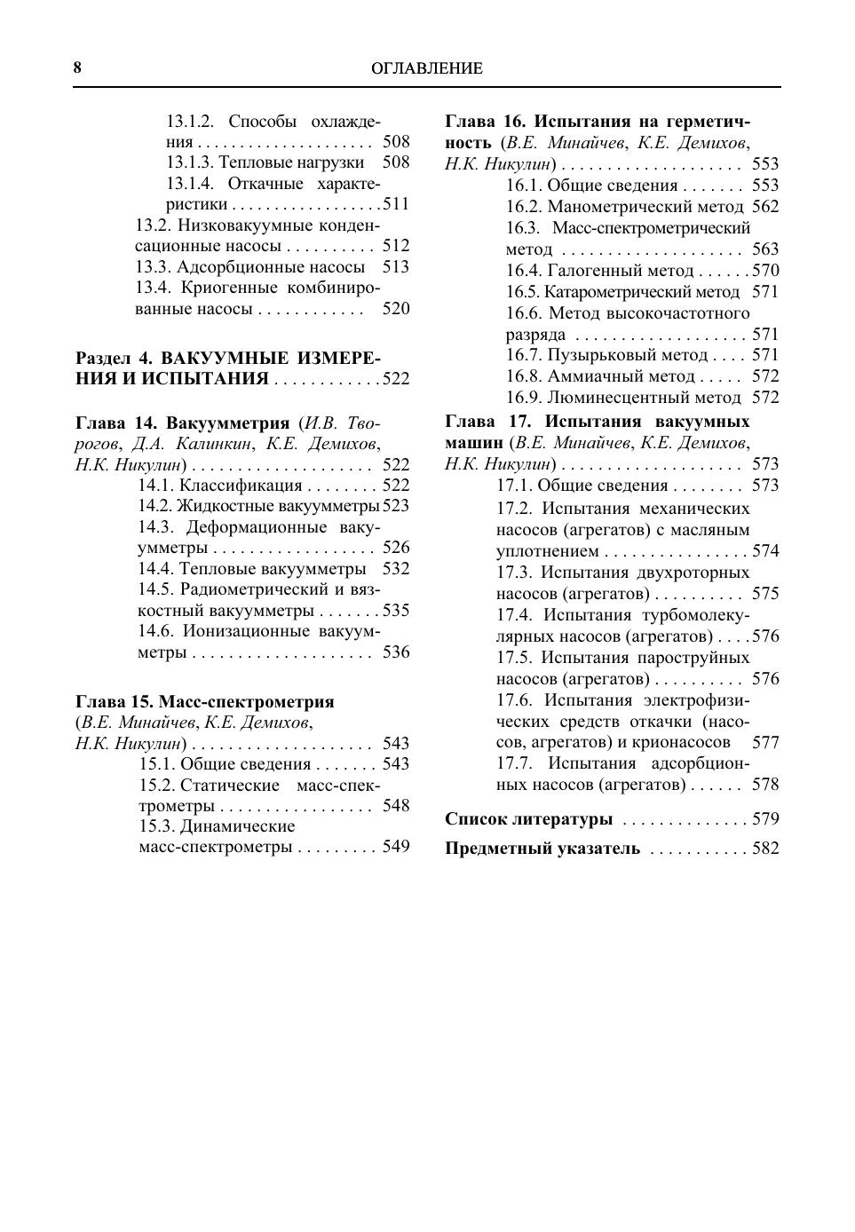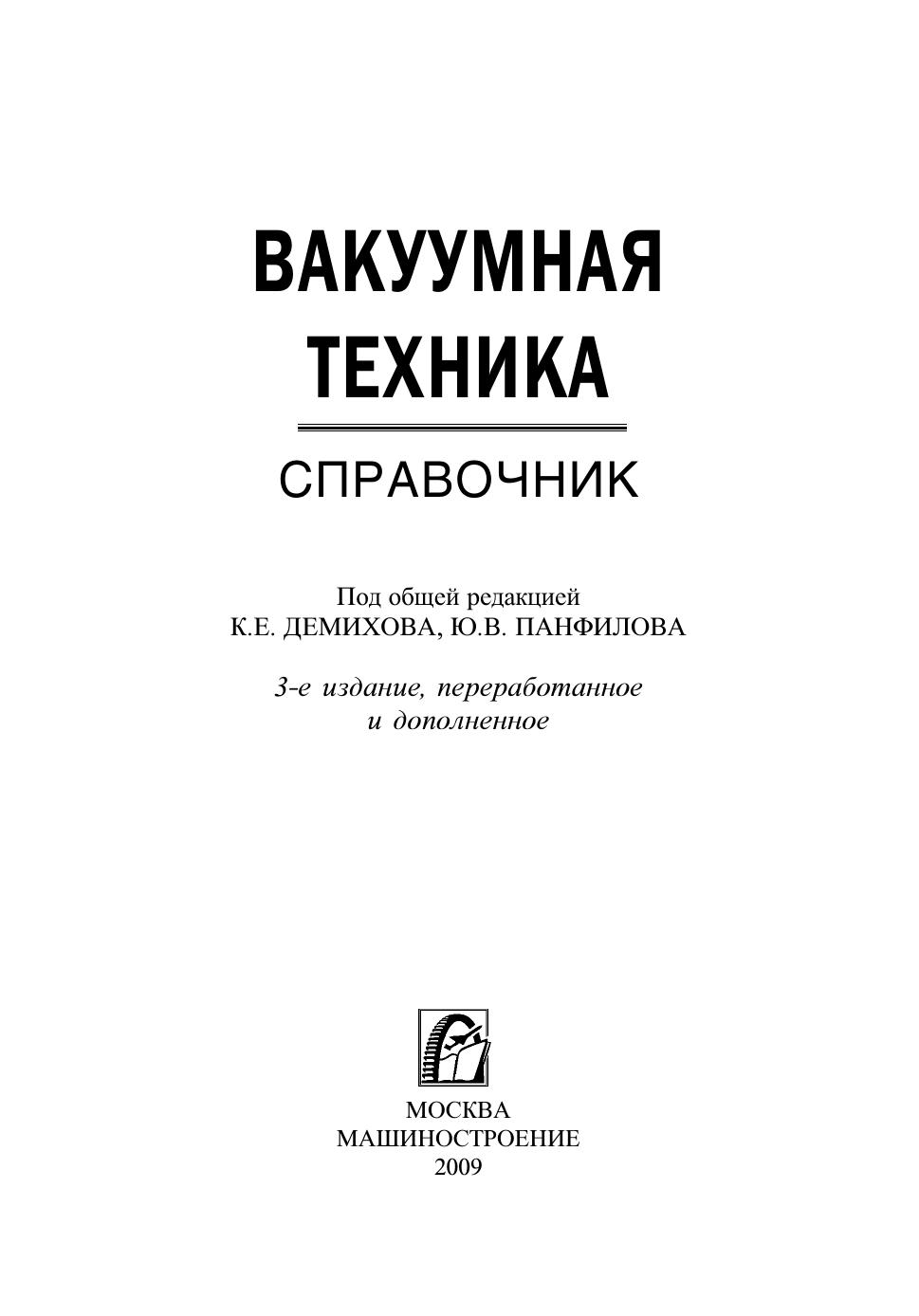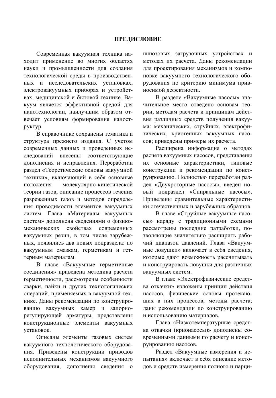 Содержит основные сведения по теории вакуума, расчету, конструированию и эксплуатации вакуумных систем и их элементов. Приведены физико-механические характеристики материалов, применяемых для изготовления элементов вакуумной аппаратуры, методы ее сборки и отладки, правила эксплуатации. Описаны приборы для измерения полного и парциального давления газа в вакуумных системах, методы и средства течеискания. Даны сравнительные характеристики отечественных и зарубежных образцов вакуумной техники. 3-е издание (2-е изд. в 1992 г.) дополнено разделами по вакуумным смазкам и герметикам, нераспыляемым газопоглотителям, элементам газовых систем вакуумного технологического оборудования, безмасляным форвакуумным насосам, а также сравнительными характеристиками отечественных и зарубежных средств для получения вакуума и других элементов вакуумных систем. Для инженерно-технических работников и специалистов, занимающихся конструированием, изготовлением и эксплуатацией вакуумных систем, а также для студентов технических вузов.