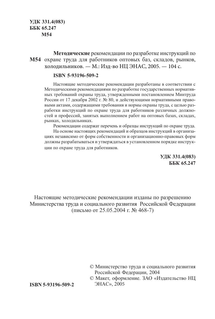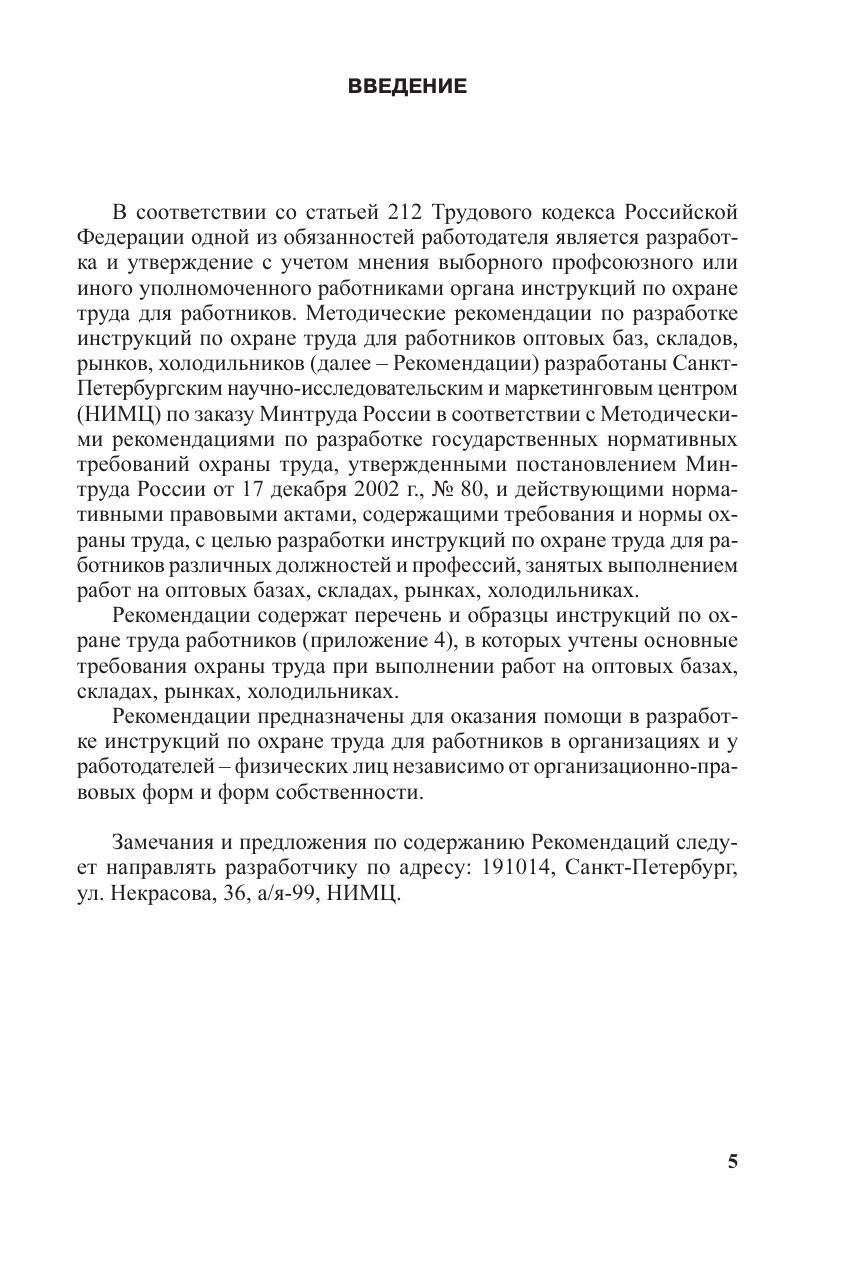 Настоящие методические рекомендации разработаны в соответствии с Методическими рекомендациями по разработке государственных нормативных требований охраны труда, утвержденными постановлением Минтруда России от 17 декабря 2002 г. № 80, и действующими нормативными правовыми актами, содержащими требования и нормы охраны труда, с целью разработки инструкций по охране труда для работников различных должностей и профессий, занятых выполнением работ на оптовых базах, складах, рынках, холодильниках. Рекомендации содержат перечень и образцы инструкций по охране труда. На основе настоящих рекомендаций и образцов инструкций в организациях независимо от форм собственности и организационно-правовых форм должны разрабатываться и утверждаться в установленном порядке инструкции по охране труда для работников.