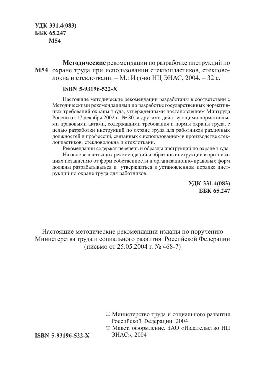 Настоящие методические рекомендации разработаны в соответствии с Методическими рекомендациями по разработке государственных нормативных требований охраны труда, утвержденными постановлением Минтруда России от 17 декабря 2002 г. № 80, и другими действующими нормативными правовыми актами, содержащими требования и нормы охраны труда, с целью разработки инструкций по охране труда для работников различных должностей и профессий, связанных с использованием в производстве стеклопластиков, стекловолокна и стеклоткани. Рекомендации содержат перечень и образцы инструкций по охране труда. На основе настоящих рекомендаций и образцов инструкций в организациях независимо от форм собственности и организационно-правовых форм должны разрабатываться и утверждаться в установленном порядке инструкции по охране труда для работников.