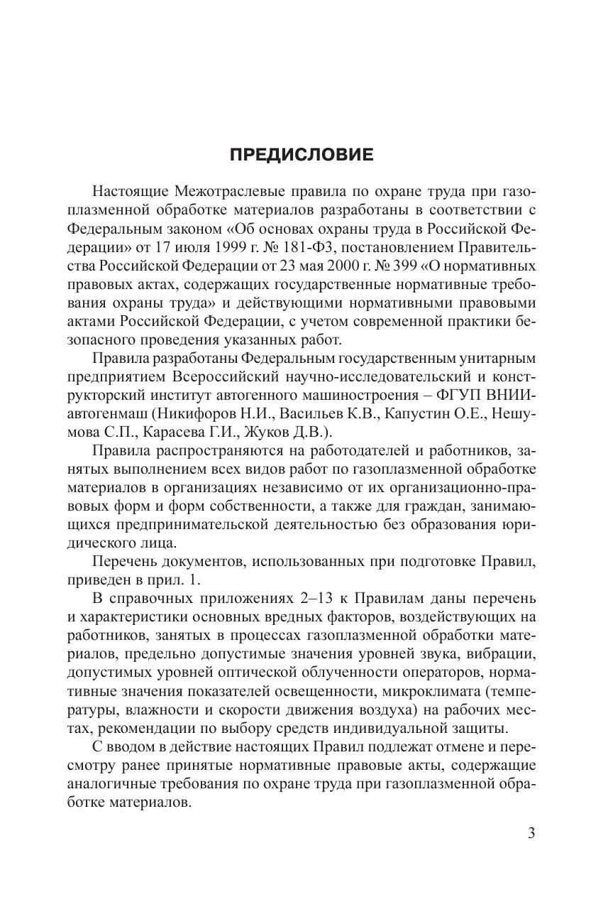 Межотраслевые правила по охране труда при газоплазменной обработке материалов (далее - Правила) разработаны в соответствии с Федеральным законом «Об основах охраны труда в Российской Федерации» от 17 июля 1999 г. № 181-ФЗ, постановлением Правительства Российской Федерации от 23 мая 2000 г. № З99 «О нормативных правовых актах, содержащих государственные нормативные требования охраны труда» и действующими нормативными правовыми актами Российской Федерации, с учетом современной практики безопасного проведения указанных работ.