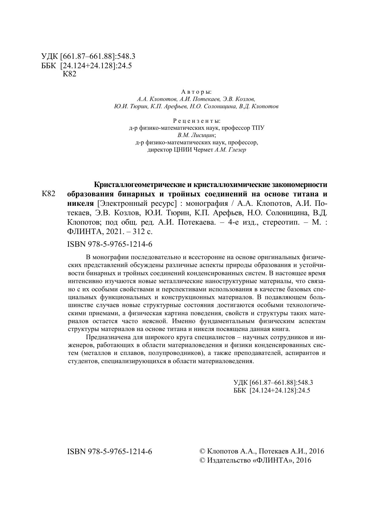 В монографии последовательно и всесторонне на основе оригинальных физических представлений обсуждены различные аспекты природы образования и устойчивости бинарных и тройных соединений конденсированных систем. В настоящее время интенсивно изучаются новые металлические наноструктурные материалы, что связано с их особыми свойствами и перспективами использования в качестве базовых специальных функциональных и конструкционных материалов. В подавляющем большинстве случаев новые структурные состояния достигаются особыми технологическими приемами, а физическая картина поведения, свойств и структуры таких материалов остается часто неясной. Именно фундаментальным физическим аспектам структуры материалов на основе титана и никеля посвящена данная книга. Предназначена для широкого круга специалистов – научных сотрудников и инженеров, работающих в области материаловедения и физики конденсированных систем (металлов и сплавов, полупроводников), а также преподавателей, аспирантов и студентов, специализирующихся в области материаловедения.