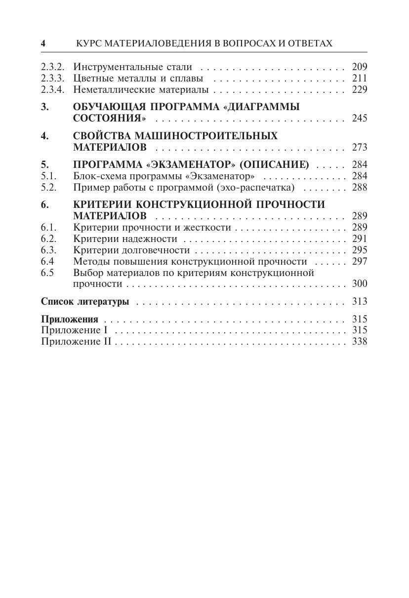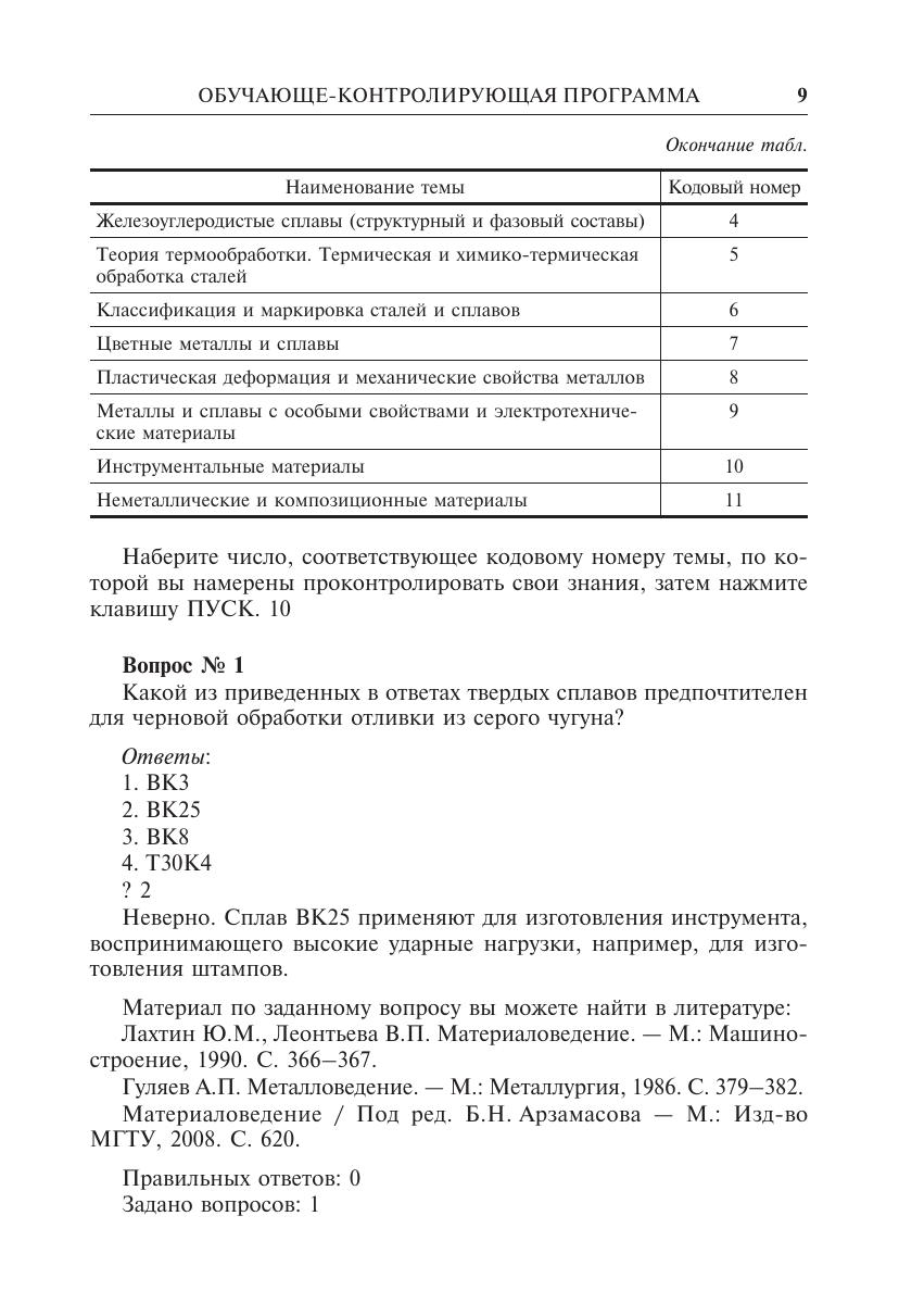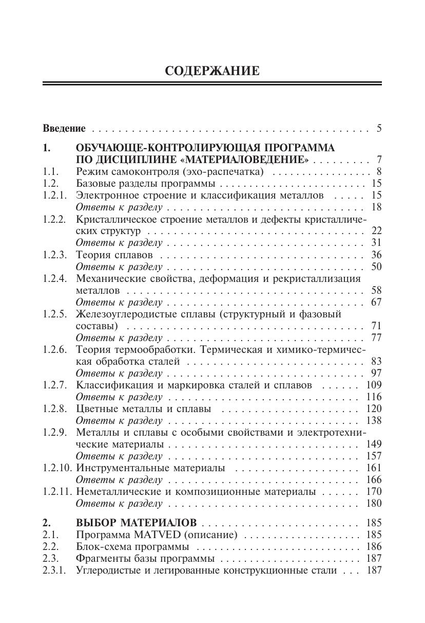 Пособие состоит из шести разделов. В каждом содержатся сведения из соответствующей области материаловедения. В первом приведены вопросы-тесты. Тесты содержат по четыре альтернативных ответа. В конце каждого раздела приведены ответы. Второй раздел пособия содержит справочные сведения по углеродистым и легированным конструкционным сталям, инструментальным сталям, цветным металлам и сплавам (марочные обозначения, химический состав, некоторые свойства, режимы термической обработки), неметаллическим материалам. Может использоваться при решении задач первой части и как самостоятельное пособие для подбора материалов при выполнении курсовых и дипломных работ. В третьем разделе приведены фрагменты, имитирующие эхо-распечатки обучающей программы «Диаграммы состояния». В четвертом разделе приведены основные свойства машиностроительных материалов. Пятый раздел содержит материалы по программе «Экзаменатор».