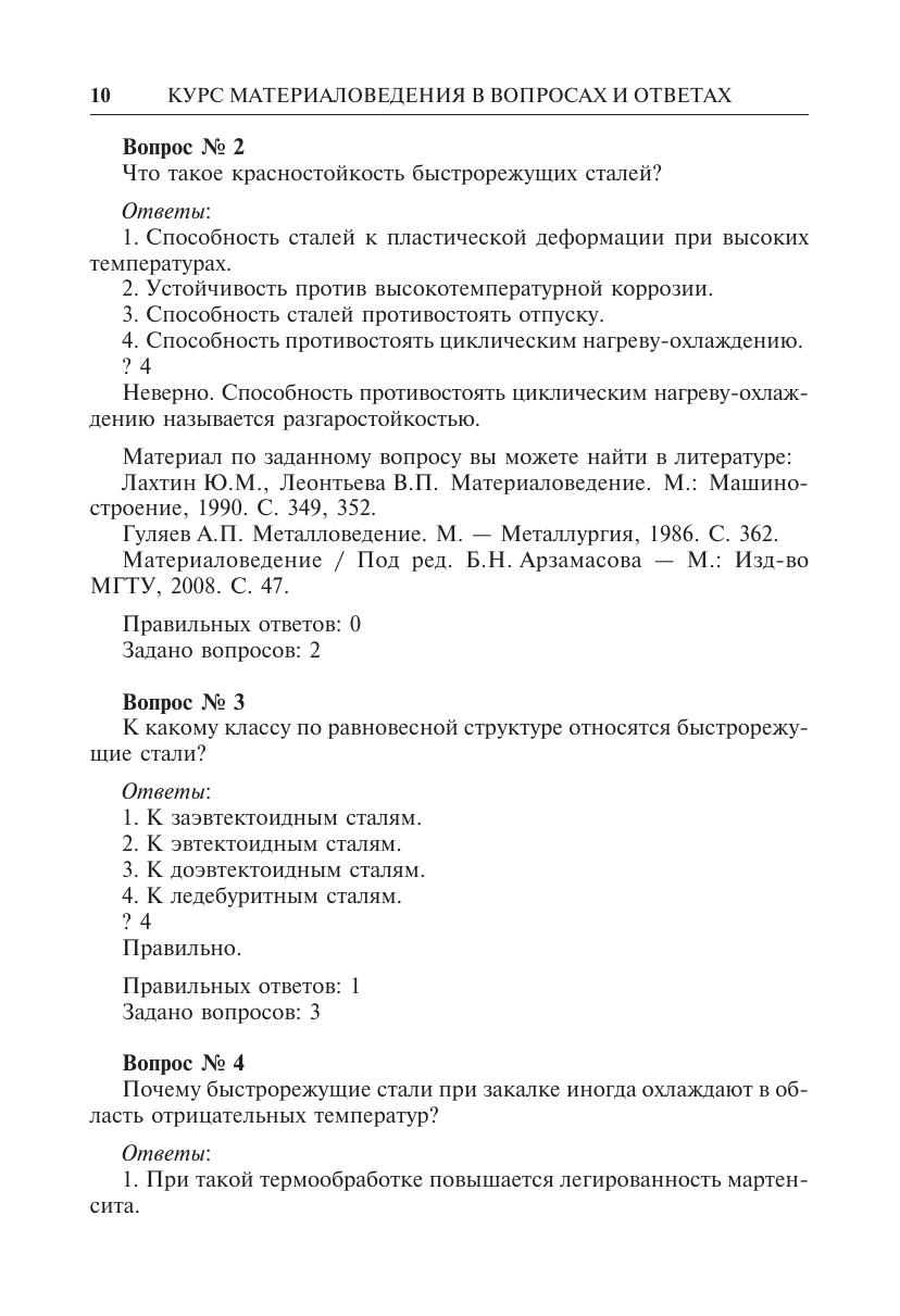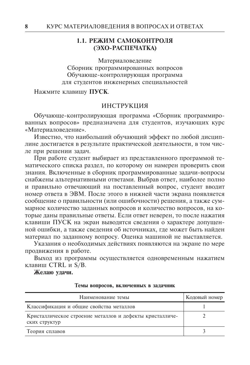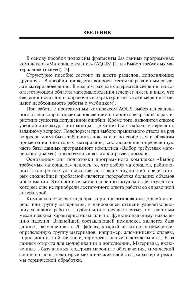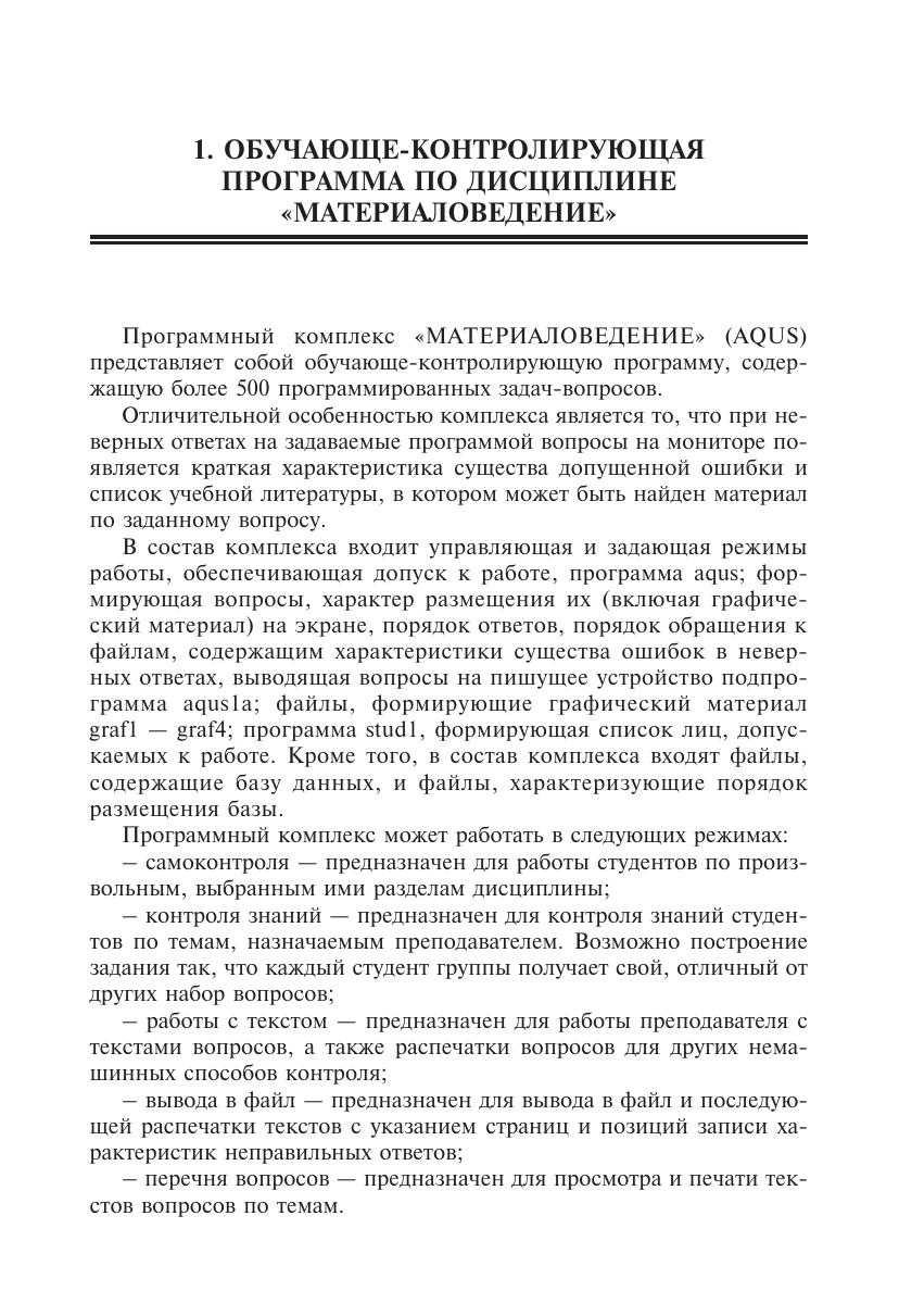 Пособие состоит из шести разделов. В каждом содержатся сведения из соответствующей области материаловедения. В первом приведены вопросы-тесты. Тесты содержат по четыре альтернативных ответа. В конце каждого раздела приведены ответы. Второй раздел пособия содержит справочные сведения по углеродистым и легированным конструкционным сталям, инструментальным сталям, цветным металлам и сплавам (марочные обозначения, химический состав, некоторые свойства, режимы термической обработки), неметаллическим материалам. Может использоваться при решении задач первой части и как самостоятельное пособие для подбора материалов при выполнении курсовых и дипломных работ. В третьем разделе приведены фрагменты, имитирующие эхо-распечатки обучающей программы «Диаграммы состояния». В четвертом разделе приведены основные свойства машиностроительных материалов. Пятый раздел содержит материалы по программе «Экзаменатор».