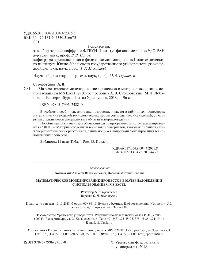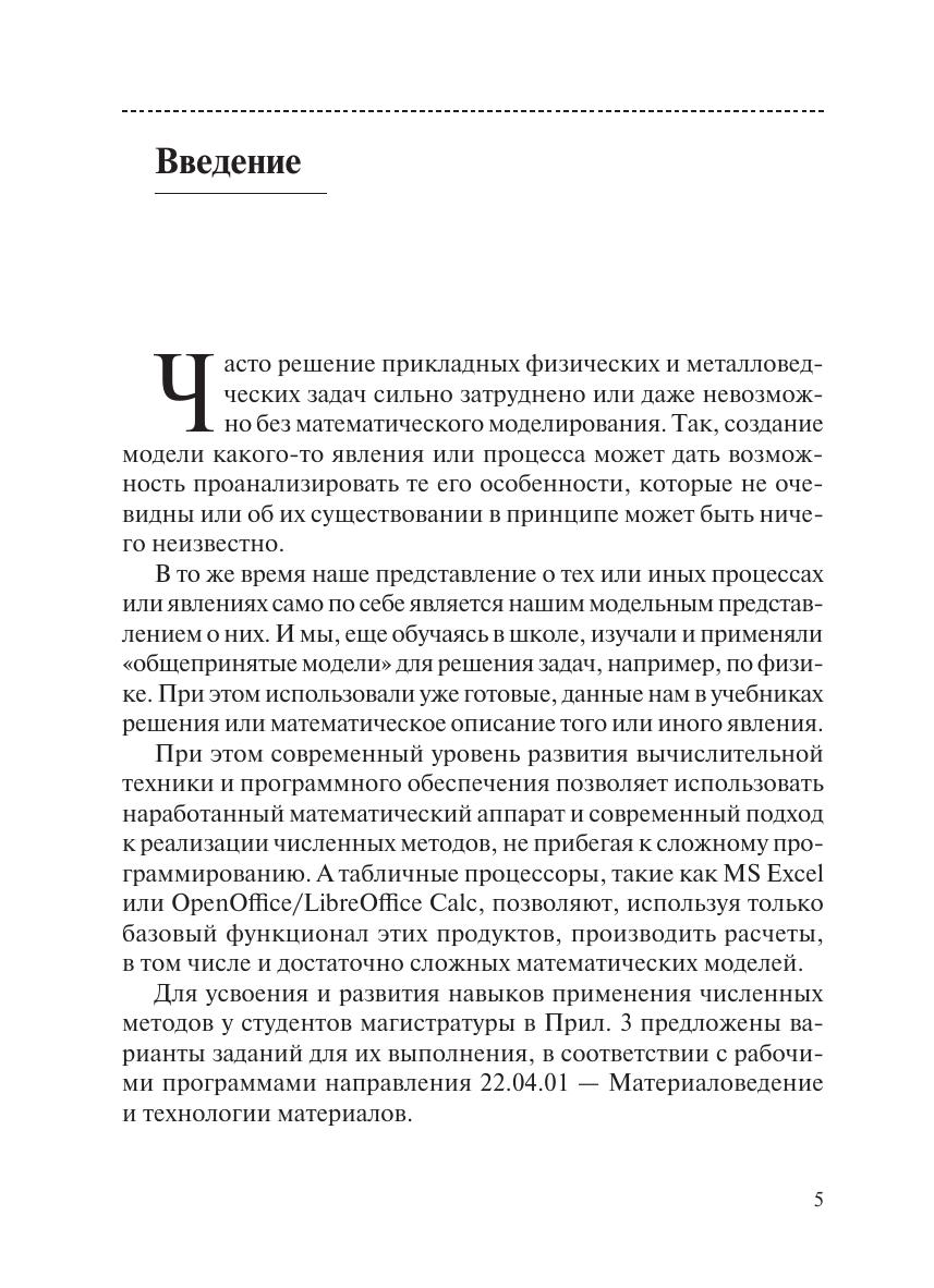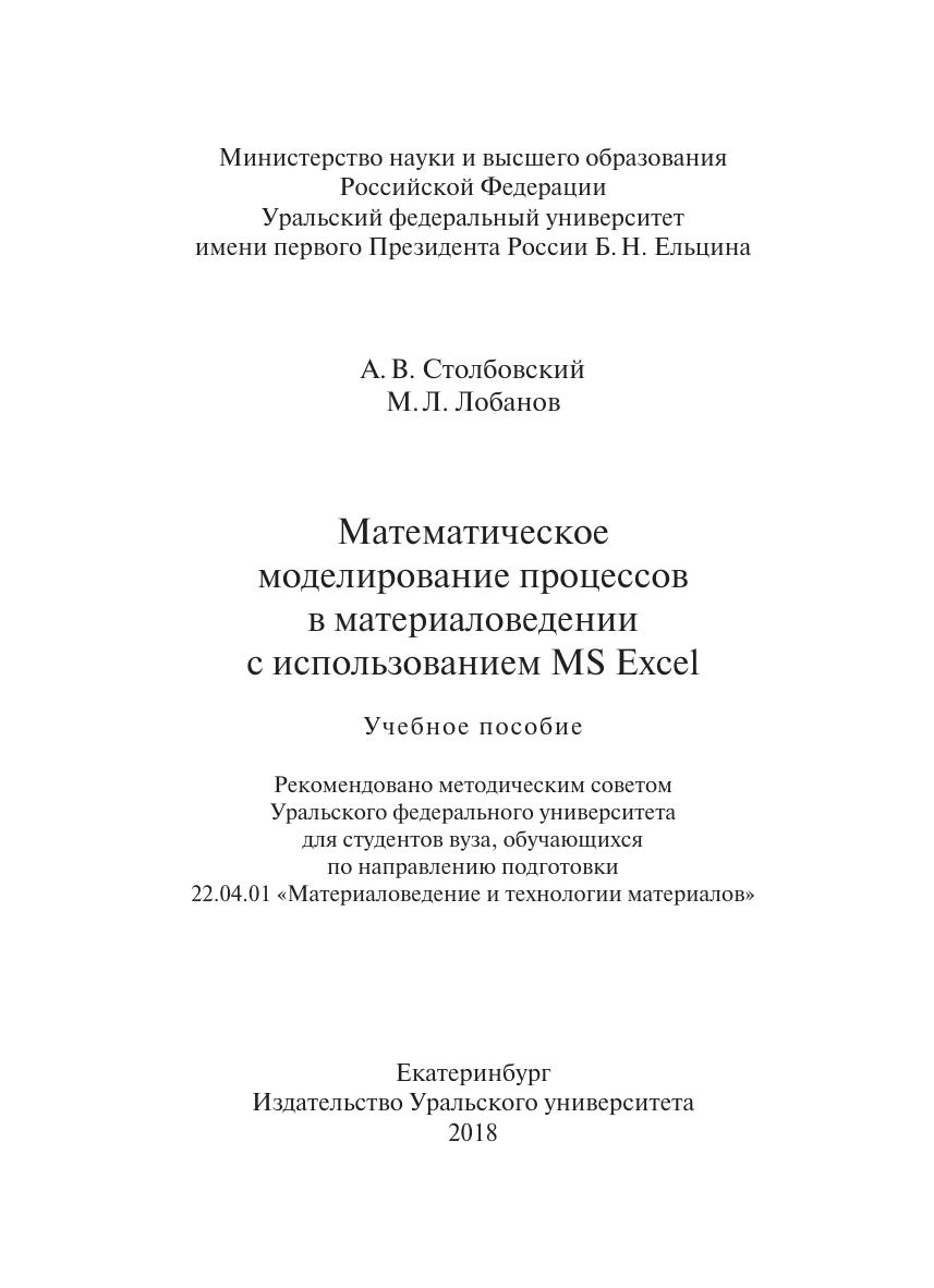 В учебном пособии рассмотрены построение и расчет в табличных процессорах математических моделей технологических процессов и физических явлений, с которыми сталкиваются специалисты в области материаловедения. Пособие предназначено для обучающихся по программе магистратуры направления 22.04.01 — Материаловедение и технологии материалов, а также аспирантов и инженерно-технических работников, занимающихся вопросами моделирования технологических процессов.
