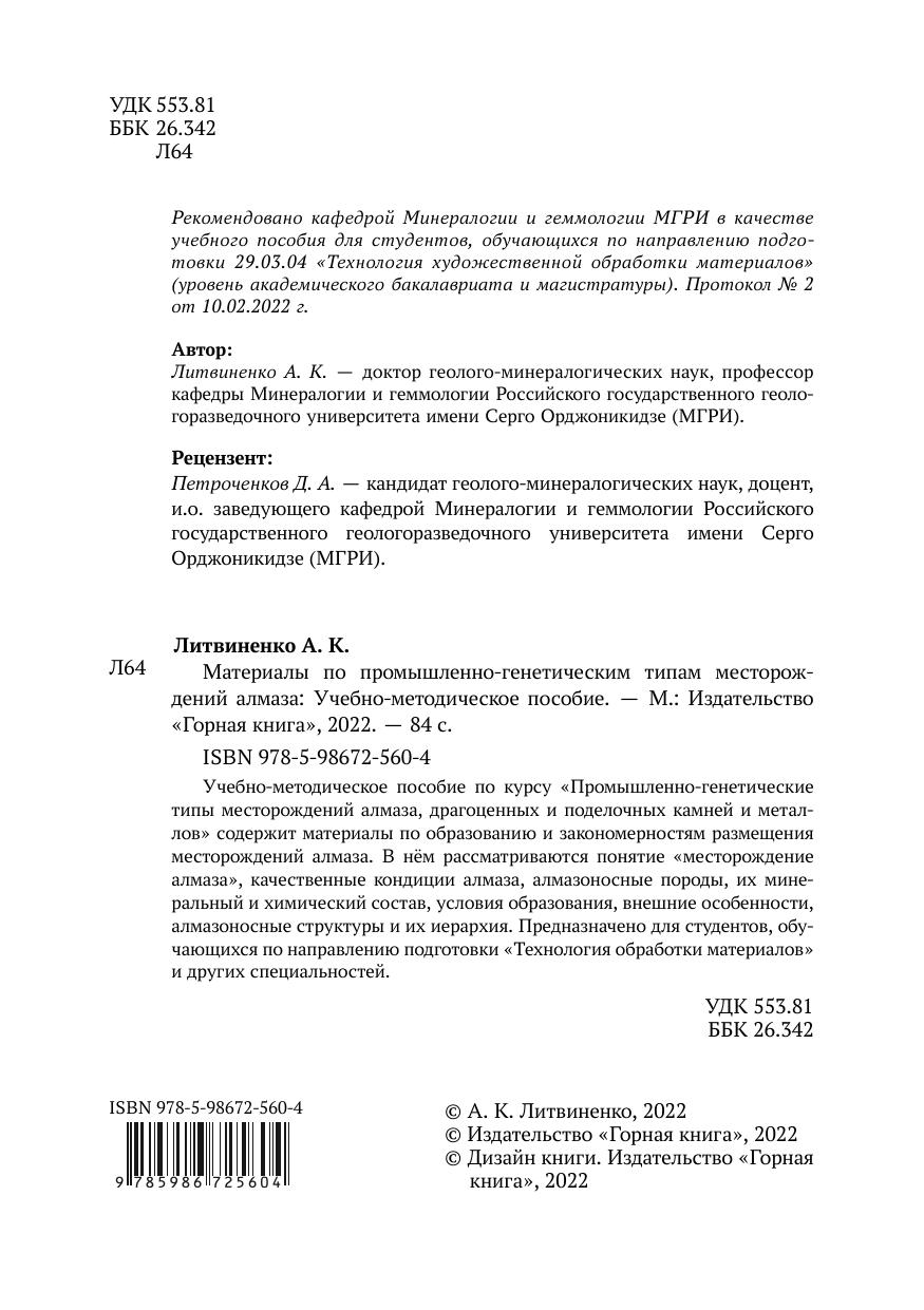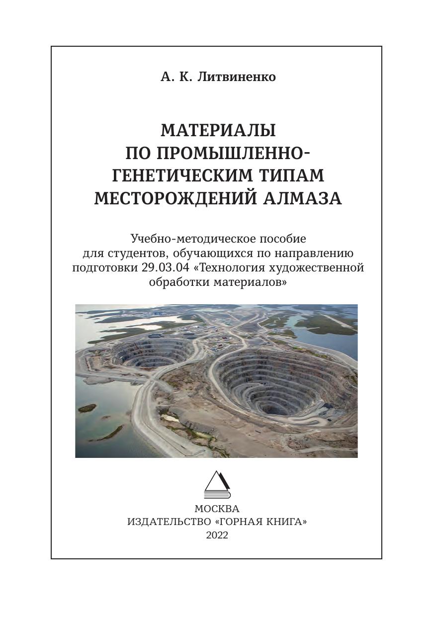 Учебно-методическое пособие по курсу «Промышленно-генетические типы месторождений алмаза, драгоценных и поделочных камней и металлов» содержит материалы по образованию и закономерностям размещения месторождений алмаза. В нём рассматриваются понятие «месторождение алмаза», качественные кондиции алмаза, алмазоносные породы, их минеральный и химический состав, условия образования, внешние особенности, алмазоносные структуры и их иерархия. Предназначено для студентов, обучающихся по направлению подготовки «Технология обработки материалов» и других специальностей.