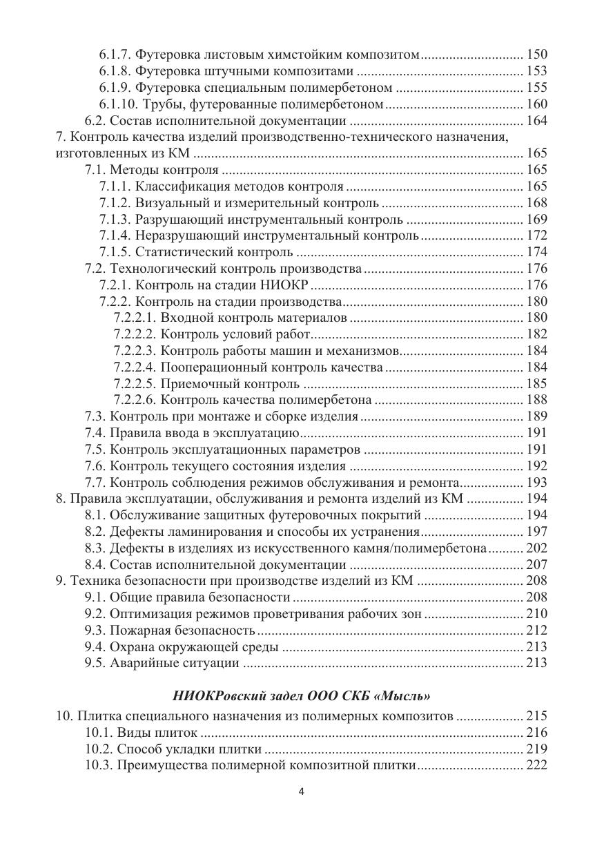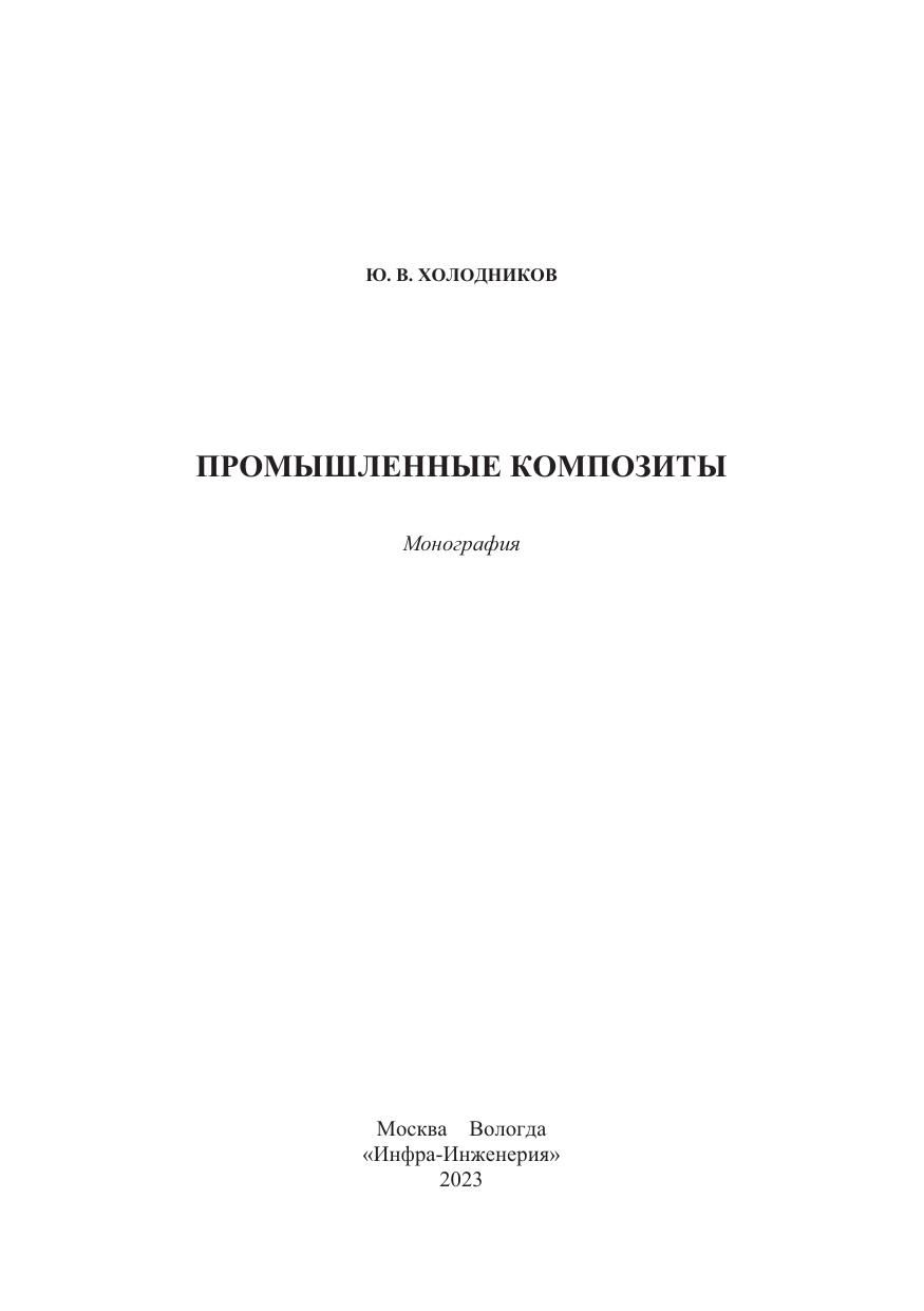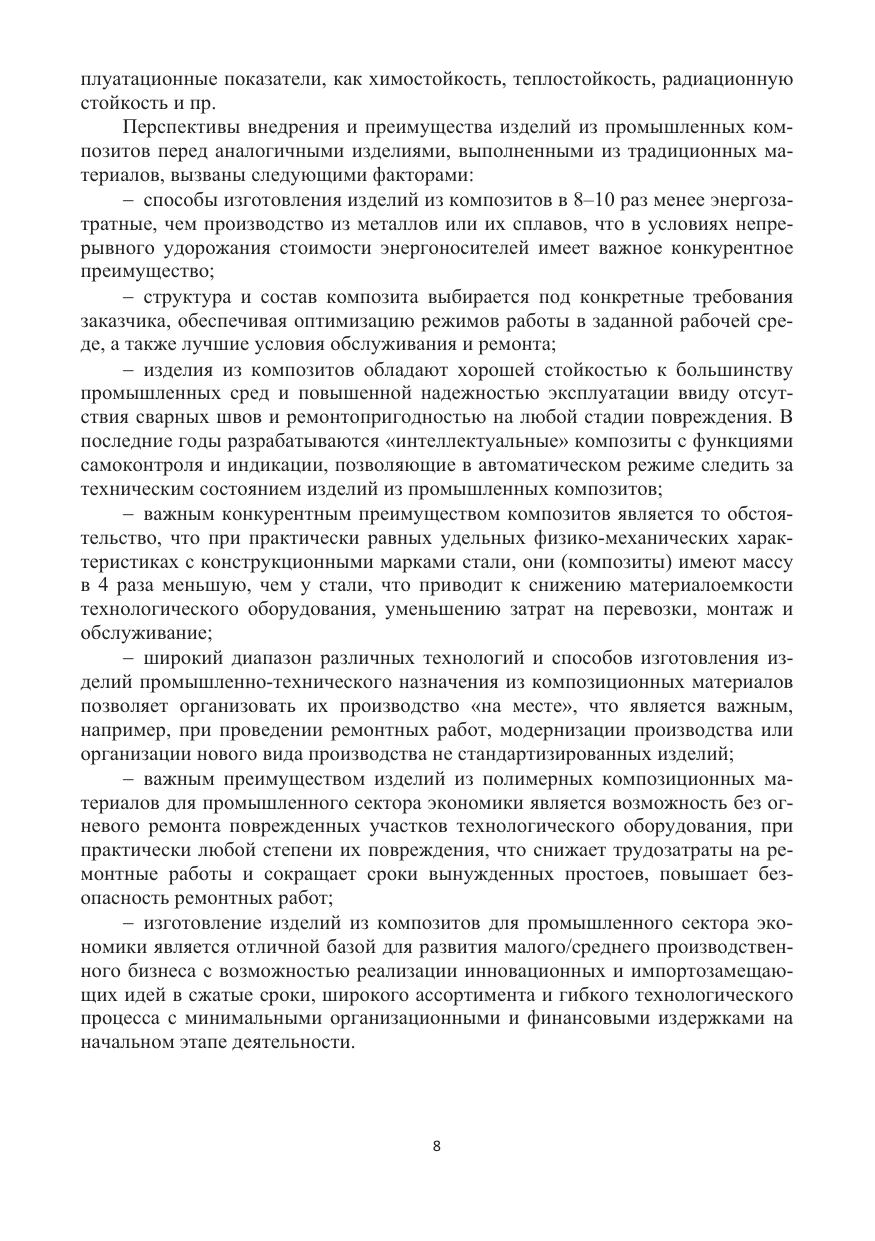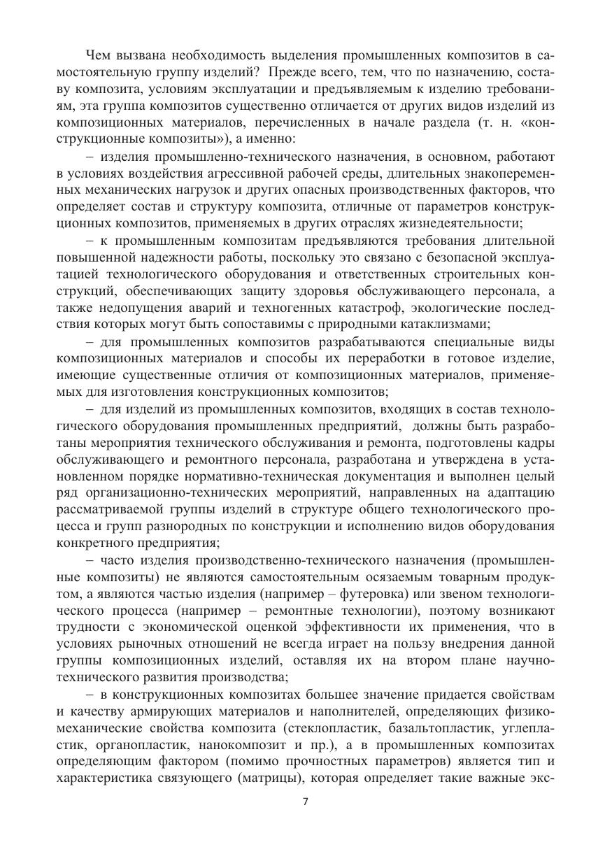 Дано и обосновано понятие «промышленные композиты» как самостоятельное направление развития отрасли производства изделий из композиционных материалов с полимерной матрицей. Рассмотрены материалы для производства промышленных композитов, способы производства, области применения и особенности эксплуатации. Приведены результаты исследований и экспериментов по обозначенной теме. Большое внимание уделено вопросам контроля качества изделий, как на стадии производства, так и при эксплуатации в условиях воздействия агрессивной рабочей среды. Раскрыты разработанные на уровне изобретений способы производства, дано описание изделий производственно-технического назначения из специальных видов композитов, являющихся новыми видами промышленных изделий, соответствующих, а по ряду позиций, превосходящих мировой уровень качества продукции данного вида.