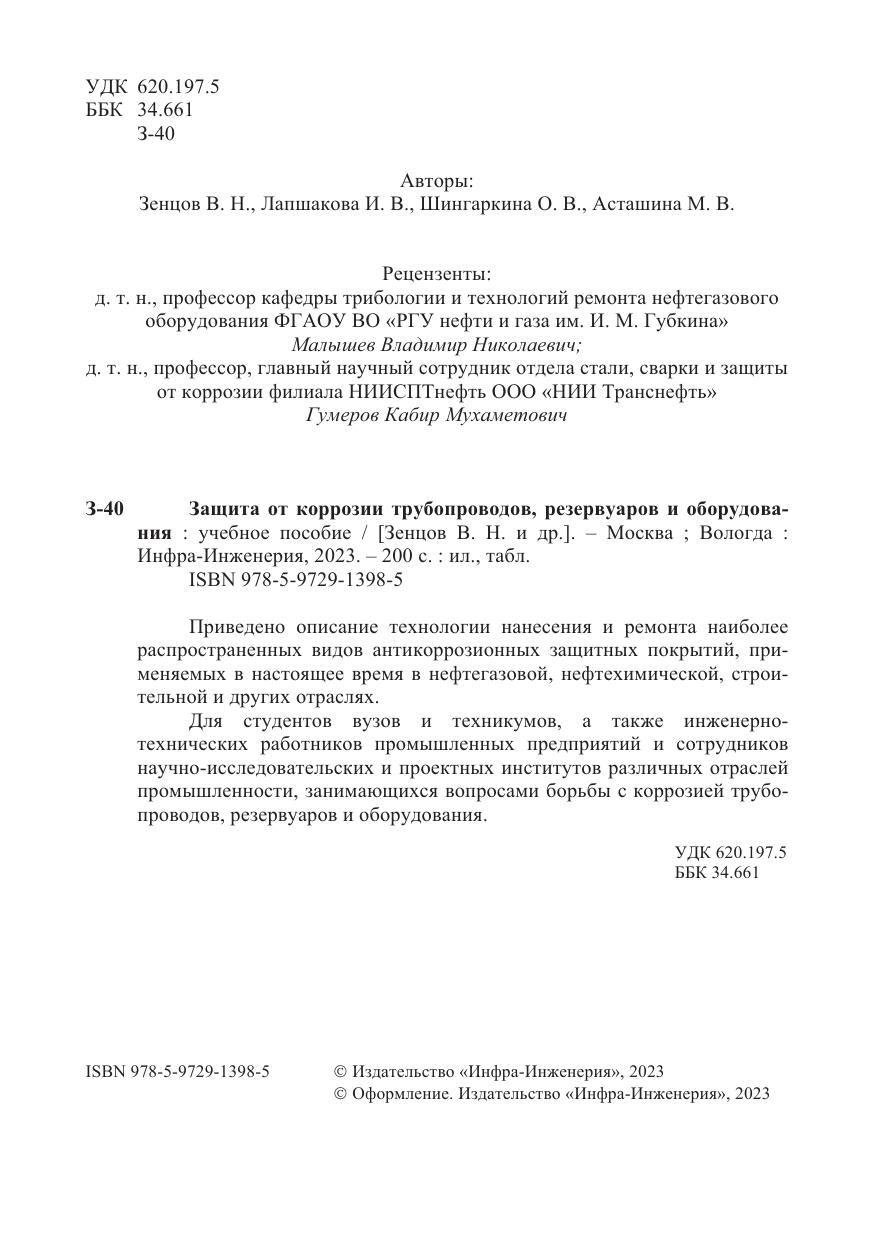 Для студентов вузов и техникумов, а также инженерно-технических работников промышленных предприятий и сотрудников научно-исследовательских и проектных институтов различных отраслей промышленности, занимающихся вопросами борьбы с коррозией трубопроводов, резервуаров и оборудования.