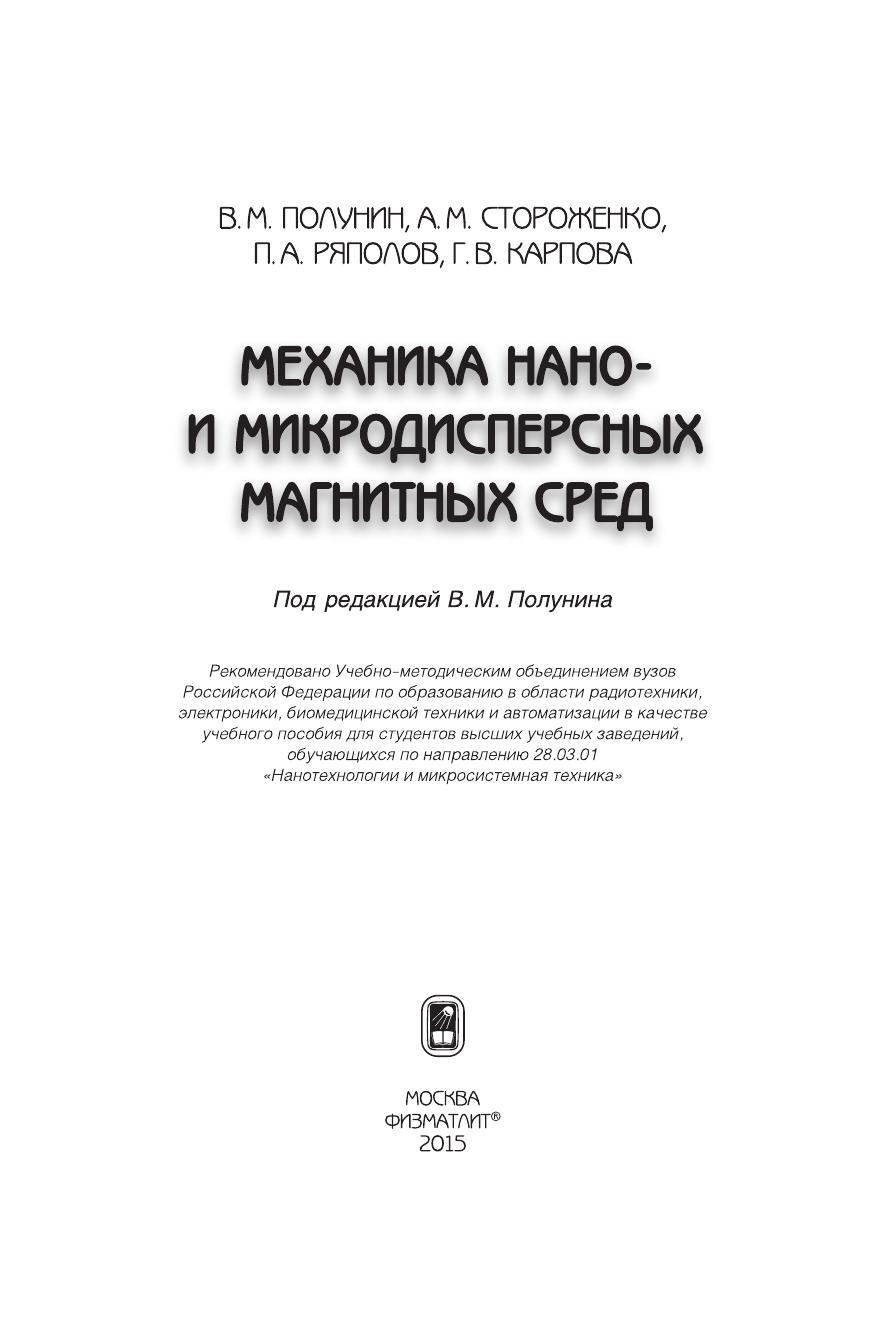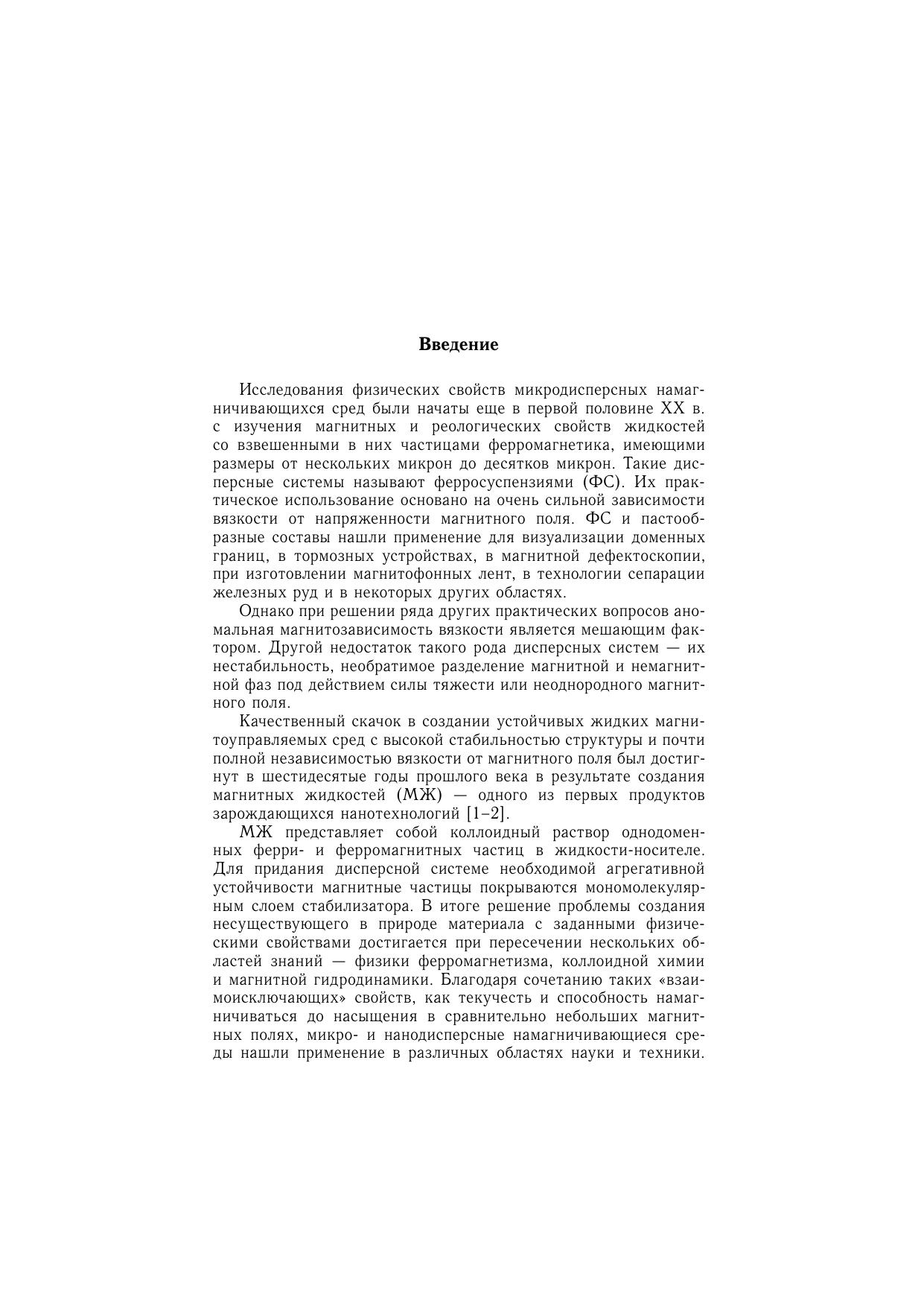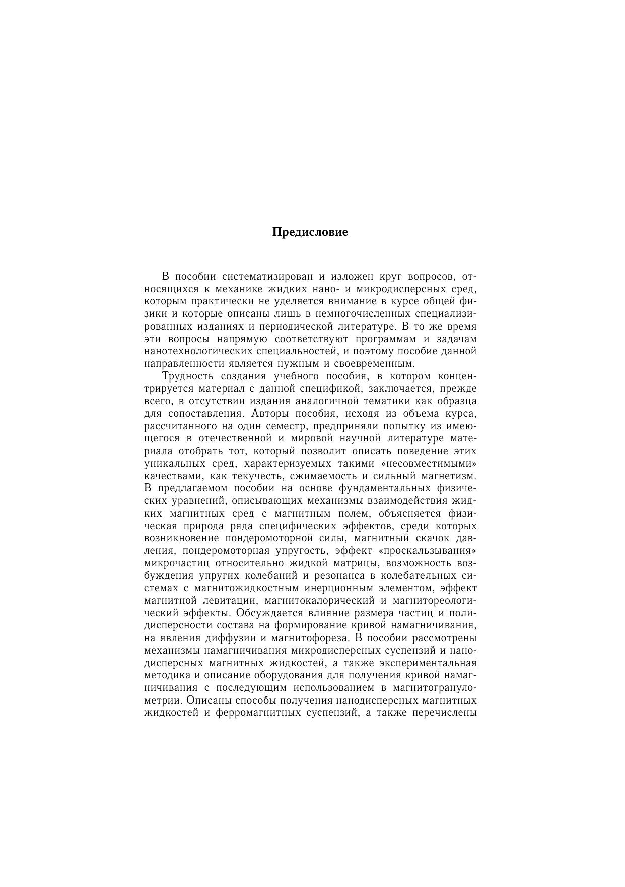 В учебном пособии изложен круг вопросов, относящихся к механике жидких нано- и микродисперсных магнитных сред. Этим вопросам практически не уделяется внимание в курсе общей физики, они описаны лишь в немногочисленных специализированных изданиях и периодической литературе. Приведены уравнения динамики жидких намагничивающихся сред и конкретные задачи с применением этих уравнений. Рассматриваются специфические для нано- и микроразмерных дисперсных систем физические явления: межфазный теплообмен, магнитокалорический эффект, «проскальзывание» нано- и микрочастиц относительно жидкой матрицы, гистерезис намагничивания микродисперсных суспензий, суперпарамагнетизм нанодисперсных магнитных жидкостей, неньютоновский характер реологии суспензий, диффузия и магнитофорез, магнитореологический эффект. Уделено внимание технологиям получения нано- и микродисперсных магнитных сред. На многочисленных примерах показано влияние размерного фактора на физические свойства материалов. Перечисленные вопросы полностью соответствуют программам и задачам нано- технологических специальностей.