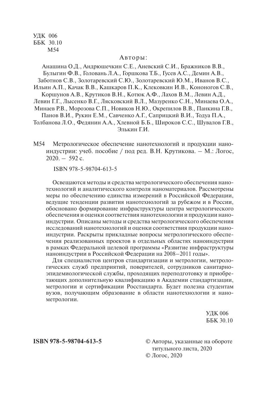 Освещаются методы и средства метрологического обеспечения нанотехнологий и аналитического контроля наноматериалов. Рассмотрены меры по обеспечению единства измерений в Российской Федерации, ведущие тенденции развития нанотехнологий за рубежом и в России, обосновано формирование инфраструктуры центра метрологического обеспечения и оценки соответствия нанотехнологии и продукции наноиндустрии. Описаны методы и средства метрологического обеспечения исследований нанотехнологий и оценки соответствия продукции наноиндустрии. Раскрыты прикладные вопросы метрологического обеспечения реализованных проектов в отдельных областях наноиндустрии в рамках Федеральной целевой программы «Развитие инфраструктуры наноиндустрии в Российской Федерации на 2008–2011 годы». Для специалистов центров стандартизации и метрологии, метрологических служб предприятий, поверителей, сотрудников санитарноэпидемиологической службы, проходящих переподготовку и приобретающих дополнительную квалификацию в Академии стандартизации, метрологии и сертификации Росстандарта. Будет полезна студентам вузов, получающим образование в области нанотехнологии и нанометрологии.