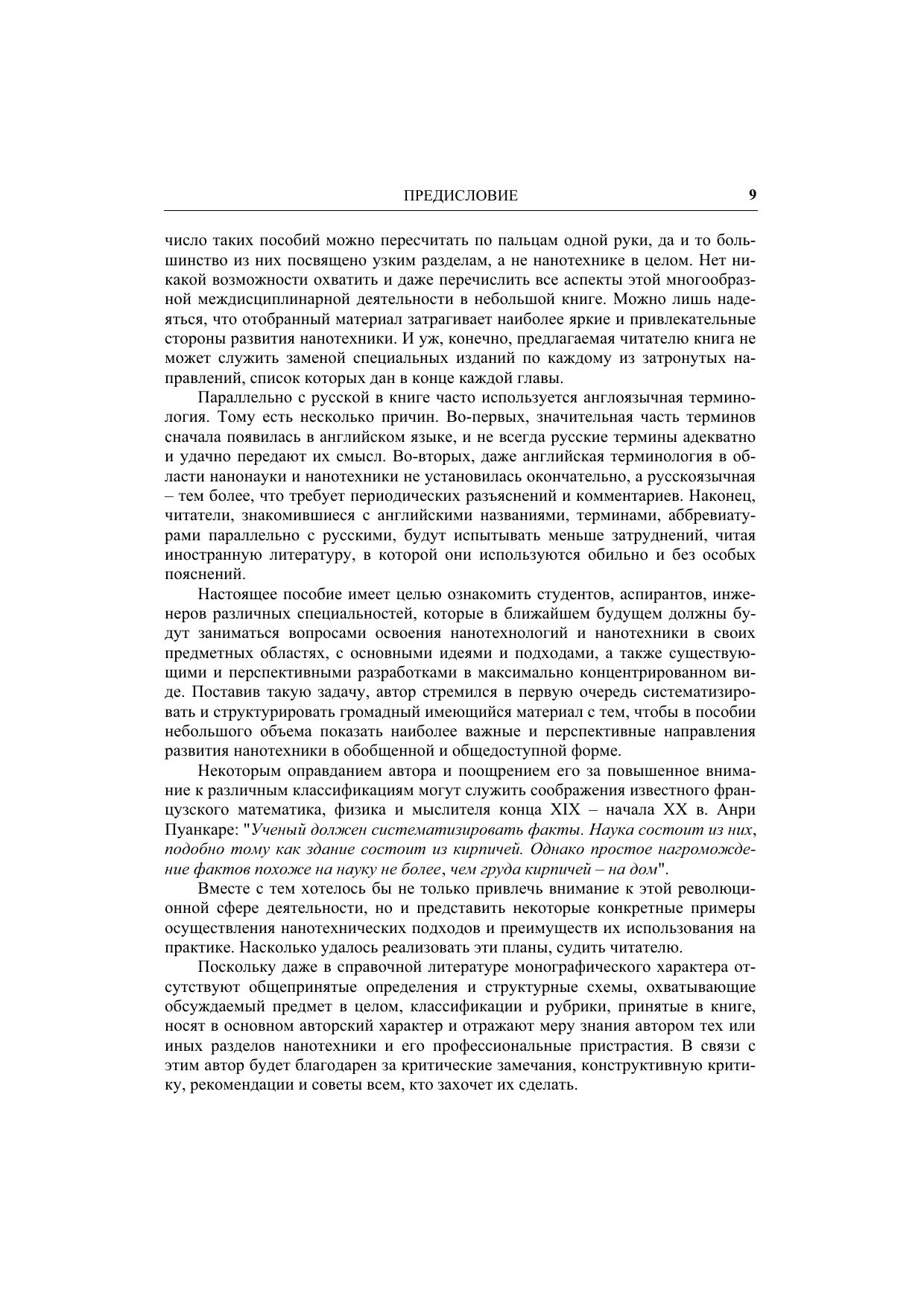 Кратко изложены термины, принципы, достижения и перспективы стремительно развивающейся области науки, техники и бизнеса – нанотехники и нанотехнологии. Представлены все важнейшие направления работ в этой сфере Параллельно с русской терминологией приведена англоязычная, так как, во-первых, часть терминов сначала появилась в английском языке и не всегда русские термины удачно передают их смысл. Во-вторых, даже английская терминология в области нанонауки не установилась окончательно, а русскоязычная тем более, что требует разъяснений и комментариев. Пособие имеет целью в общедоступной форме познакомить студентов, аспирантов, инженеров различных специальностей, которые должны заниматься вопросами освоения нанотехнологии и нанотехники в своих предметных областях, с основными идеями и подходами, а также существующими и перспективными разработками в максимально концентрированном виде.