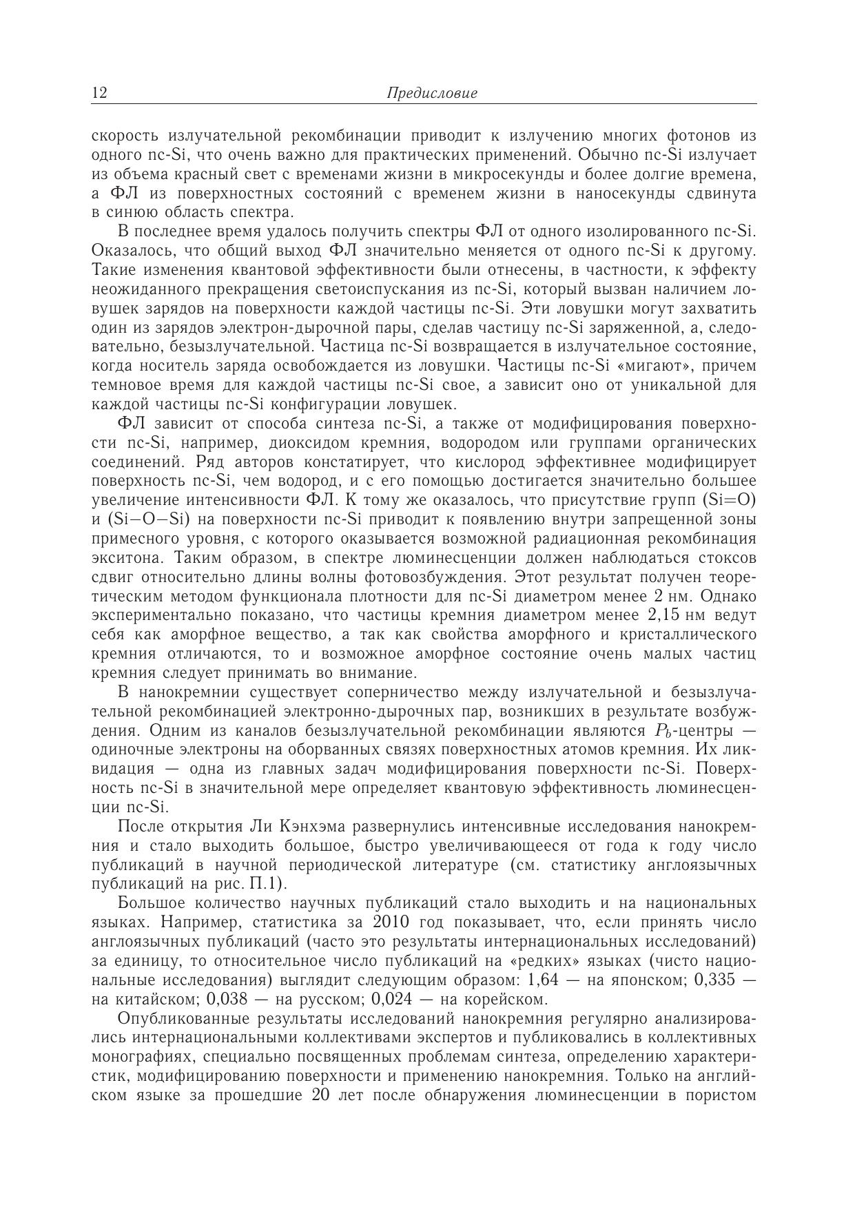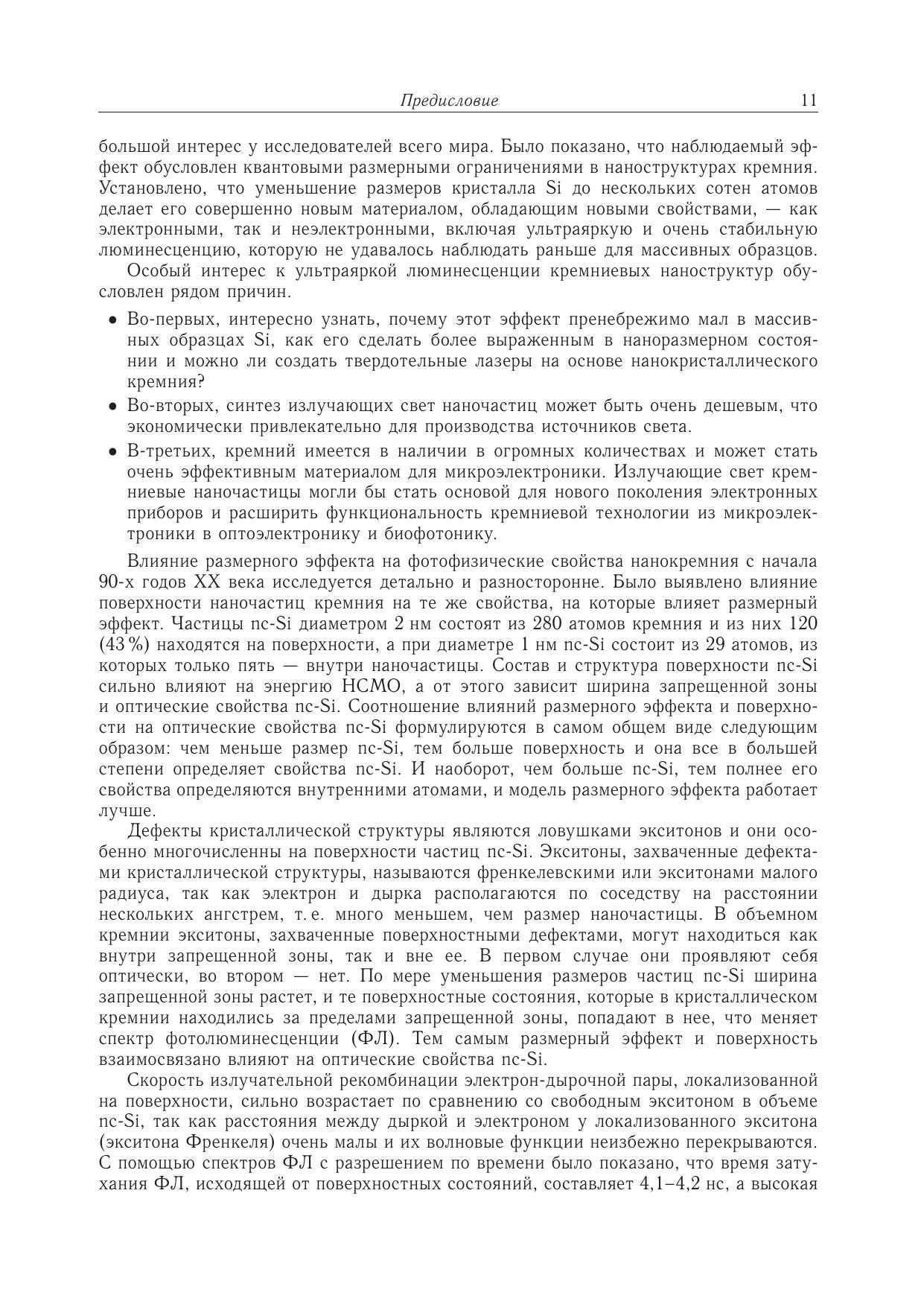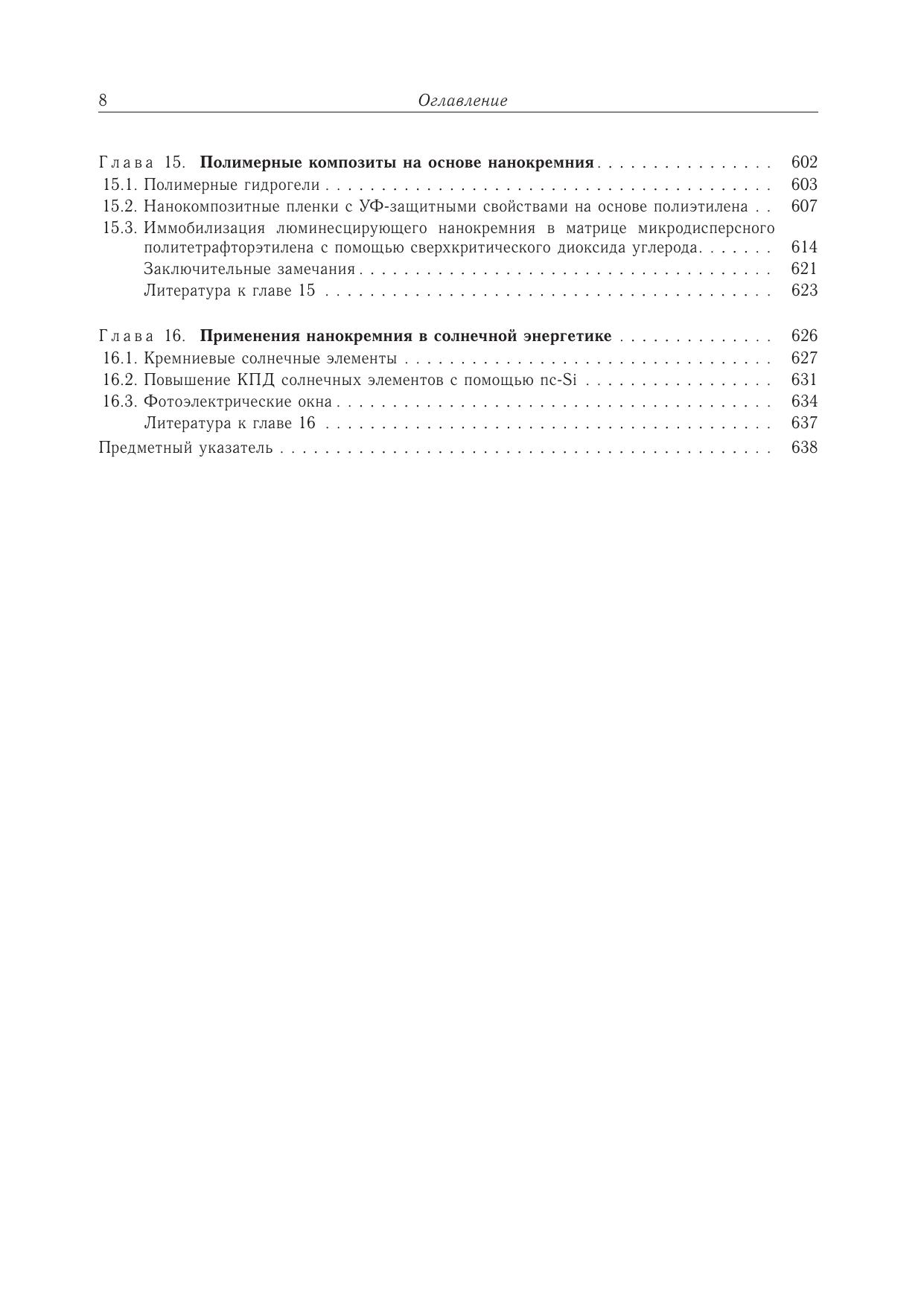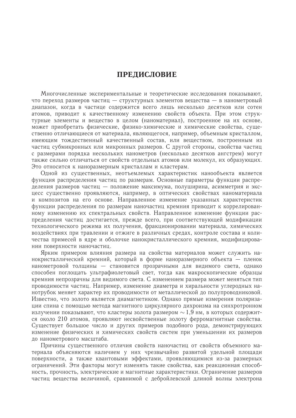 Монография посвящена систематическому изложению свойств, методов синтеза и возможностей применения пористого кремния, нанокремния и композитных материалов на их основе. Подробно изложены методы получения нанокристаллического кремния и проведен их сравнительный анализ. Описаны электронные и оптические свойства, современные методы исследования, позволяющие дать характеристику спектральных и структурных свойств этого материала, обладающего уникальными оптическими (поглощение излучения в УФ-области и фотолюминесценция в видимой области спектра) и электрофизическими свойствами. Значительное внимание уделяется различным областям практического применения: в УФ-защитных покрытиях, биоаналитике и солнечной энергетике. Представлены результаты исследований трансформации свойств наночастиц кремния в зависимости от химического состава примесей, появляющихся при синтезе и нахождении наночастиц в атмосфере воздуха. Описаны методы диагностики структуры, состава образующихся примесей и способы направленного модифицирования поверхности наночастиц кремния и функции их распределения по размерам.Монография рекомендуется широкому кругу читателей, интересующихся проблемами создания, исследования и применения наноматериалов, — научным работникам, аспирантам и студентам, специализирующимся в этой увлекательной и интенсивно развивающейся областисовременной науки.